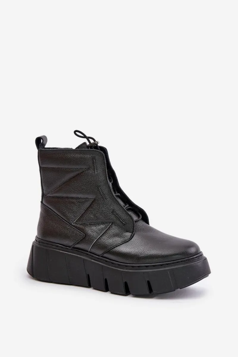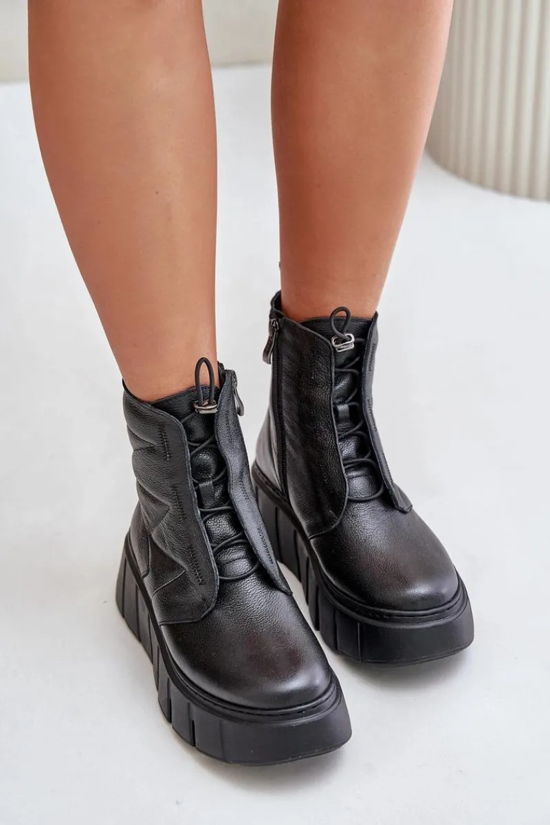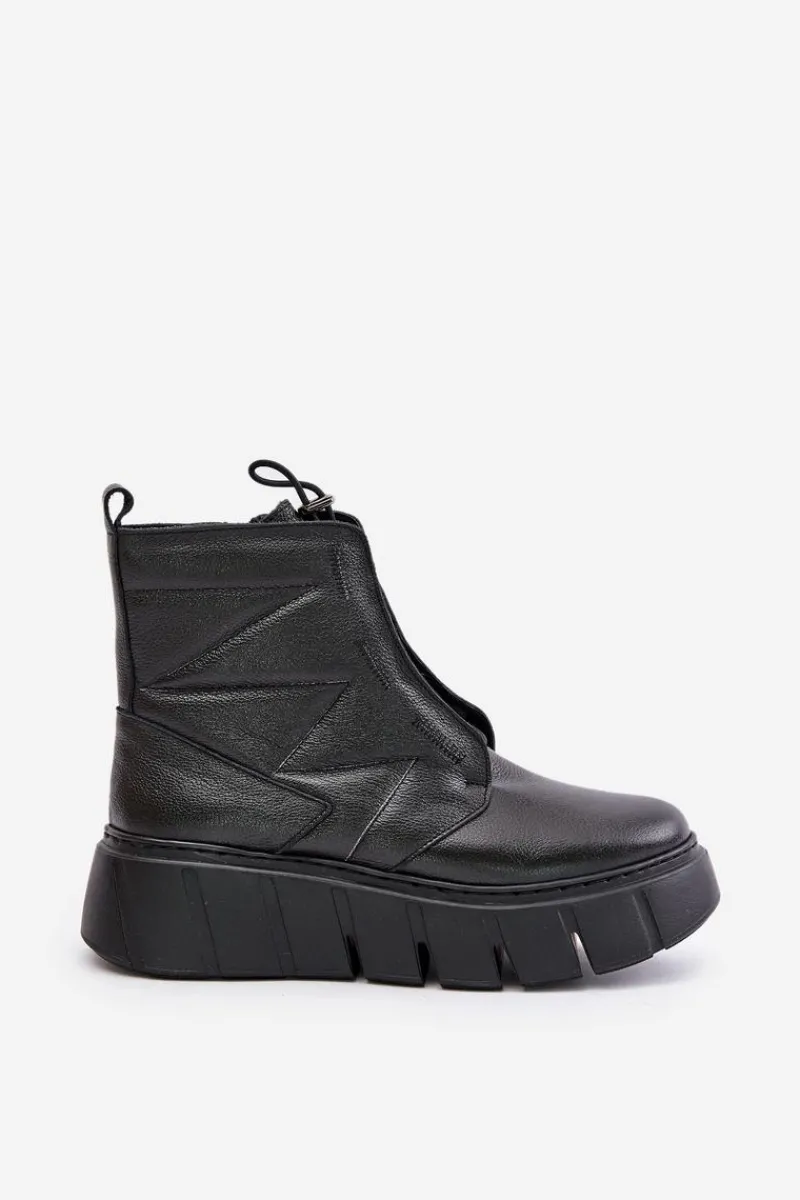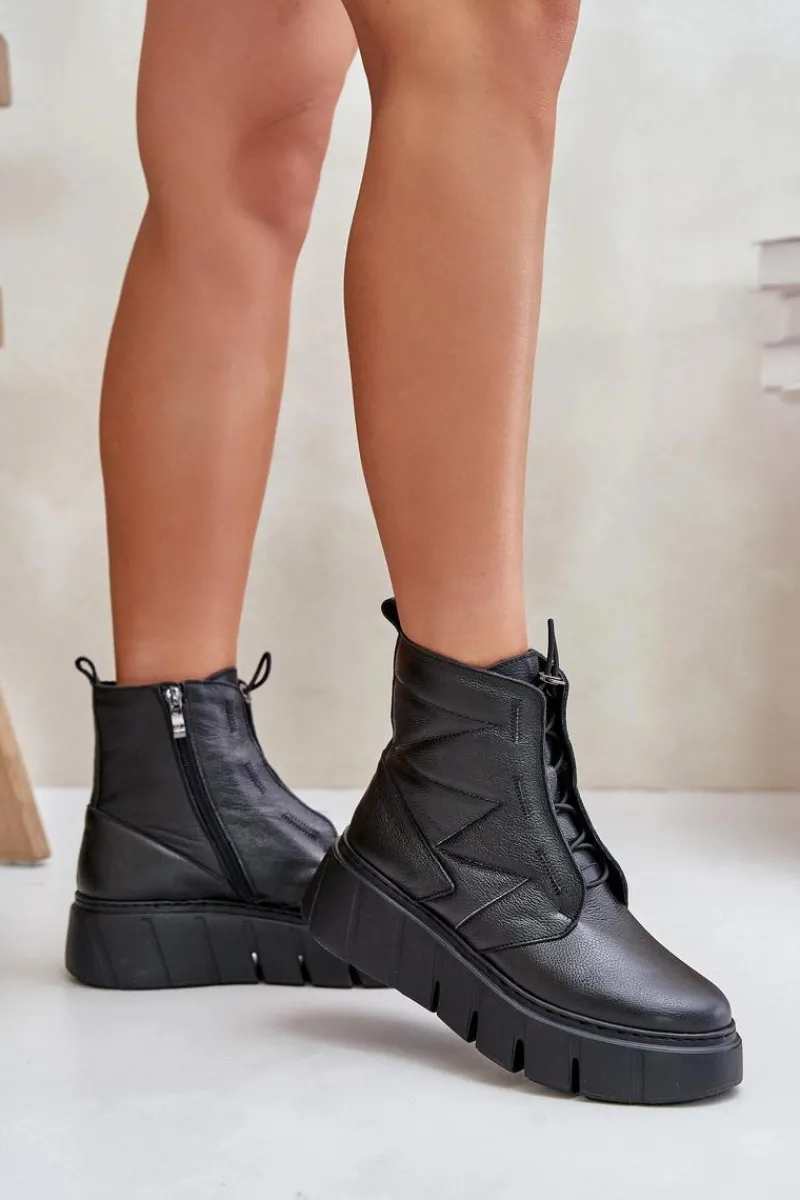 Damskie botki wykonane z naturalnej skóry, osadzone na platformie i koturnie, to idealny wybór na chłodniejsze dni. Ocieplane filcem, zapewniają ciepło i komfort noszenia. Model zapinany na zamek ułatwia zakładanie, a elegancki design sprawia, że botki doskonale pasują zarówno do codziennych, jak i bardziej stylowych stylizacji. Przy wyborze rozmiaru prosimy kierować się tabelą rozmiarów