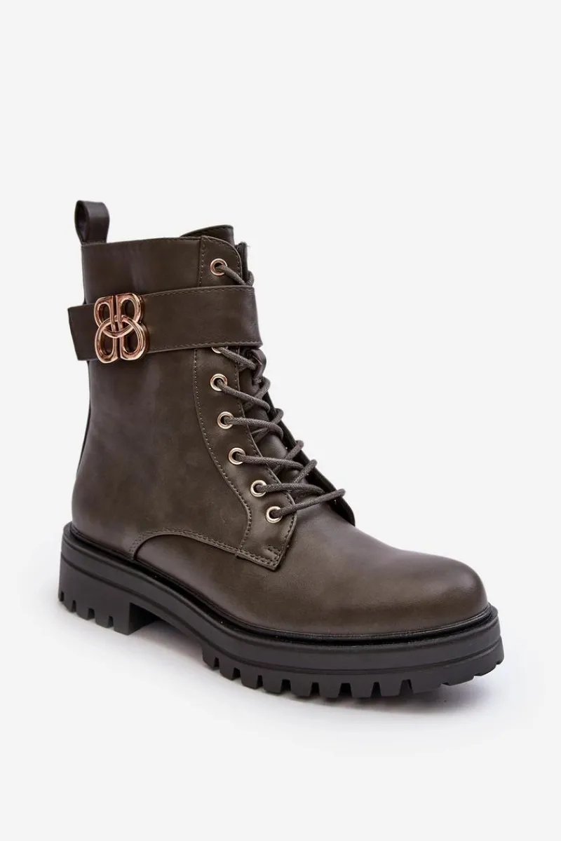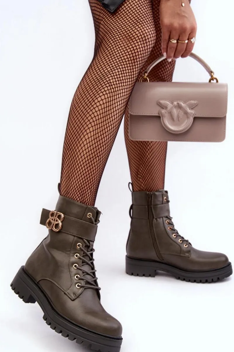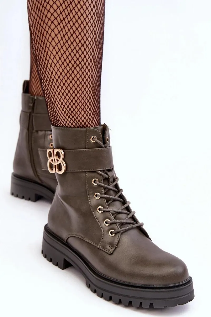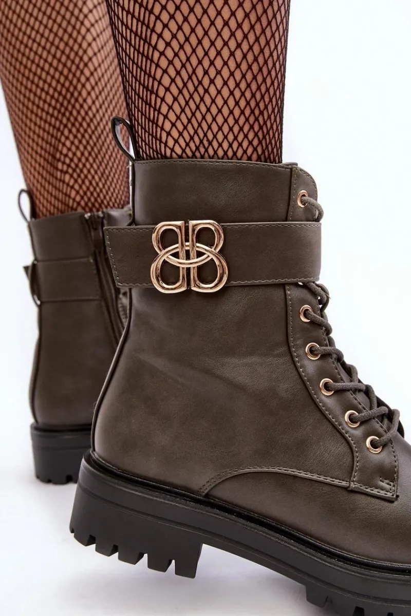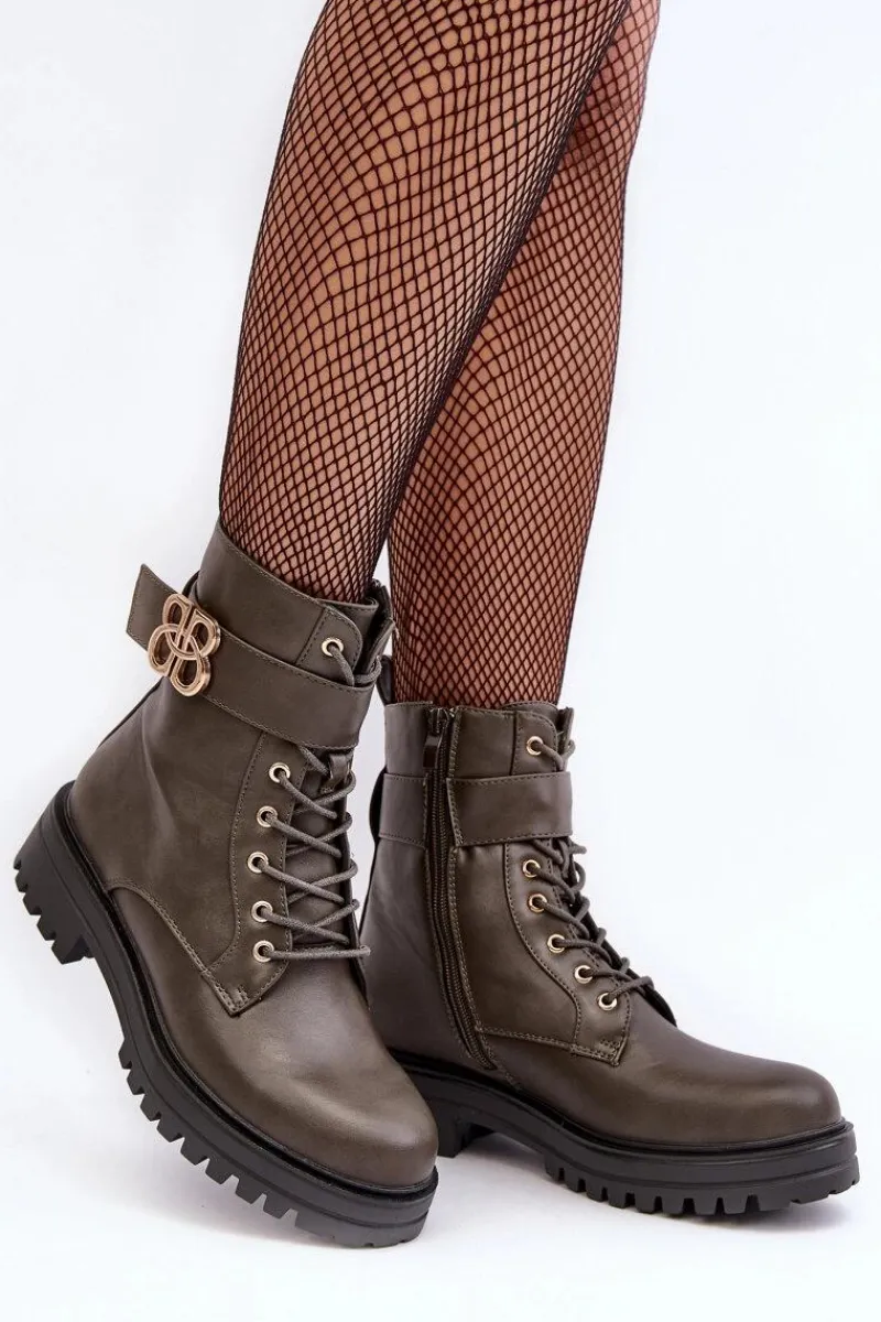 Botki damskie osadzone na płaskim, stabilnym obcasie. Z przodu sznurowane oraz dodatkowo zapinane suwakiem. Noski zaokrąglone. Wewnątrz ocieplone kocem obuwniczym. Na cholewce pasek ze złotą ozdobą. Dodatkowo zapiętek jest usztywniony. Przy wyborze rozmiaru prosimy sugerować się tabelą rozmiarów.