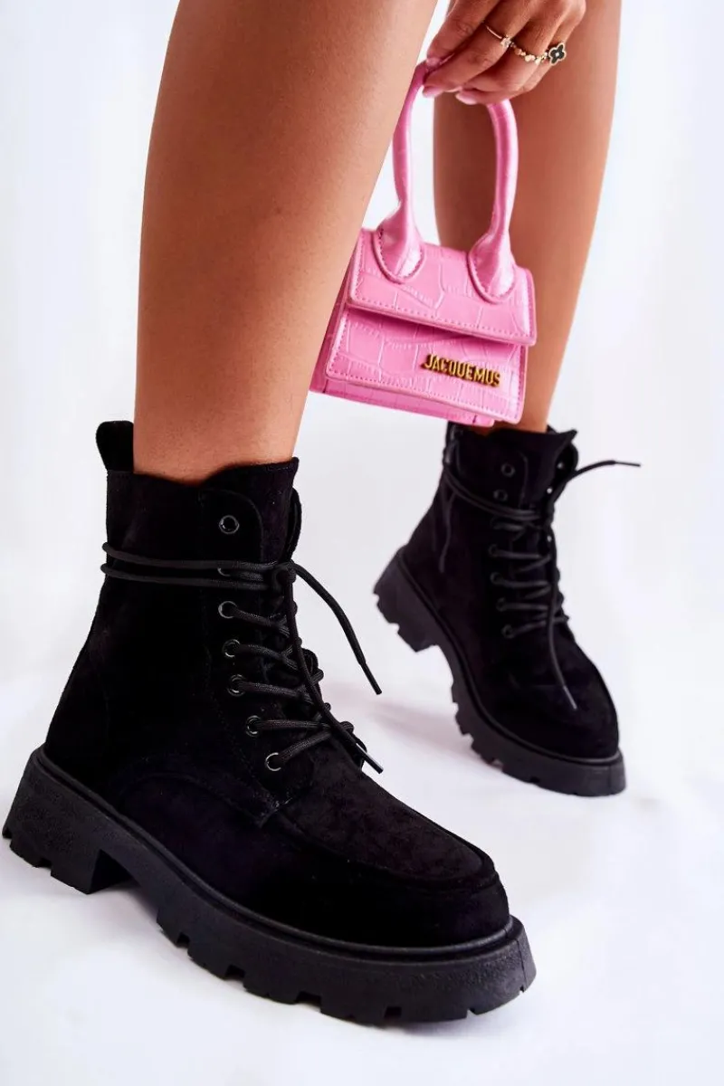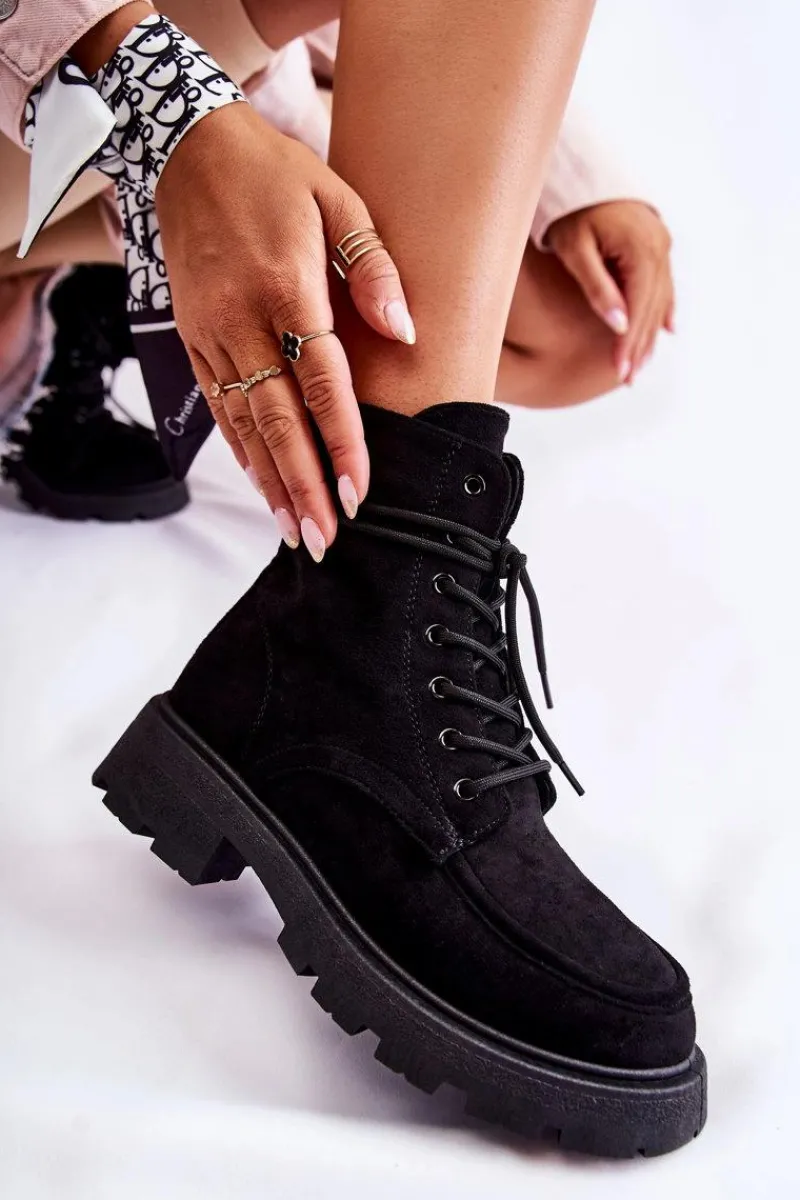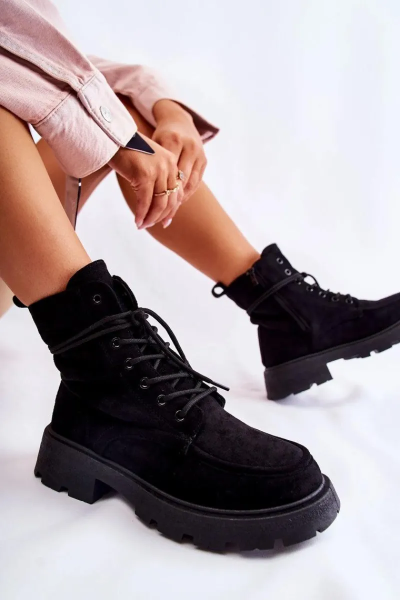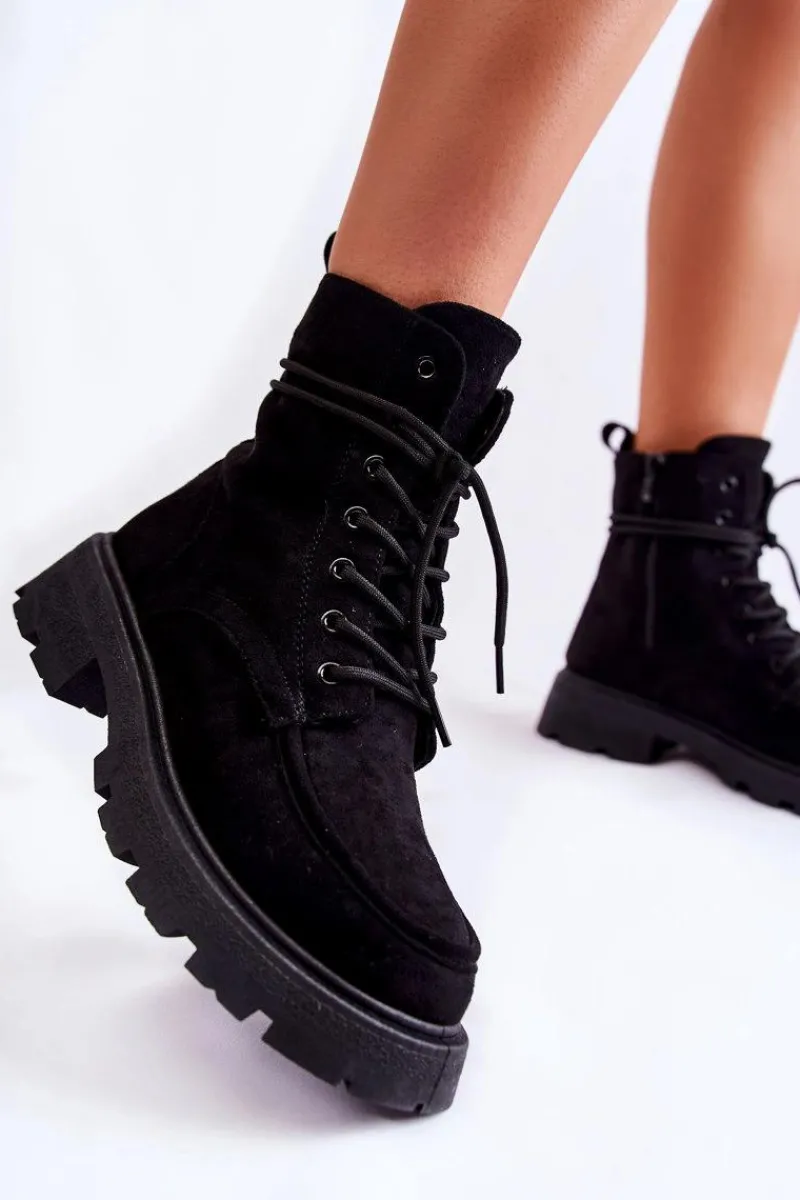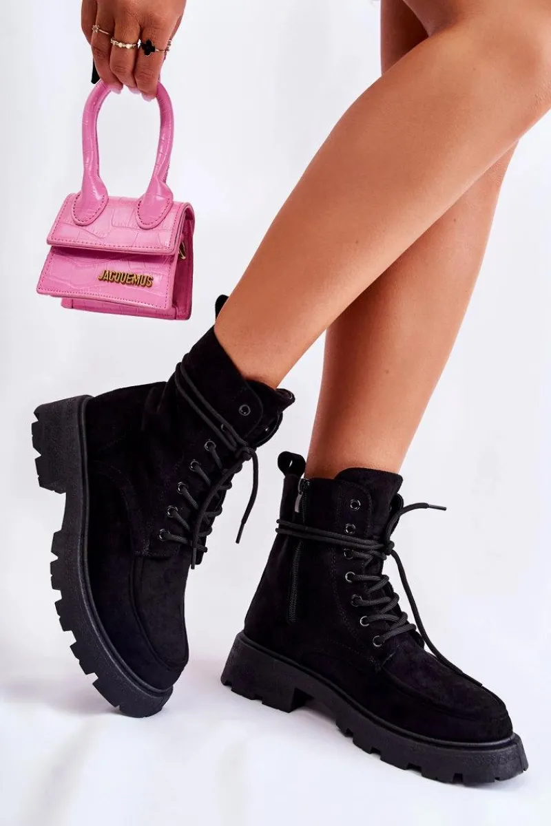 Klasyczne botki z cholewką za kostkę zostały wykonane z przyjemnego w dotyku eko zamszu. Model ten posiada z boku cholewki suwak. Dodatkowo są sznurowane, co pozwoli na odpowiednie dopasowanie obuwia do tęgości nogi. Osadzone na delikatnej platformie oraz płaskim obcasie. Posiadają w środku ocieplenie w postaci miłego w dotyku futerka. Zapiętek delikatnie usztywniany. Przy wyborze rozmiaru prosimy sugerować się tabelą rozmiarów.