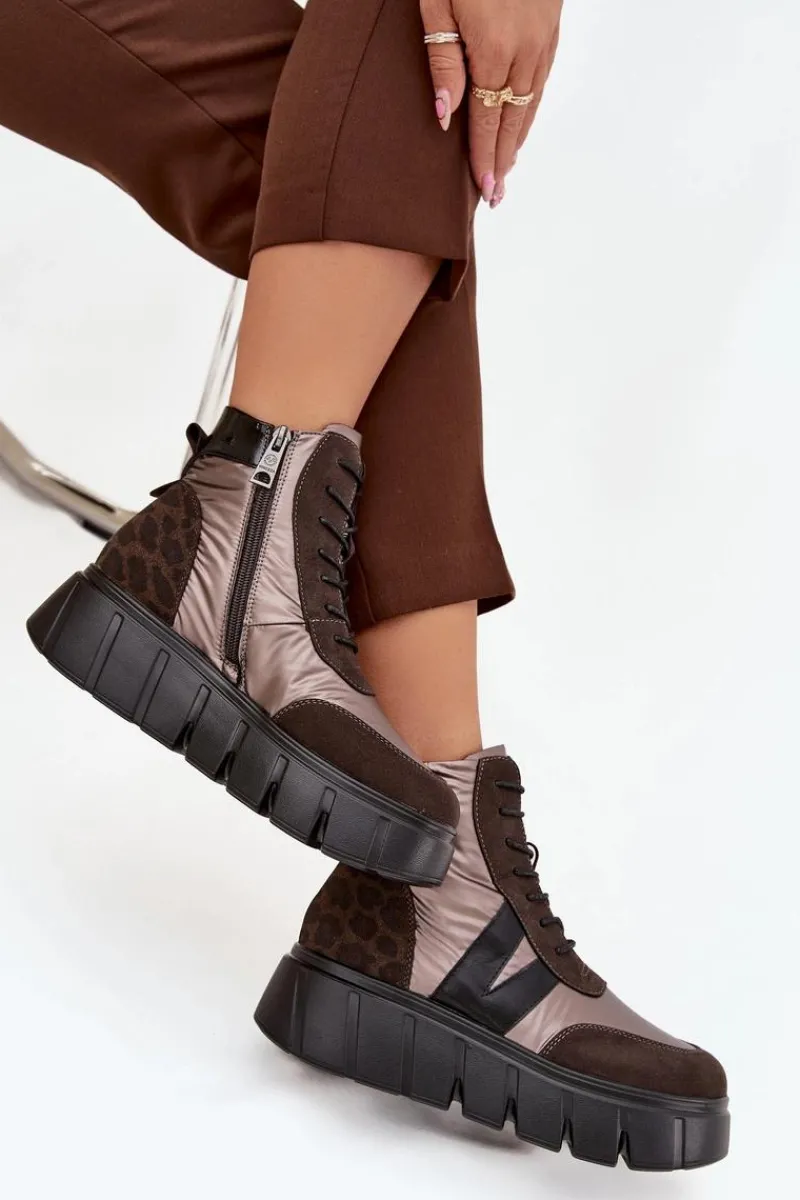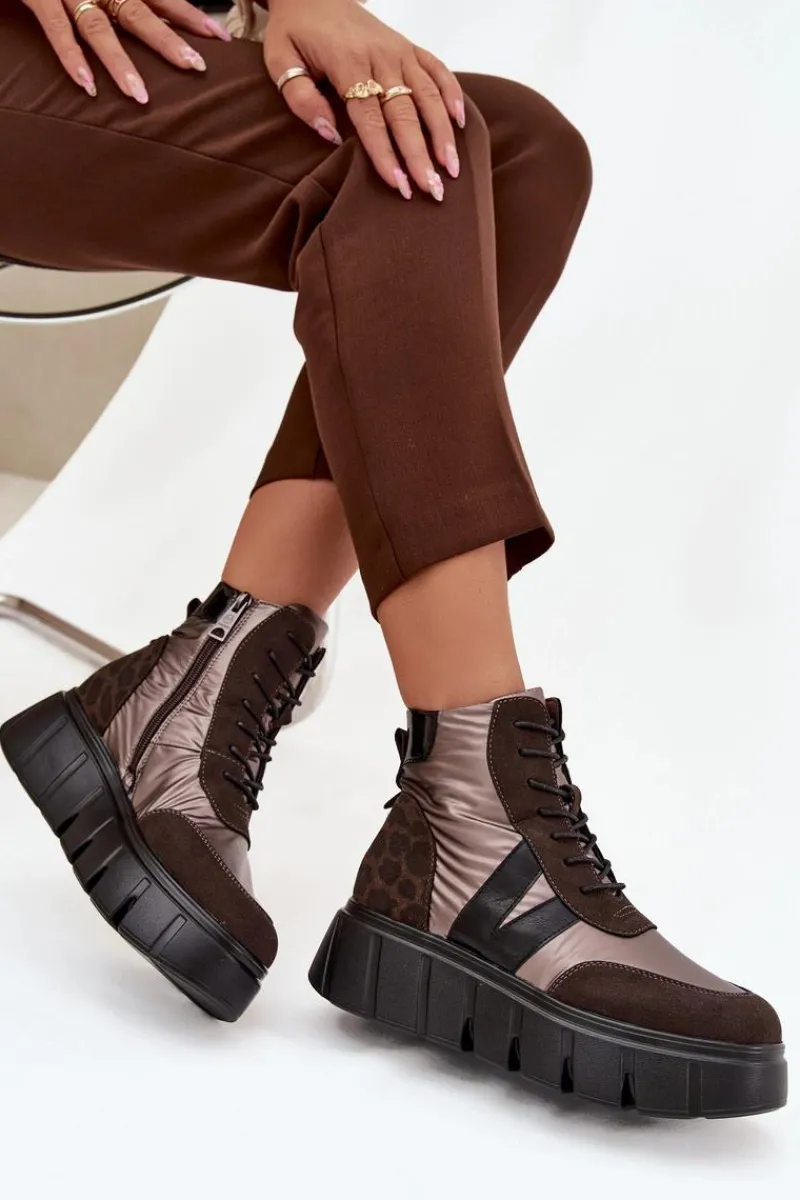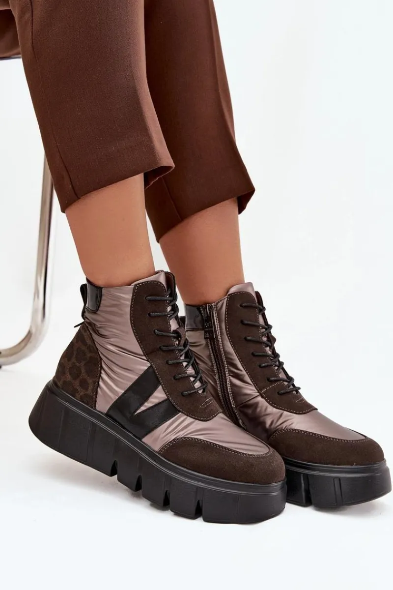 Botki damskie marki Vinceza to modna propozycja na chłodniejsze dni. Wykonane z połączenia eko zamszu i śliskiego materiału prezentują nowoczesny wygląd, który przyciąga uwagę. Osadzone na solidnej platformie zapewniają komfort i stabilność podczas noszenia. Model łączy sznurowanie z zapięciem na zamek, co ułatwia zakładanie i dopasowanie do stopy. Wnętrze ocieplone kocem obuwniczym gwarantuje ciepło i wygodę, dzięki czemu buty świetnie sprawdzą się w sezonie jesienno-zimowym. Przy wyborze rozmiaru prosimy sugerować się tabelą rozmiarów.