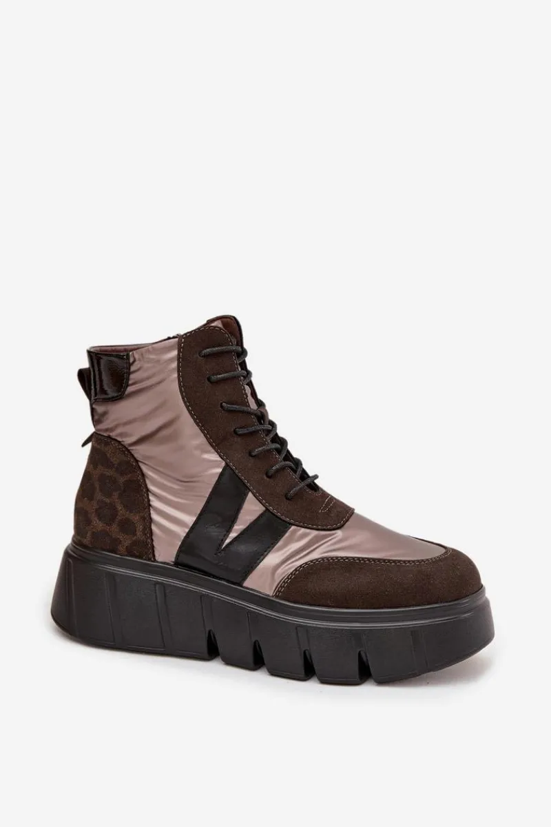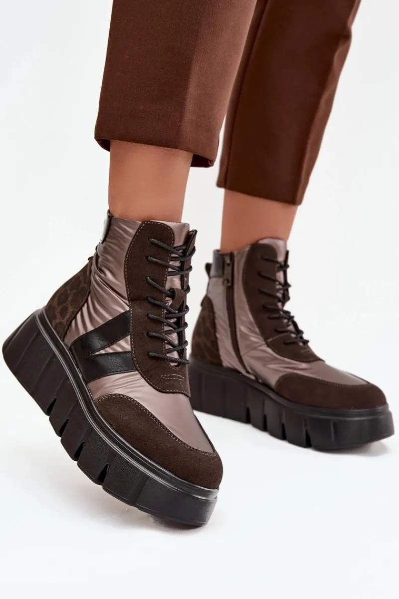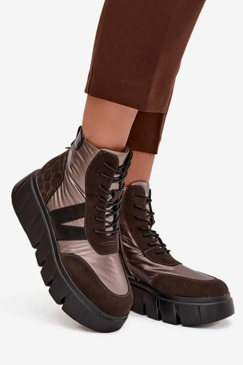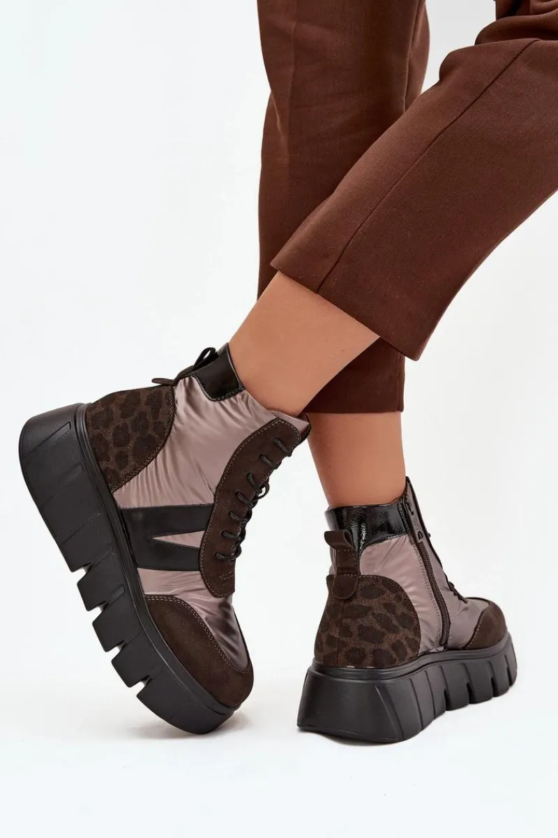 Botki damskie marki Vinceza to modna propozycja na chłodniejsze dni. Wykonane z połączenia eko zamszu i śliskiego materiału prezentują nowoczesny wygląd, który przyciąga uwagę. Osadzone na solidnej platformie zapewniają komfort i stabilność podczas noszenia. Model łączy sznurowanie z zapięciem na zamek, co ułatwia zakładanie i dopasowanie do stopy. Wnętrze ocieplone kocem obuwniczym gwarantuje ciepło i wygodę, dzięki czemu buty świetnie sprawdzą się w sezonie jesienno-zimowym. Przy wyborze rozmiaru prosimy sugerować się tabelą rozmiarów.