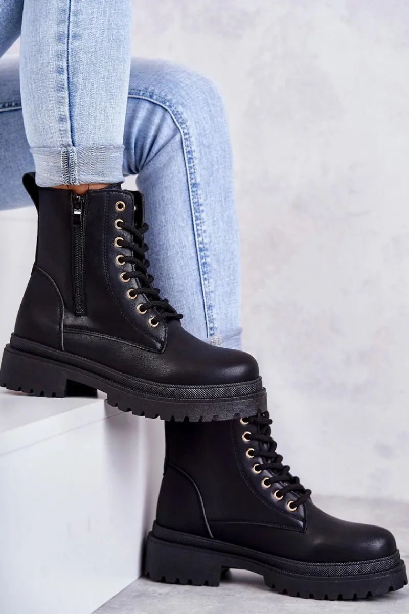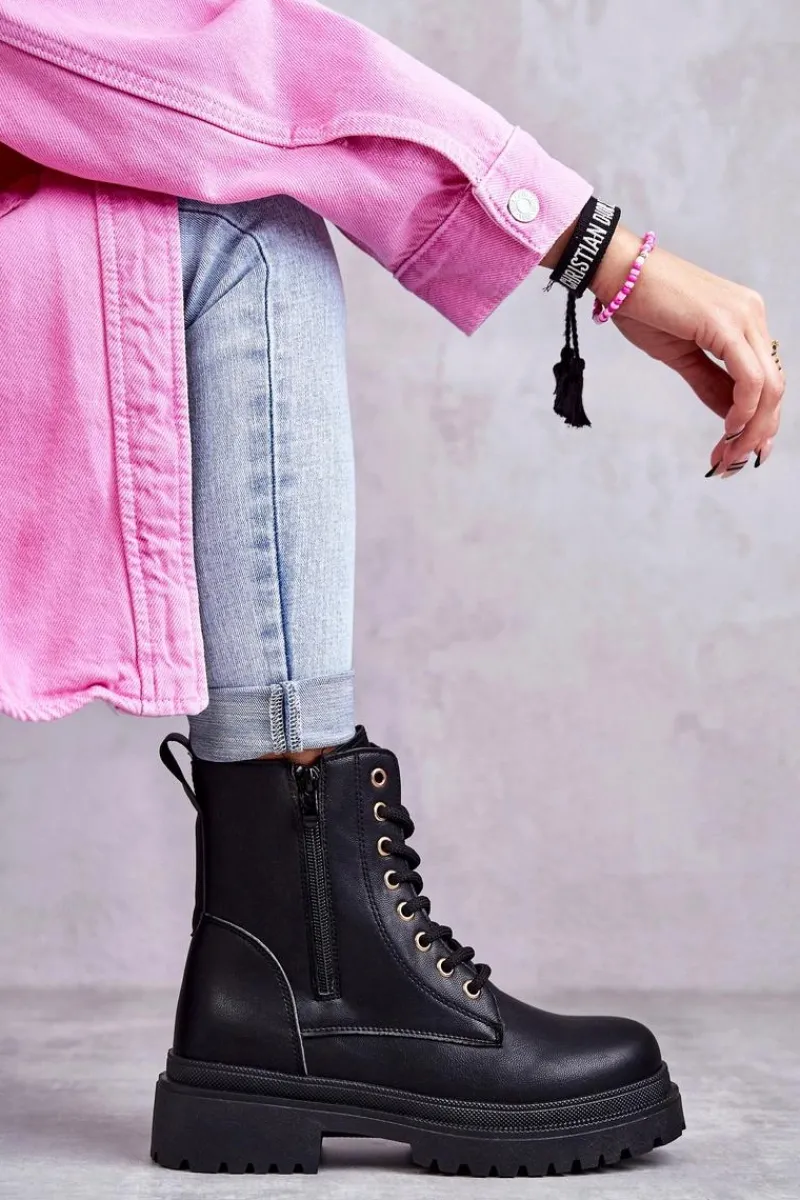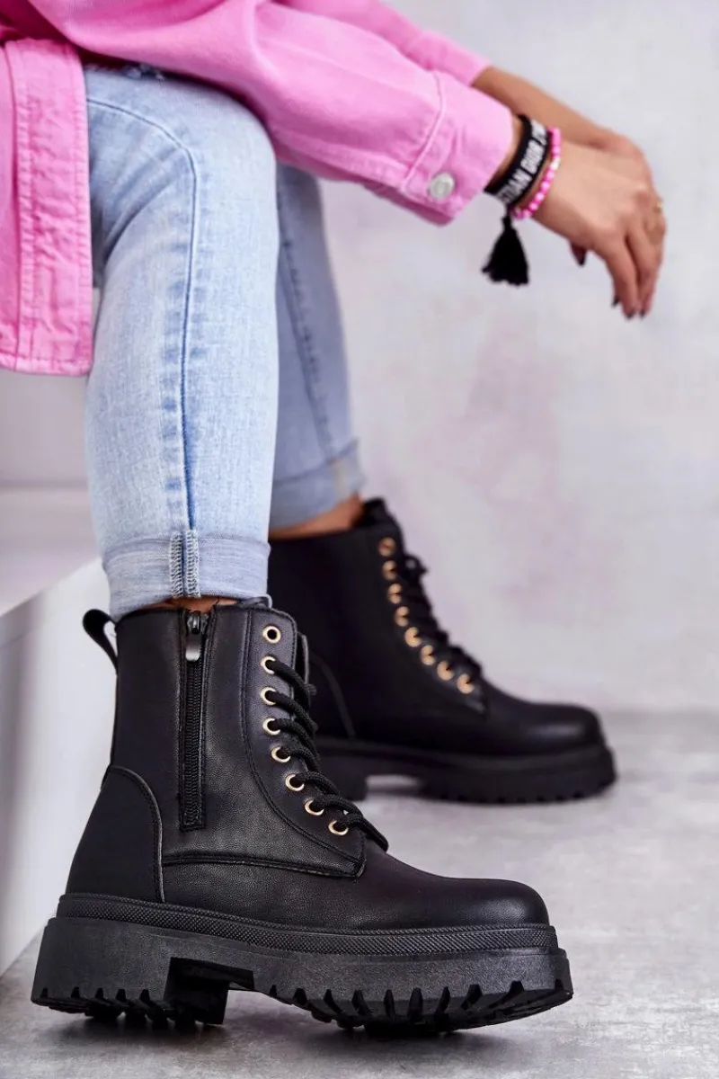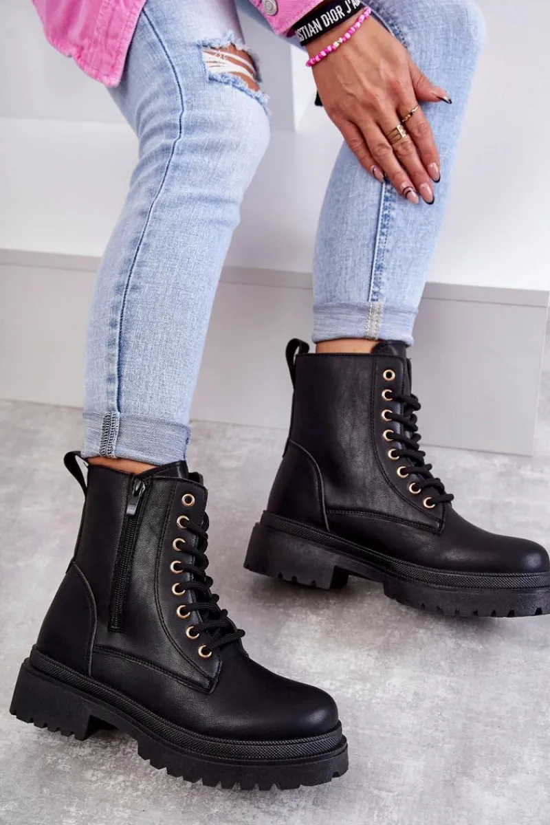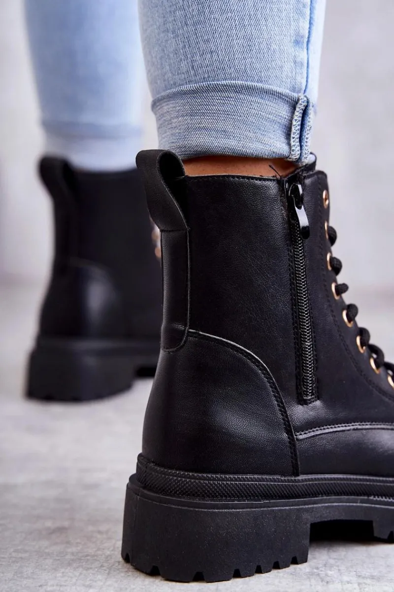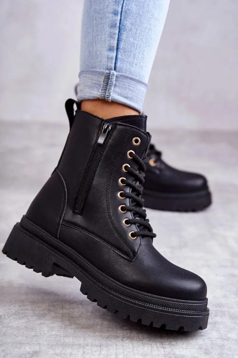 Piękne, damskie botki wykonane z eko skóry. Posiadają solidne sznurowanie z przodu oraz suwak ułatwiający zakładanie obuwia po boku cholewki. Osadzone na platformie i płaskim obcasie ze żłobieniami. Zostały ocieplone w środku kocem obuwniczym. Klasyczny fason, idealny do wielu stylizacji, który powinnaś mieć w swojej szafie! Przy wyborze rozmiaru prosimy sugerować się tabelą rozmiarów.
