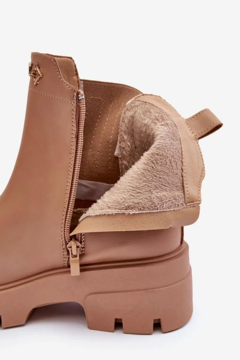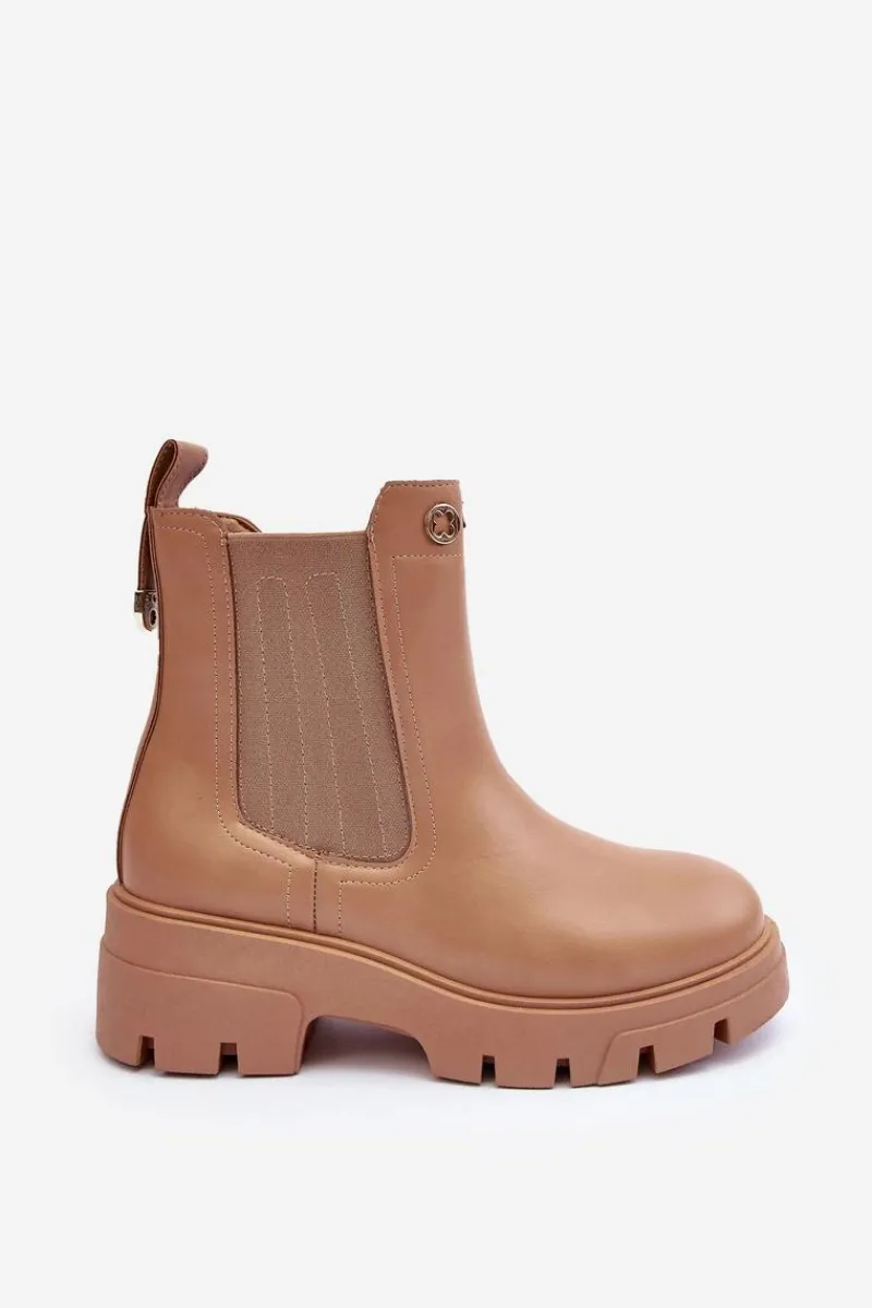 Klasyczne damskie botki osadzone na masywnym, płaskim obcasie oraz platformie. Wykonane z eko skóry. Wnętrze ocieplone kocem obuwniczym. Model zapinany na suwak. Na górze cholewki małe, złote ozdoby z tworzywa sztucznego. Koniecznie powinnaś mieć ten model w swojej szafie! Przy wyborze rozmiaru prosimy sugerować się tabelą rozmiarów.