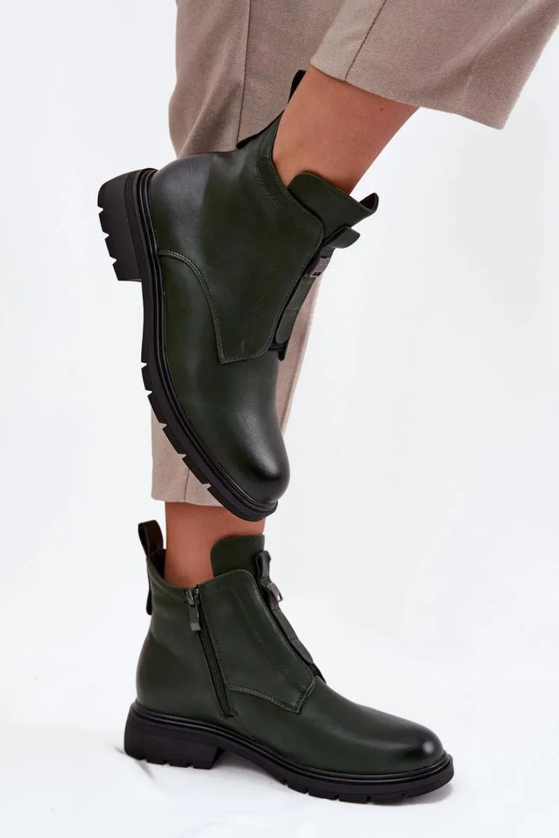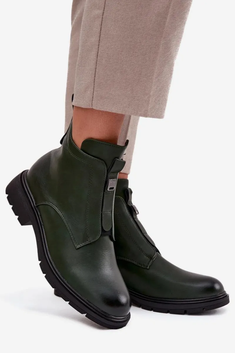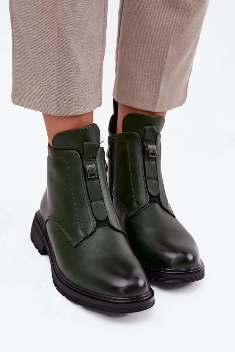 Botki damskie od marki Jezzi to praktyczne połączenie wygody i stylu na chłodniejsze dni. Wykonane z wysokiej jakości eko skóry, prezentują elegancki wygląd przy zachowaniu trwałości i łatwości w utrzymaniu. Osadzone na płaskim obcasie, zapewniają stabilny krok i komfort podczas codziennego noszenia. Model jest zapinany na zamek, co ułatwia szybkie zakładanie i dopasowanie do stopy. Wnętrze ocieplone, gwarantuje ciepło w chłodne dni, a subtelny, ozdobny detal z przodu cholewki dodaje charakteru i modnego akcentu, który wyróżnia je w codziennych stylizacjach. Idealne do casualowych zestawów, jak i do nieco bardziej eleganckich outfitów. Przy wyborze rozmiaru prosimy sugerować się tabelą rozmiarów.
