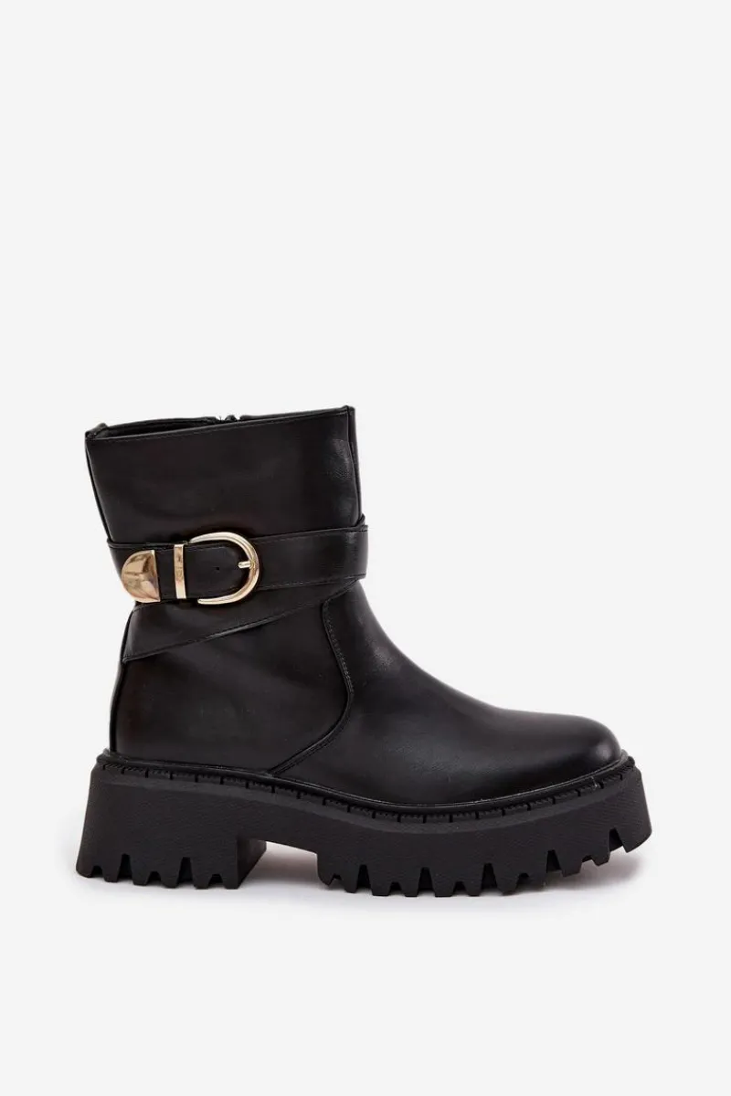 Damskie botki wykonane z eko skóry. Osadzone na platformie z płaskim obcasem zapewniają wygodę i stabilność podczas chodzenia. Wnętrze ocieplane miękkim kocem obuwniczym gwarantuje komfort oraz ciepło, nawet w zimniejsze dni. Botki zapinane są na praktyczny zamek, dzięki czemu łatwo się je zakłada i zdejmuje. Dodatkowym akcentem jest stylowy pasek z klamrą na cholewce, który nadaje całości modnego, nieco rockowego charakteru. Świetnie sprawdzą się w casualowych stylizacjach z jeansami, jak i w zestawieniach z sukienką czy spódnicą. Przy wyborze rozmiaru prosimy sugerować się tabelą rozmiarów.