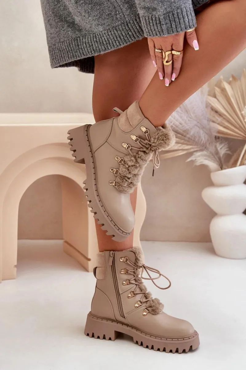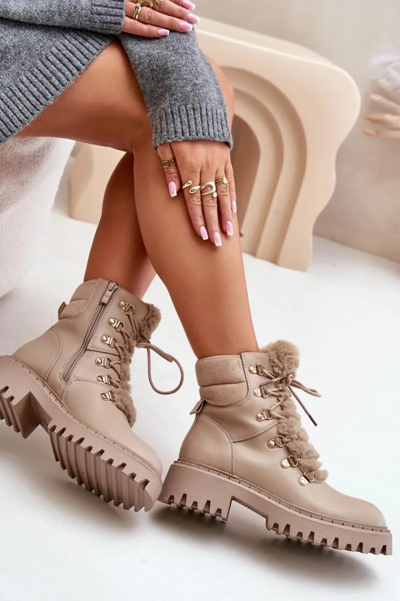 Damskie trapery wykonane z eko skóry to doskonały wybór na chłodniejsze dni. Model sznurowany oraz zapinany na zamek, co ułatwia szybkie zakładanie i zapewnia idealne dopasowanie. Język buta ozdobiony jest miękkim futerkiem, które dodaje uroku oraz chroni przed zimnem. Wnętrze ocieplane gwarantuje ciepło i wygodę podczas noszenia, dzięki czemu trapery świetnie sprawdzą się zarówno na co dzień, jak i w bardziej wymagających warunkach pogodowych. Przy wyborze rozmiaru prosimy sugerować się tabelą rozmiarów.