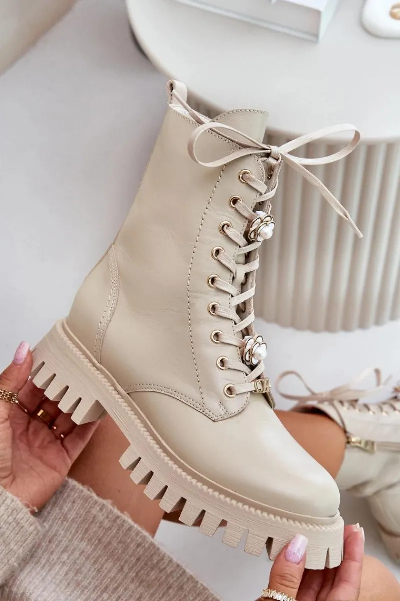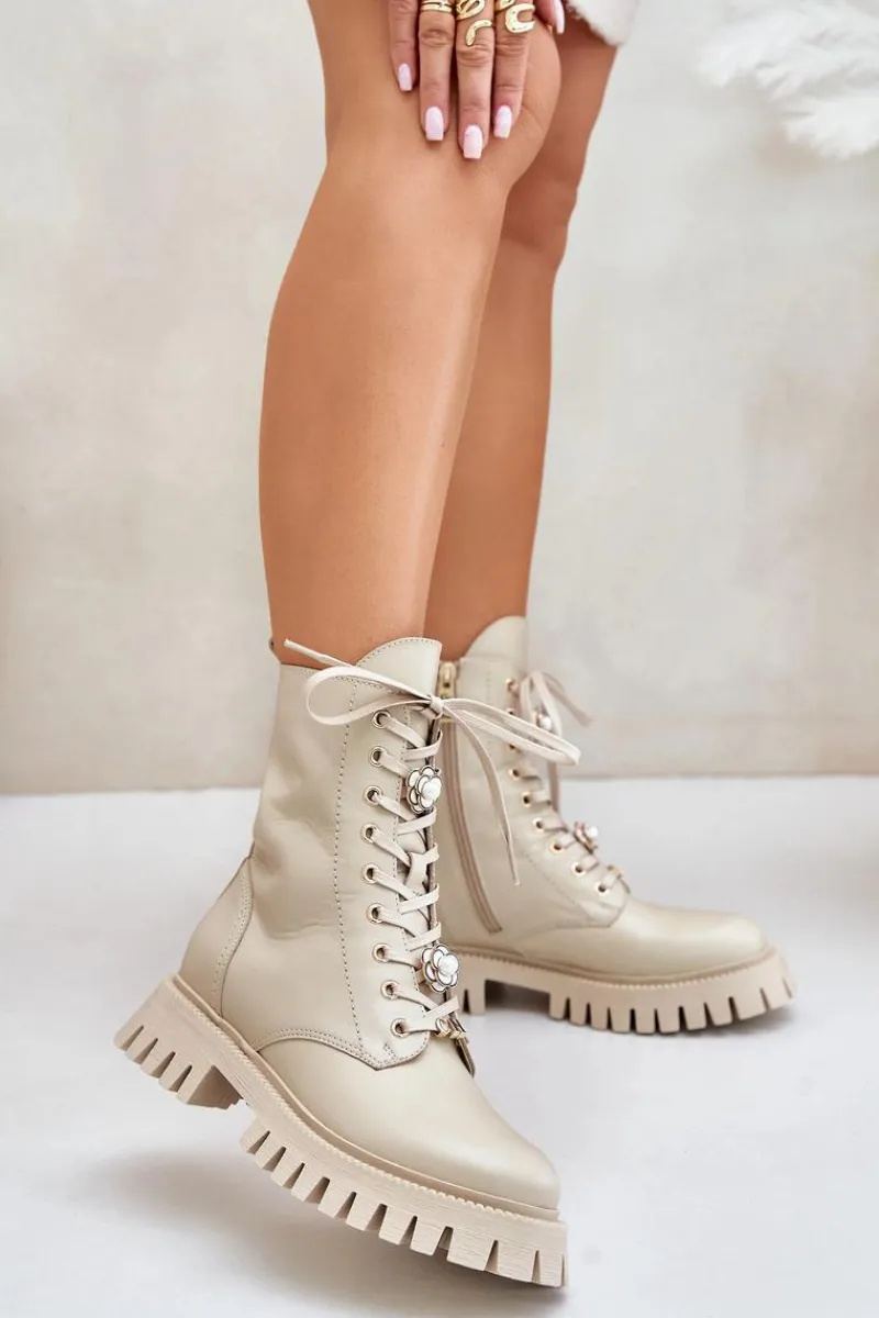 Śliczne botki wykonane z naturalnej skóry to stylowy wybór na każdą okazję. Osadzone na płaskim obcasie, zapewniają wygodę przez cały dzień. Model posiada zarówno sznurowanie, jak i zamek, co ułatwia dopasowanie oraz szybkie zakładanie. Dodatkową ozdobą są urocze przypinki na sznurowaniu. Idealne dla osób ceniących komfort i oryginalny styl w jednym. Przy wyborze rozmiaru prosimy sugerować się tabelą rozmiarów.