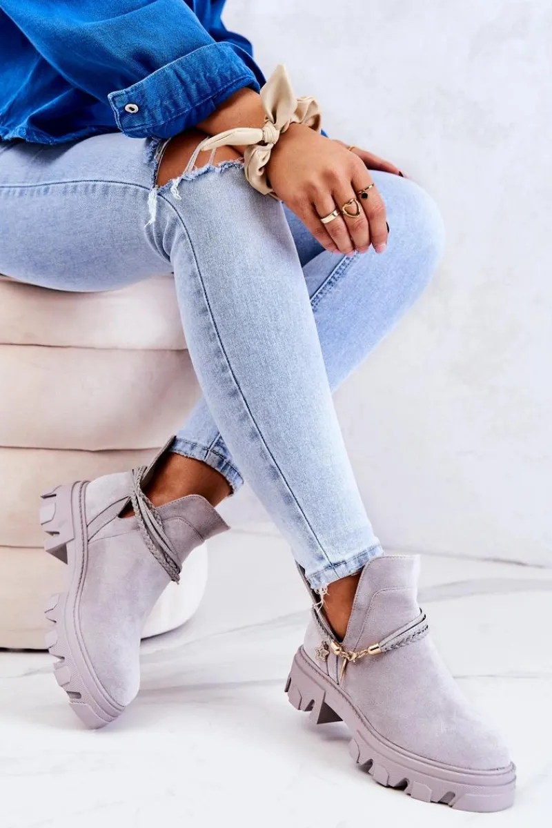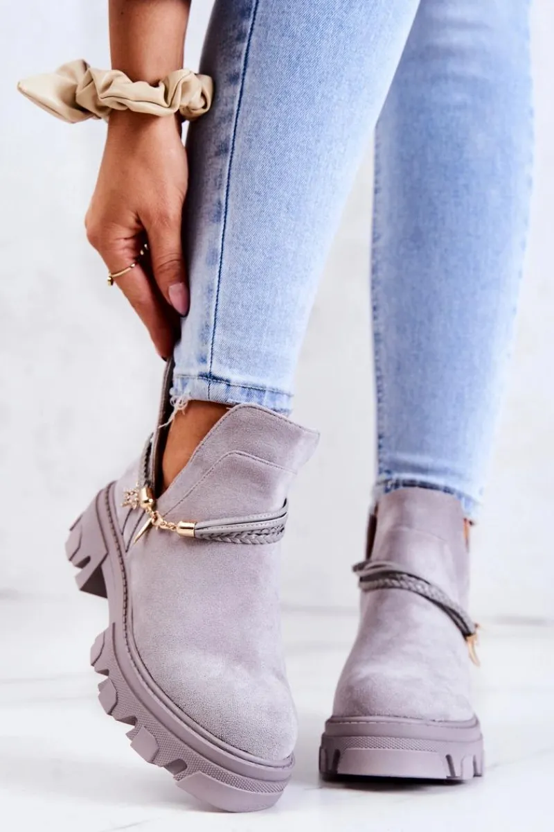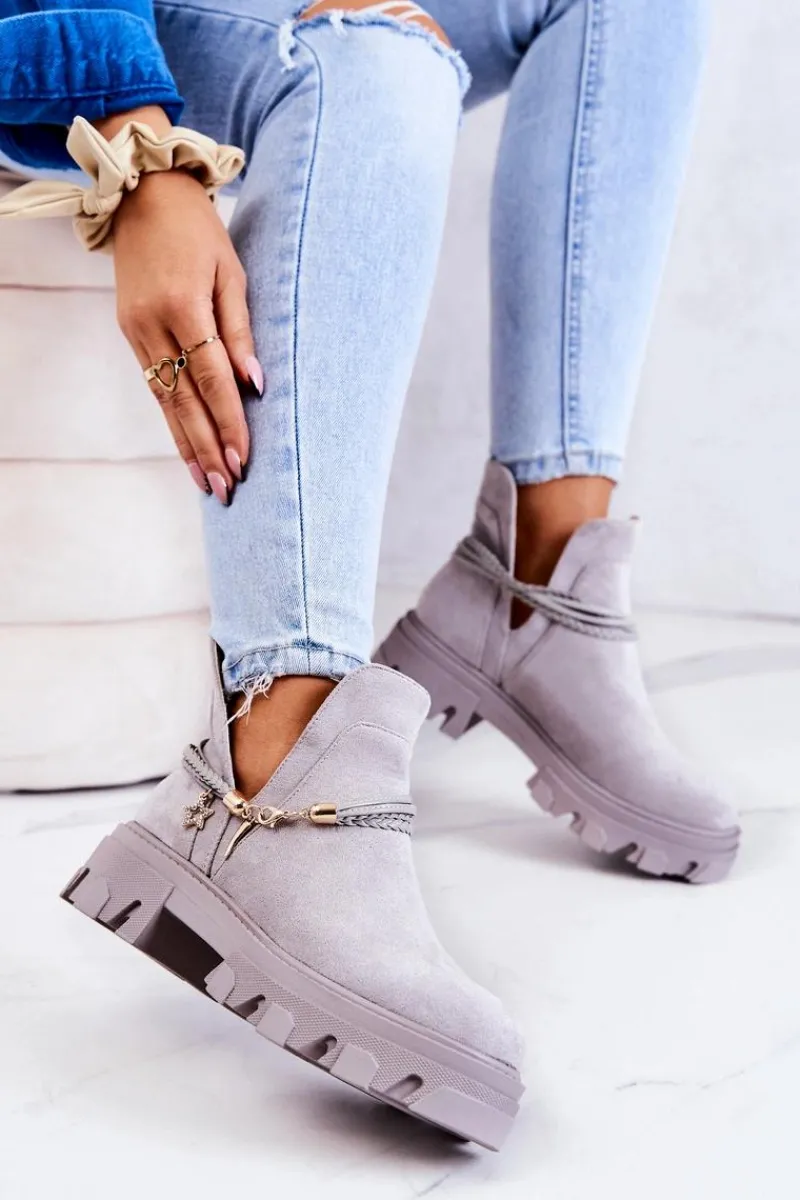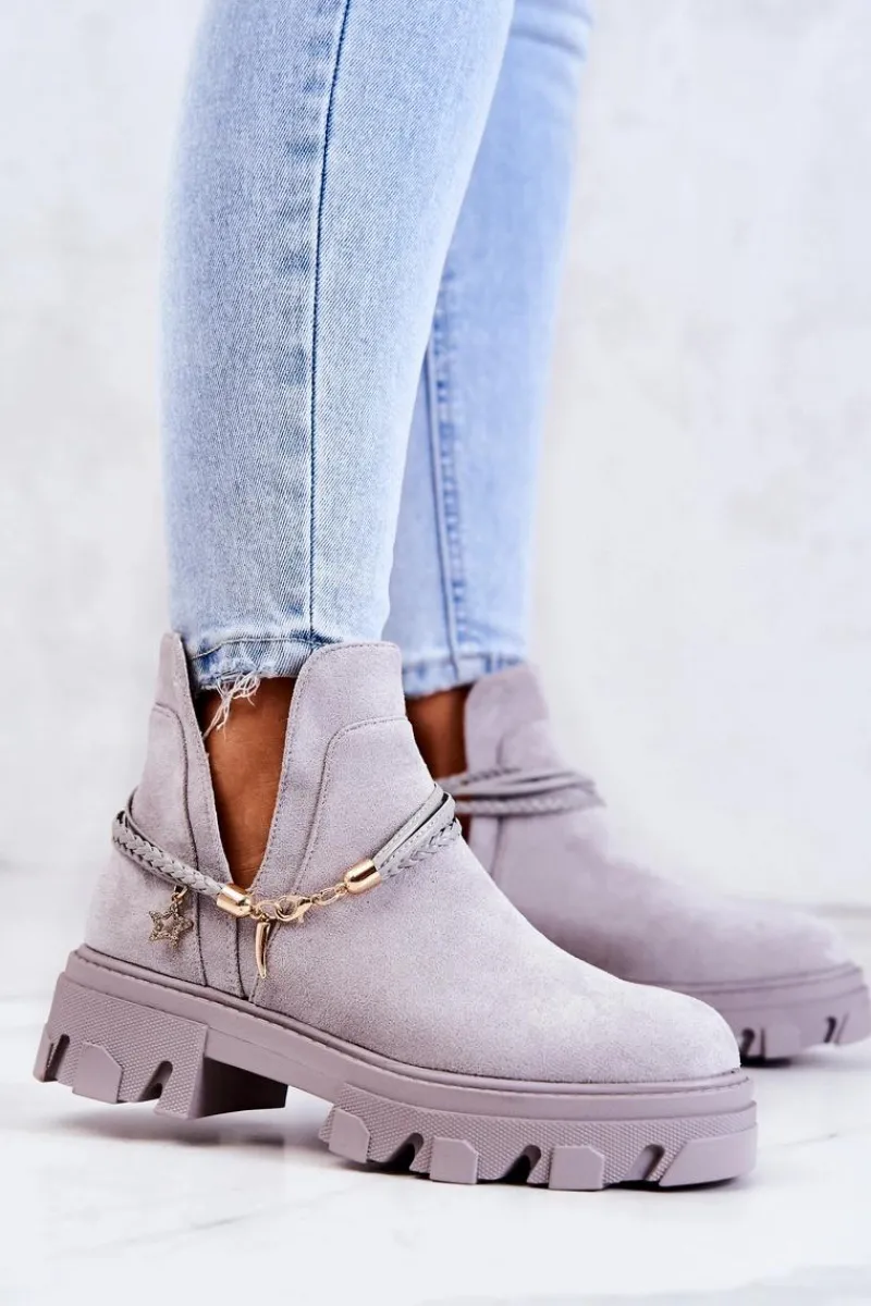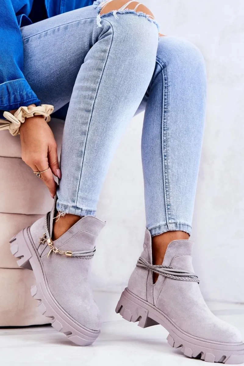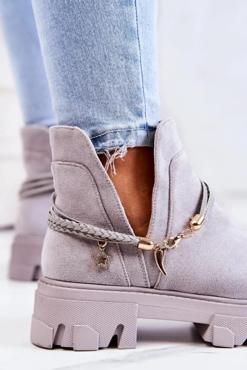 Botki z wycięciami wykonane z eko zamszu. Posiadają masywną podeszwę chroniącą przed zimnym podłożem. Plecione, dekoracyjne paski posiadają dodatkowo zawieszkę w postaci gwiazdy z cyrkoniami. Można je odpiąć. Wycięcia na kostkę sprawiają, że te botki wyglądają bardzo efektownie. Przy wyborze rozmiaru prosimy sugerować się tabelą rozmiarów.
