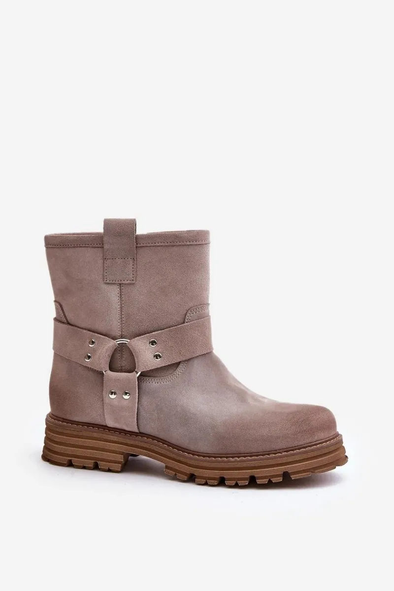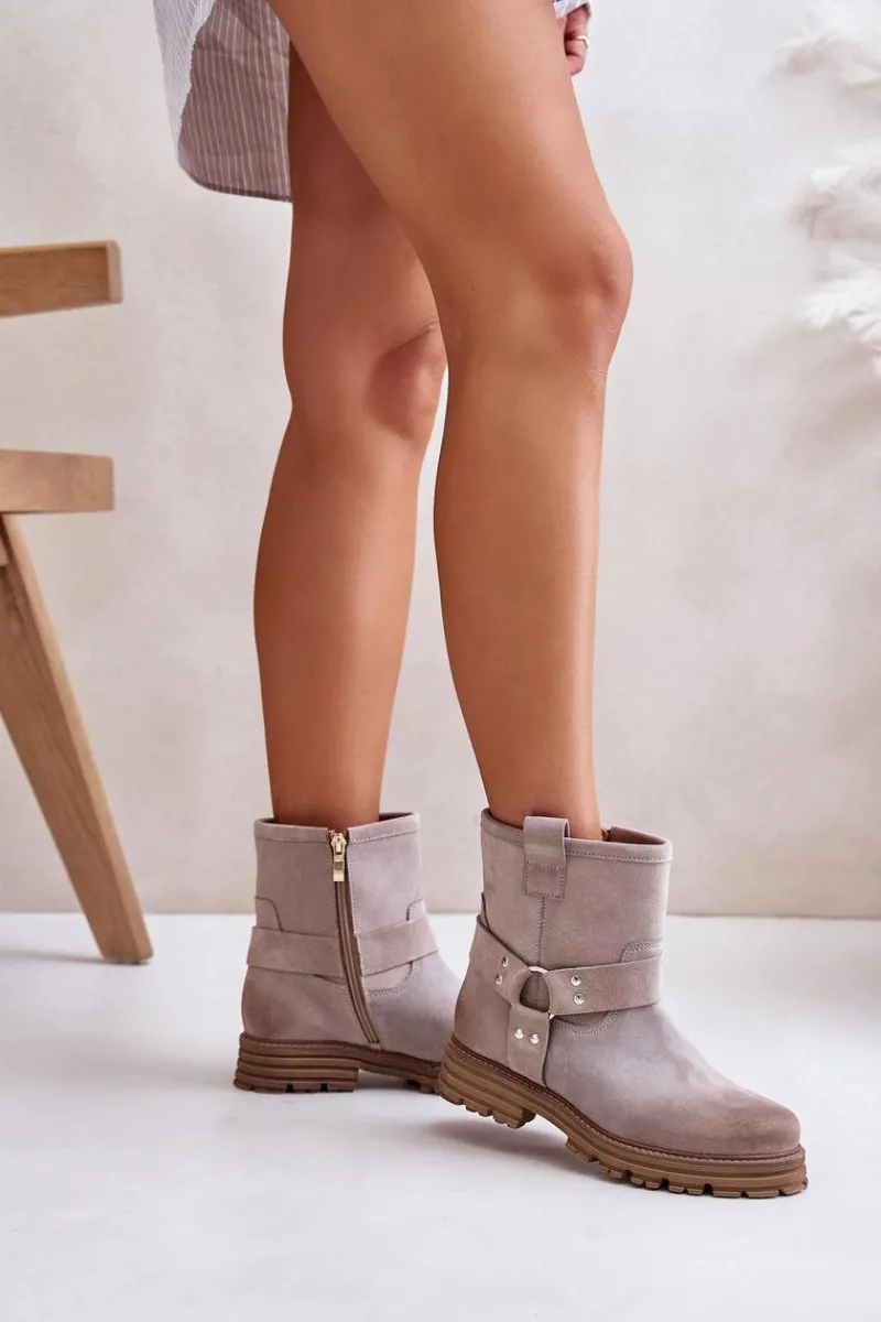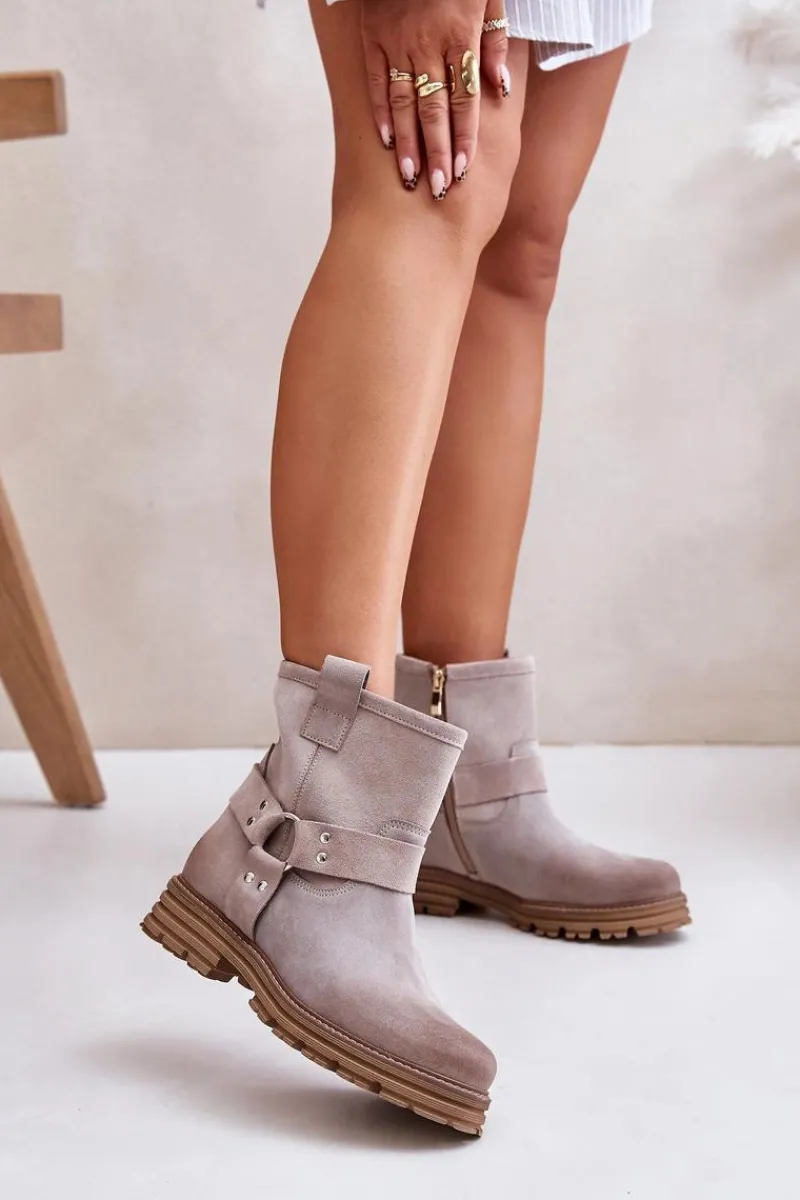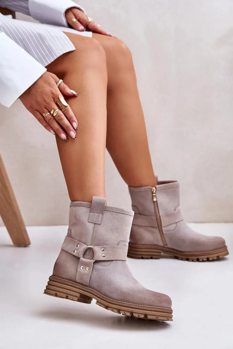 Botki wykonane z naturalnego zamszu to idealny wybór na każdą okazję. Osadzone na płaskim obcasie, zapewniają komfort i stabilność podczas chodzenia. Zaokrąglone noski dodają subtelnego charakteru. Model zapinany na zamek, co ułatwia zakładanie. Cholewka ozdobiona efektownym połączeniem pasków, które dodają stylowego akcentu. Te botki świetnie sprawdzą się w codziennych stylizacjach, łącząc elegancję z wygodą. Przy wyborze rozmiaru prosimy sugerować się tabelą rozmiarów.