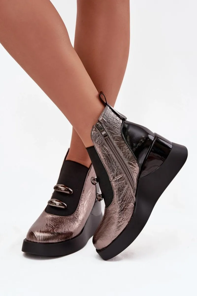 Botki damskie wykonane z eko skóry. Model osadzony na koturnie subtelnie unosi sylwetkę, zapewniając stabilność i komfort podczas noszenia. Z przodu umieszczono elastyczną wstawkę oraz dwa ozdobne elementy, które dodają wyjątkowego charakteru. Zamek z boku ułatwia zakładanie, a delikatne ocieplenie sprawia, że botki doskonale sprawdzą się w chłodniejsze dni. To uniwersalny model, który świetnie komponuje się zarówno z codziennymi, jak i bardziej eleganckimi stylizacjami, podkreślając ich kobiecy i nowoczesny styl. Przy wyborze rozmiaru prosimy sugerować się tabelą rozmiarów.
