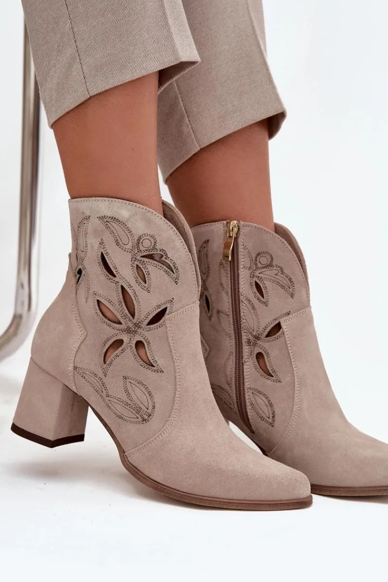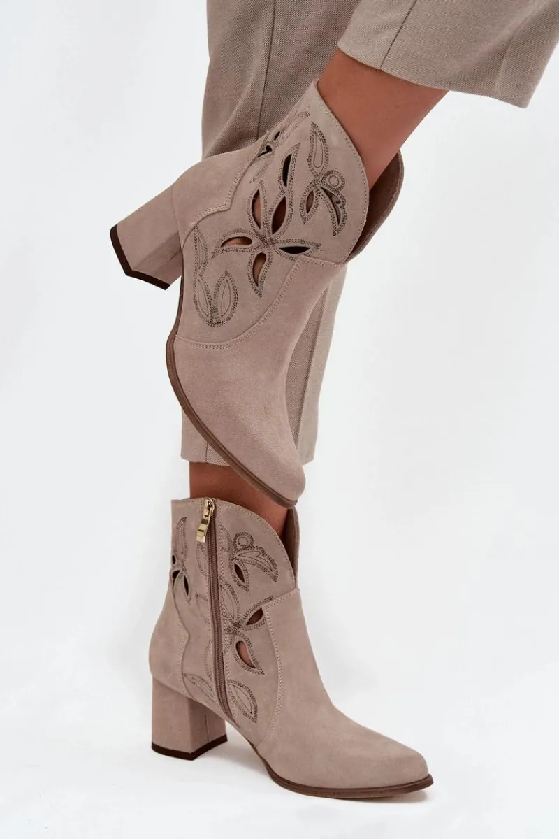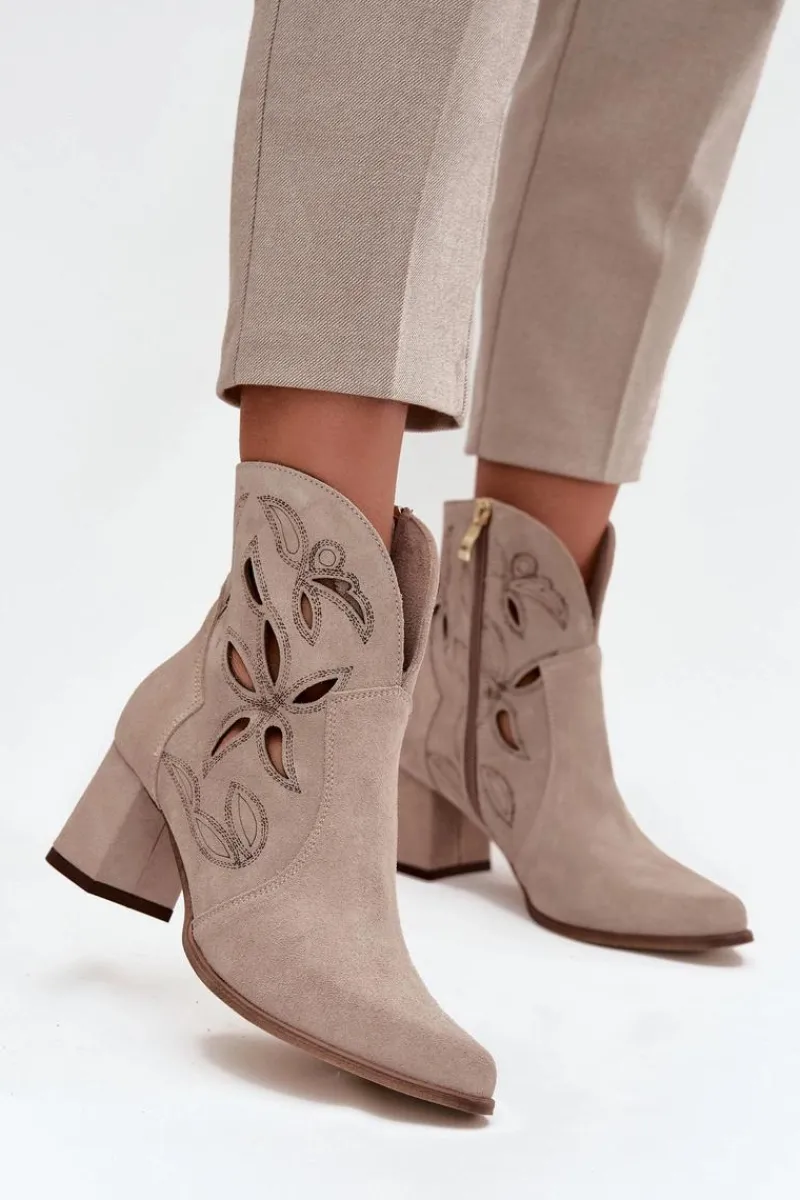 Botki damskie wykonane z naturalnego zamszu. Ażurowy wzór dodaje im oryginalności i lekkości, podkreślając wyjątkowy charakter tego modelu. Obcas typu słupek zapewnia stabilność i wygodę, a jednocześnie pięknie wydłuża sylwetkę. Szpiczaste noski wprowadzają elegancki akcent, sprawiając, że buty prezentują się niezwykle zgrabnie. Dzięki zapięciu na zamek są łatwe w zakładaniu i zdejmowaniu, co zwiększa komfort codziennego użytkowania. To obuwie idealne na sezon przejściowy, które świetnie uzupełni zarówno casualowe, jak i bardziej eleganckie zestawy. Przy wyborze rozmiaru prosimy sugerować się tabelą rozmiarów.