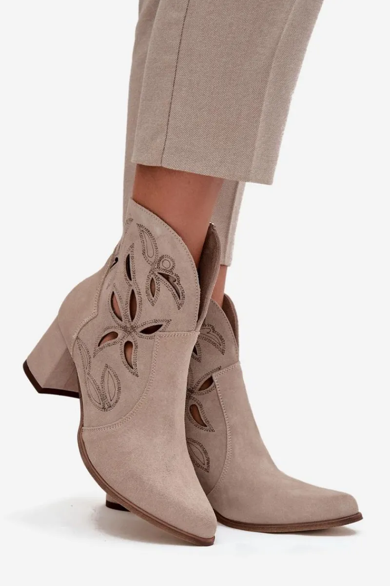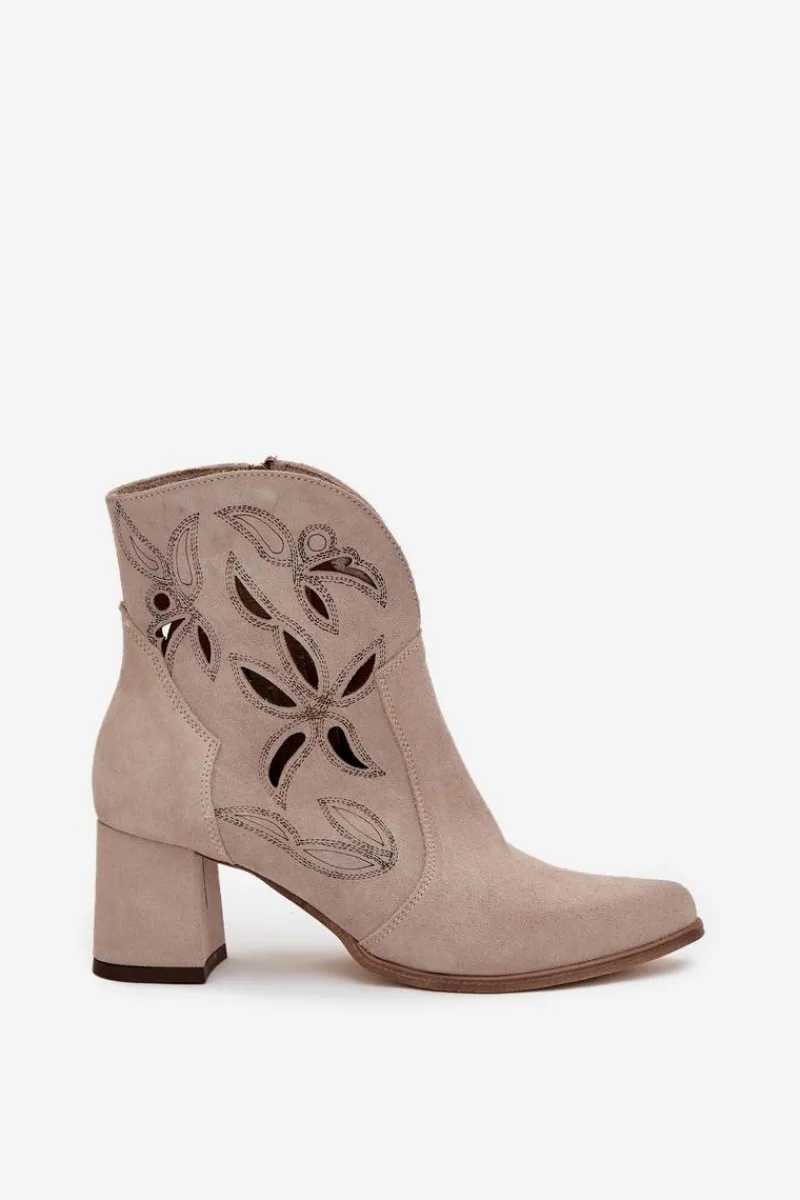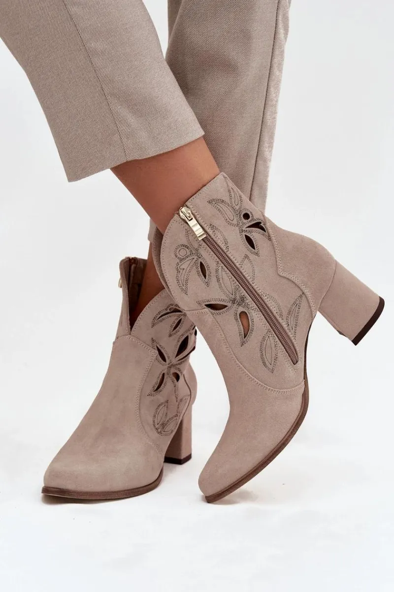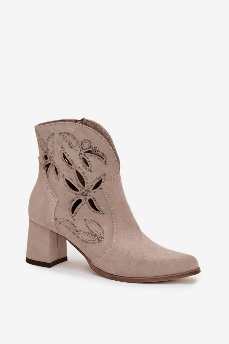 Botki damskie wykonane z naturalnego zamszu. Ażurowy wzór dodaje im oryginalności i lekkości, podkreślając wyjątkowy charakter tego modelu. Obcas typu słupek zapewnia stabilność i wygodę, a jednocześnie pięknie wydłuża sylwetkę. Szpiczaste noski wprowadzają elegancki akcent, sprawiając, że buty prezentują się niezwykle zgrabnie. Dzięki zapięciu na zamek są łatwe w zakładaniu i zdejmowaniu, co zwiększa komfort codziennego użytkowania. To obuwie idealne na sezon przejściowy, które świetnie uzupełni zarówno casualowe, jak i bardziej eleganckie zestawy. Przy wyborze rozmiaru prosimy sugerować się tabelą rozmiarów.