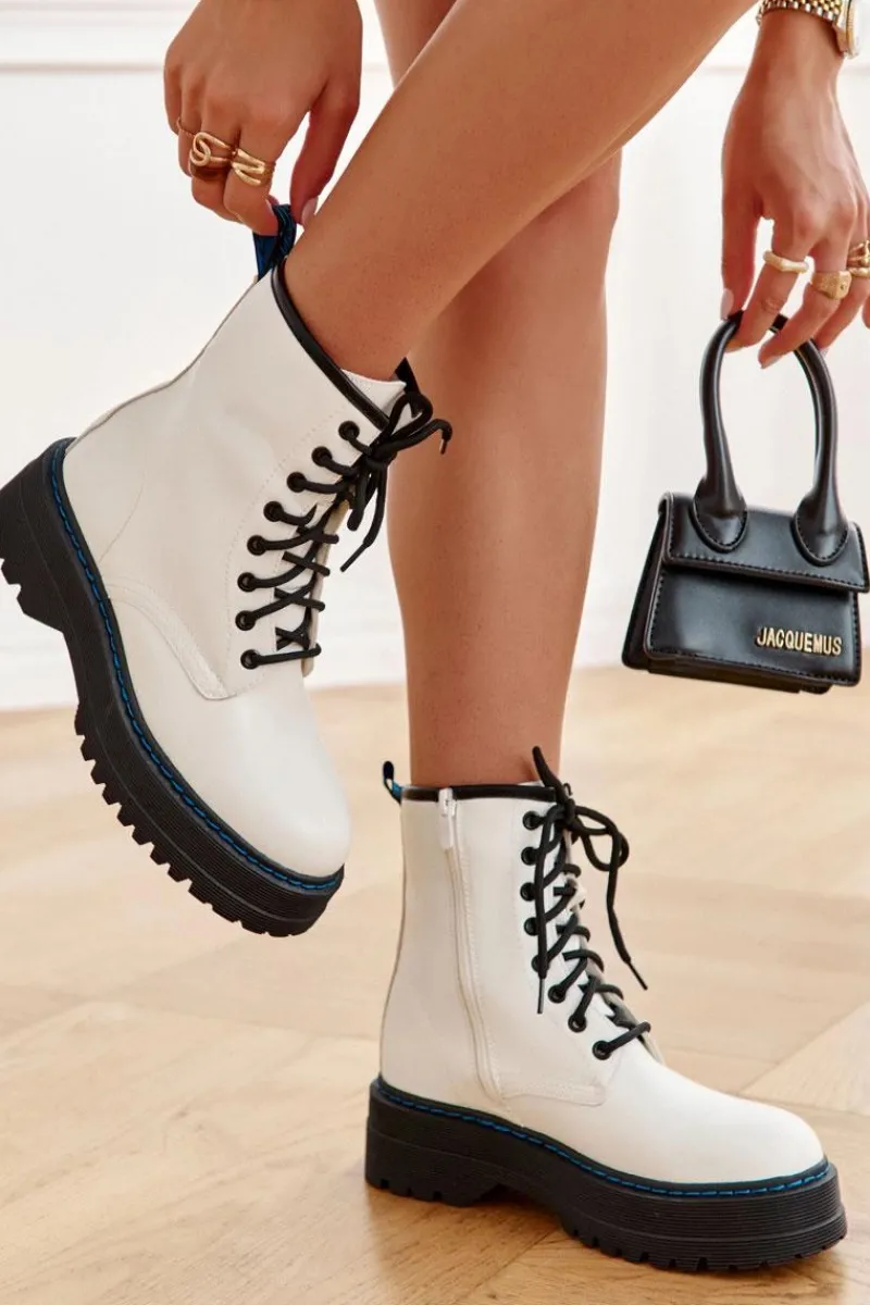 Wyjątkowe botki damskie posiadają klasyczne wiązanie na okrągłe sznurowadła oraz suwak ułatwiający zakładanie obuwia. Posiadają delikatne przeszycia na cholewce. Wykonane z eko skóry. Usztywniany zapiętek zapewni stabilizację stopy. Botki osadzono na płaskim, masywnym obcasie oraz platformie, która jest dodatkowo obszyta nicią. Przy wyborze rozmiaru prosimy sugerować się tabelą rozmiarów.