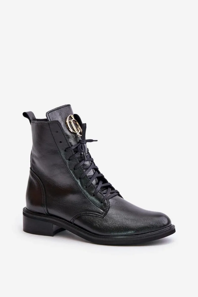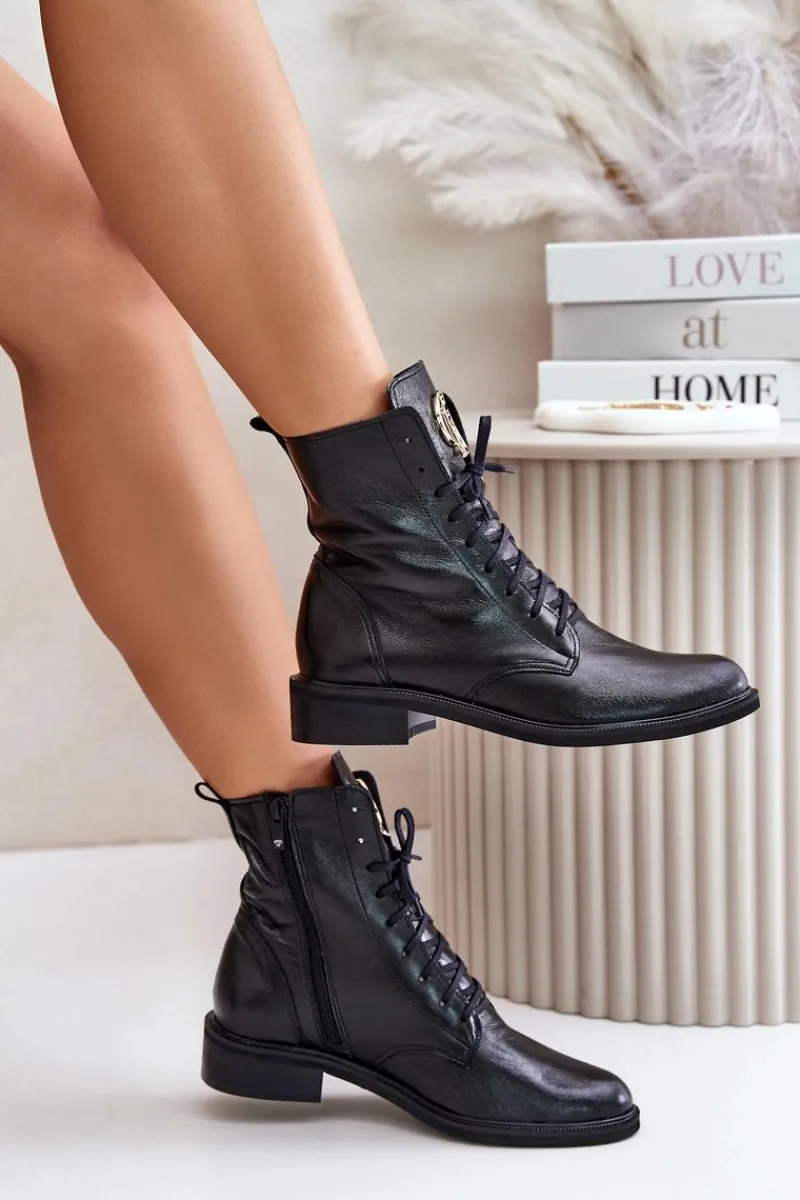 Damskie botki wykonane z wysokogatunkowej skóry naturalnej, które łączą elegancję i funkcjonalność. Model zapinany na zamek z dodatkowym sznurowaniem, co zapewnia idealne dopasowanie do stopy. Na języku umieszczono złoty detal, dodający subtelnego blasku i wyjątkowego charakteru. Przy wyborze rozmiaru prosimy sugerować się tabelą rozmiarów.