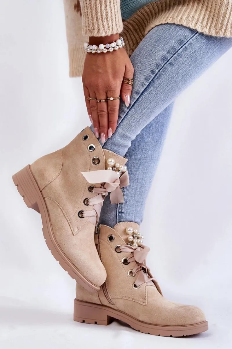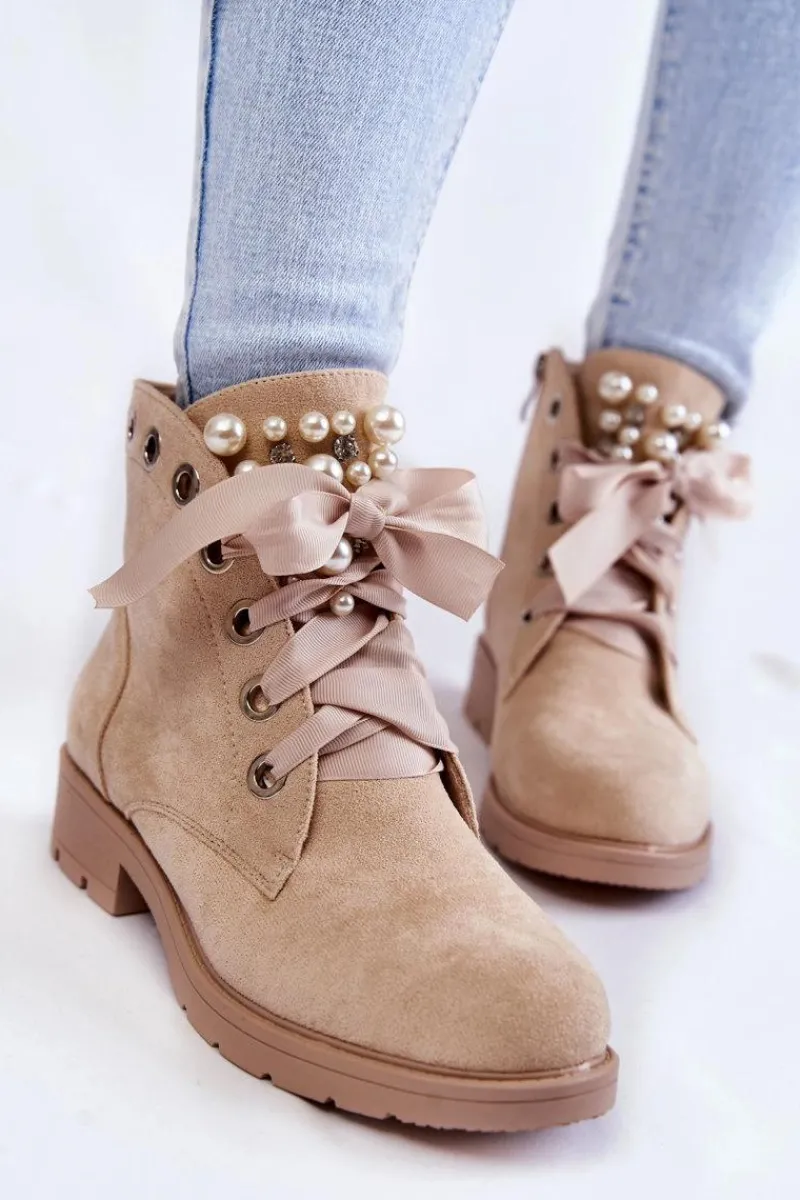 Damskie botki z pięknymi perełkami i dżetami imitującymi cyrkonie podkreślą każdą Twoją stylizację! Wykonane z eko skórzanych materiałów. Nieregularna cholewka została przyozdobiona metalowymi kółeczkami. Botki posiadają ocieplenie w postaci delikatnego koca obuwniczego. Osadzone na płaskim obcasie i delikatnej podeszwie. Ten świetny model nigdy nie wyjdzie z mody, dlatego powinnaś mieć te botki w swojej szafie! Przy wyborze rozmiaru prosimy sugerować się tabelą rozmiarów.
