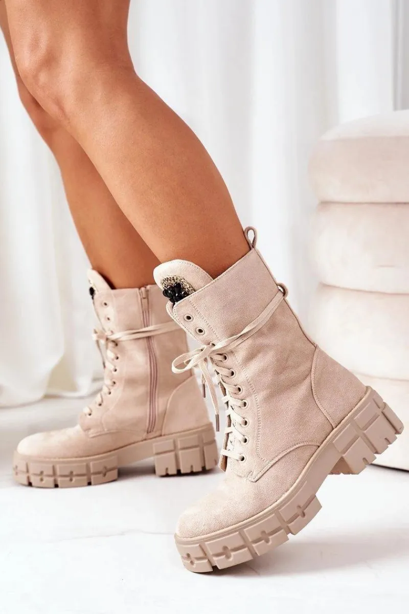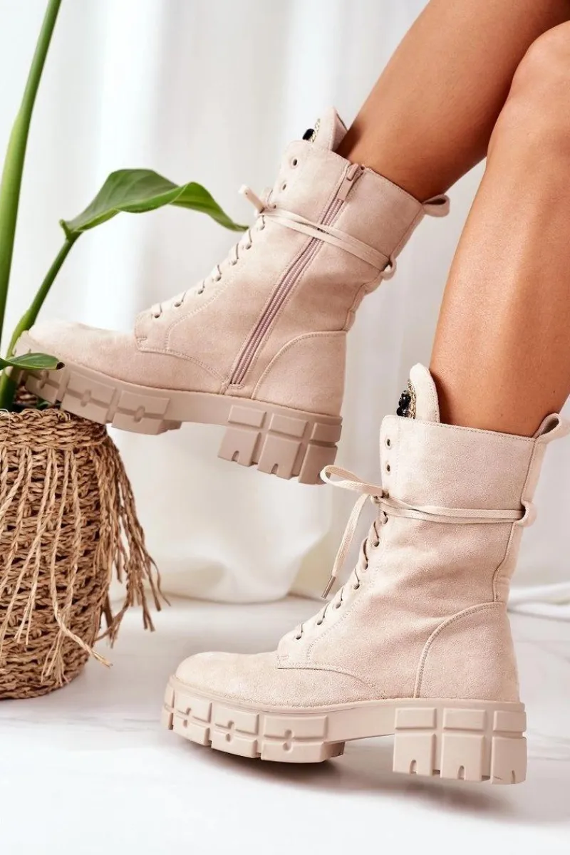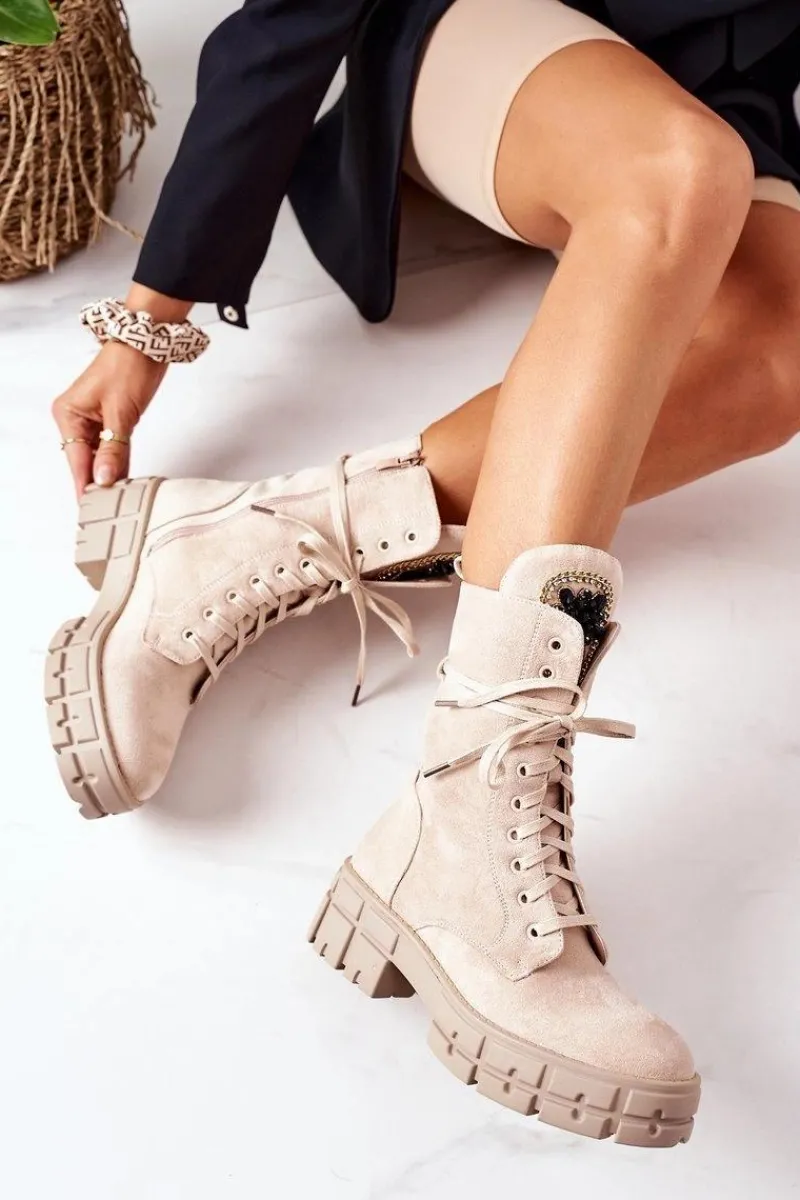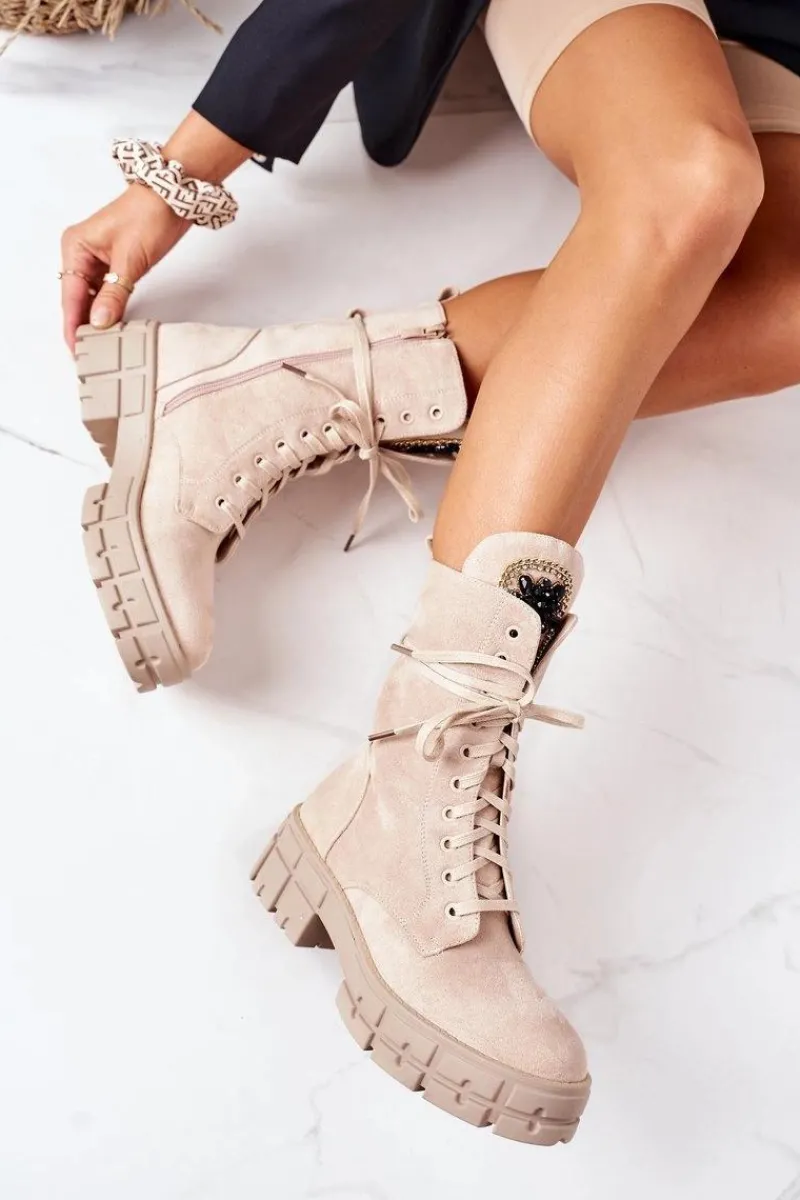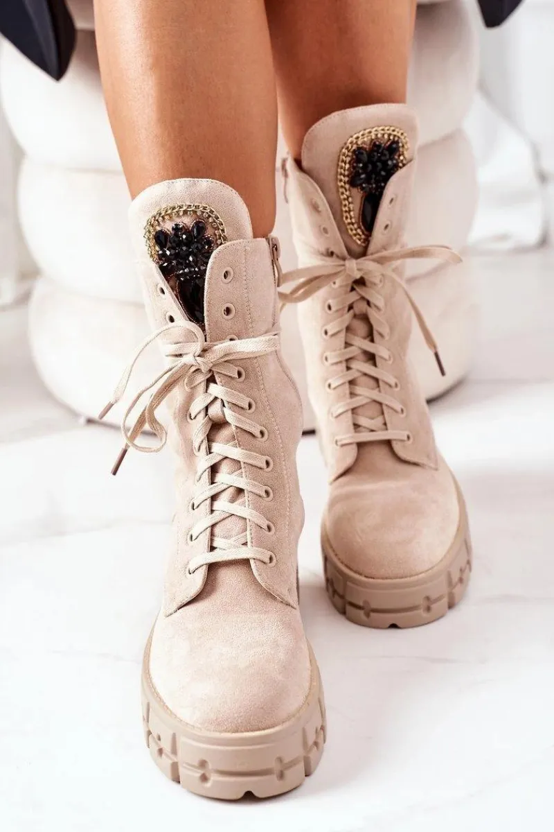 Botki Sznurowane|Botki Zimowe Damskie>Boto Zamszowe Ocieplane Workery Z Kamieniami Beżowe Hadley