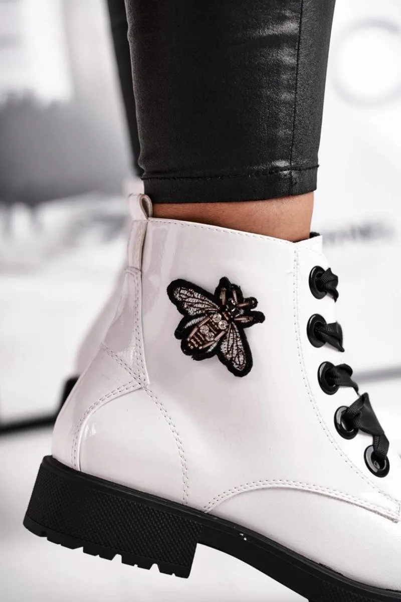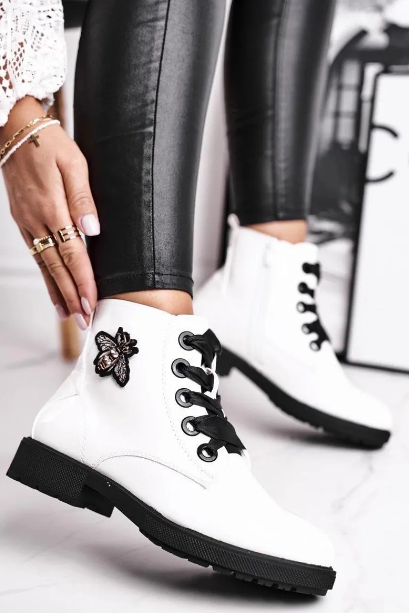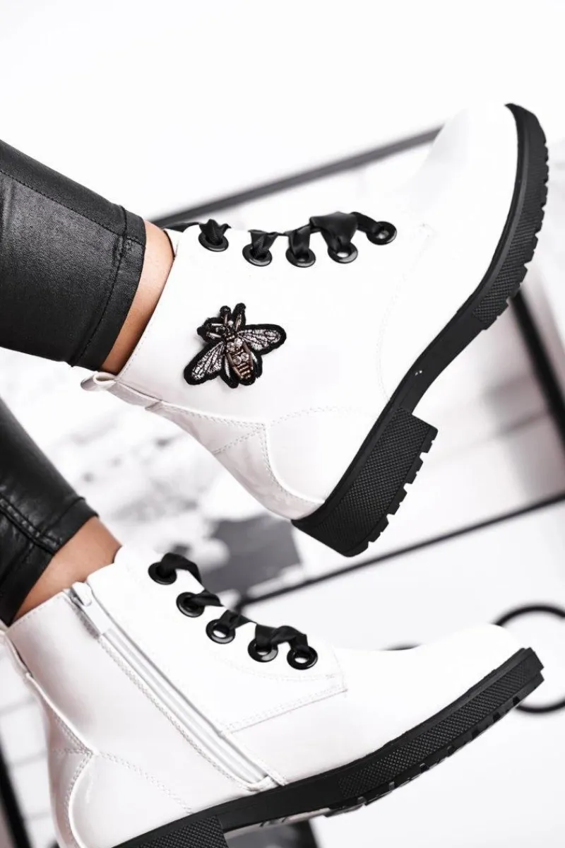 Mamy dla Was coś wyjątkowego! Sznurowane botki z suwakiem na boku, świetnie wpasują się w nadchodzące trendy. Wykonane z wysokiej jakości skóry ekologicznej. Zdobienie w postaci owada z boku cholewki. Mocna, antypoślizgowa podeszwa. Przy wyborze rozmiaru prosimy sugerować się tabelą rozmiarów, która dostępna jest po najechaniu bądź kliknięciu w dany rozmiar.