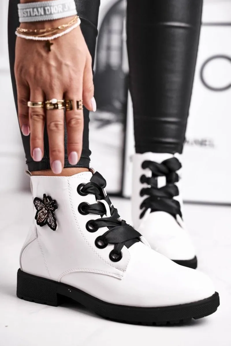 Botki Sznurowane|Botki Zimowe Damskie>Buty Sergio Leone Botki Damskie Płaski Obcas Glany Lakierowane Białe Sergio Leone BT530