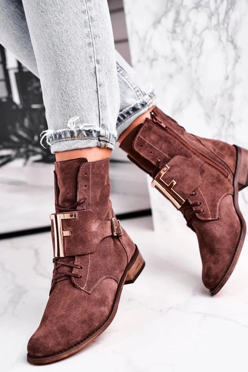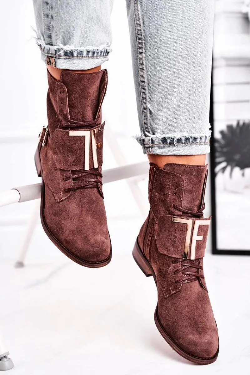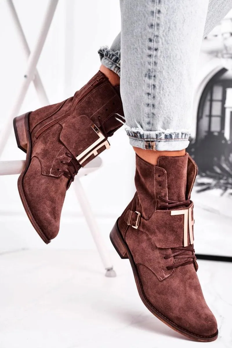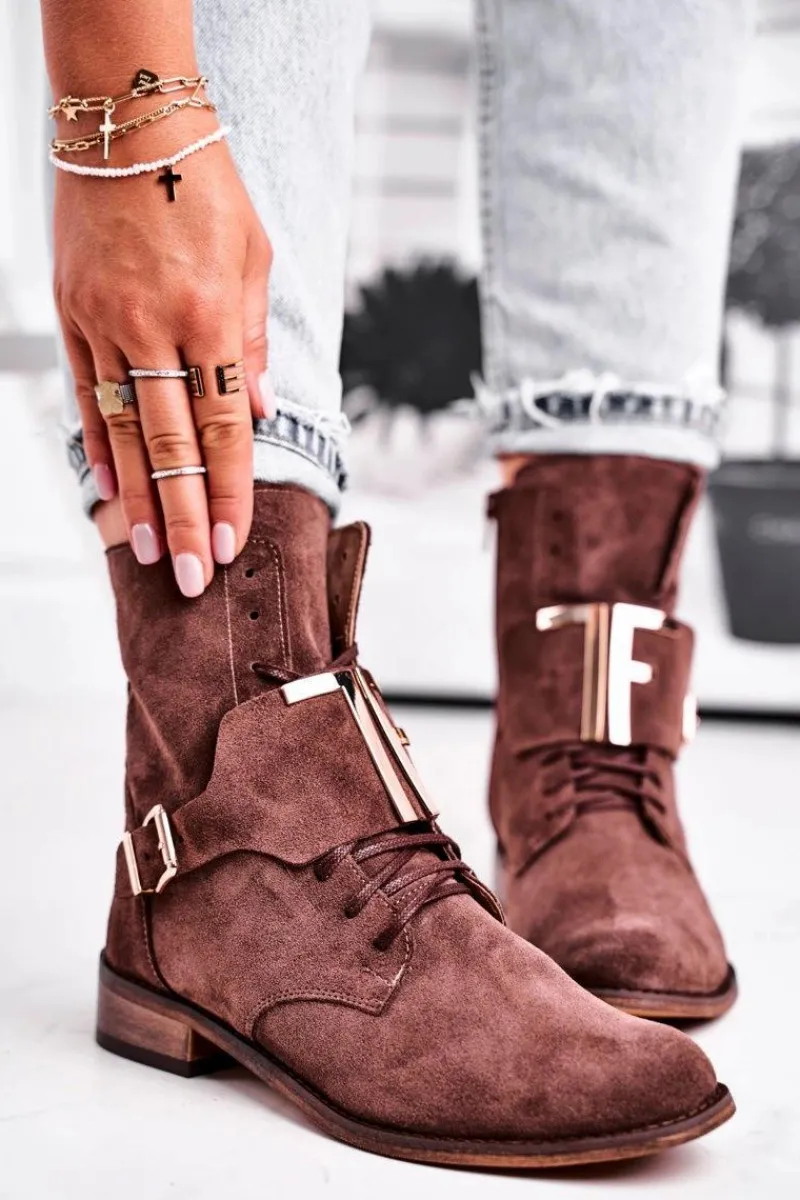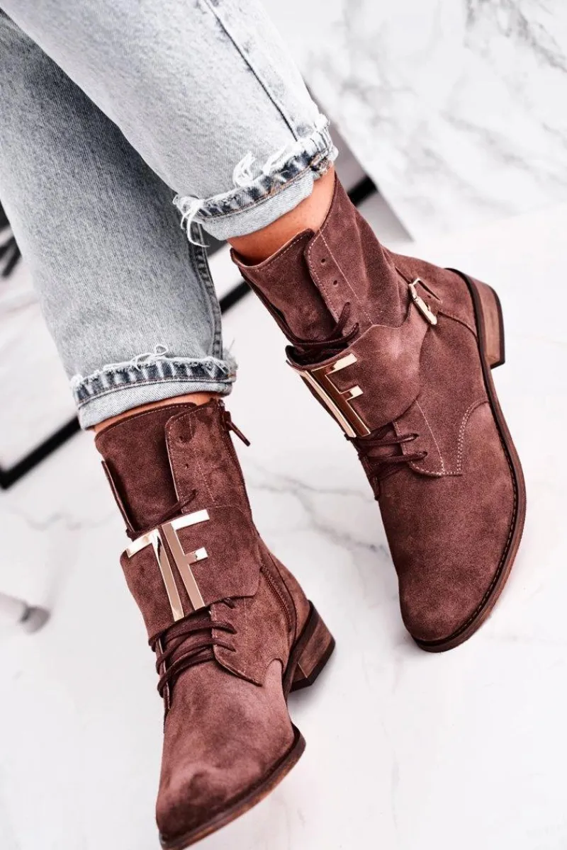 Buty zostały wykonane z naturalnego zamszu. Zdobienie w postaci dużej klamry oraz złotych literek pięknie podkreśla ich wyjątkowy styl. Zakładanie ułatwi wszyty na boku suwak, natomiast o lepsze dopasowanie zadbają sznurowadła. Botki oparte na delikatnym płaskim obcasie. Przy wyborze rozmiaru prosimy sugerować się tabelą rozmiarów.