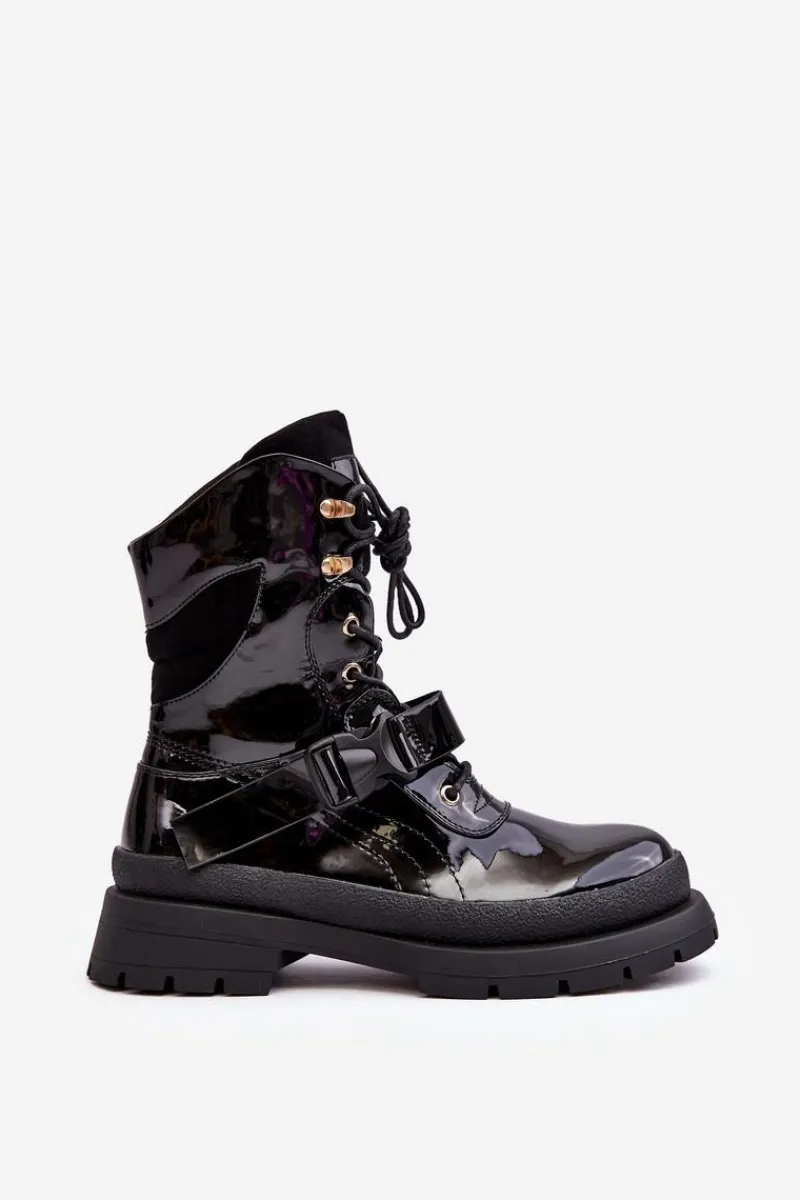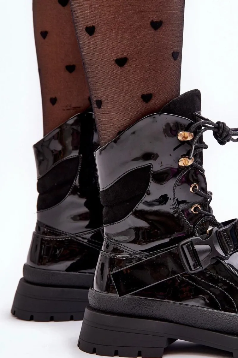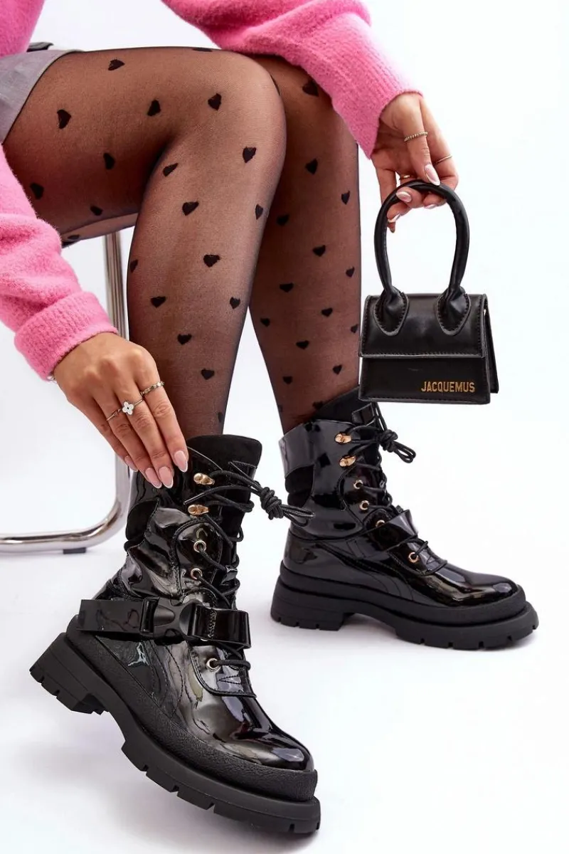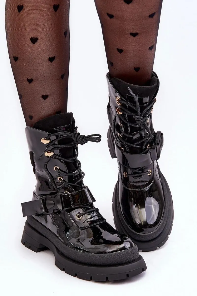 Damskie botki w stylu workerów zostały wykonane z eko skóry. Osadzone na płaskim obcasie oraz platformie ze żłobieniami. Model klasycznie sznurowany. Cholewka ozdobiona paskiem. Noski zaokrąglone. Zapiętek usztywniony. Ten model na pewno wykorzystasz w wielu stylizacjach! Przy wyborze rozmiaru prosimy sugerować się tabelą rozmiarów.