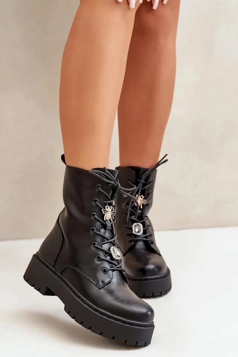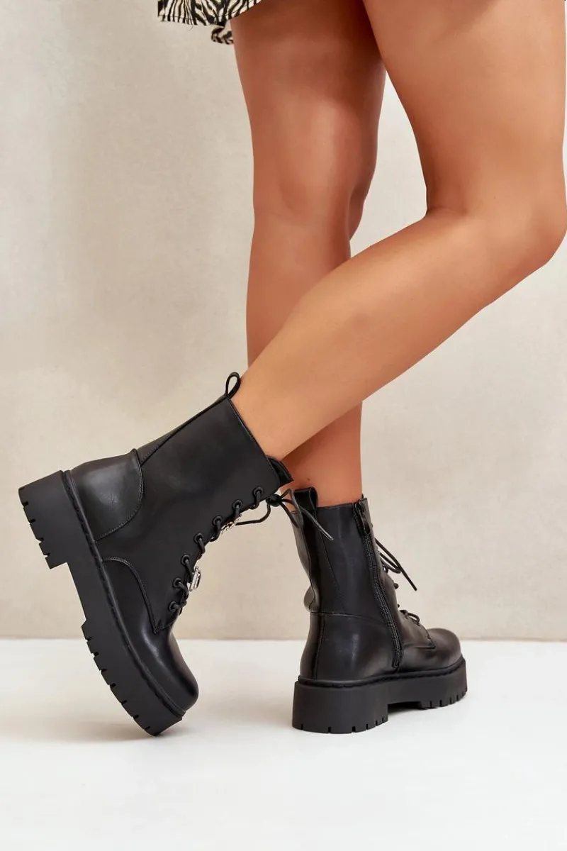Damskie botki wykonane z ekologicznej skóry. Posiadają płaski obcas i zaokrąglone noski, co zapewnia komfort noszenia. Dzięki bocznemu suwakowi zakładanie jest szybkie i proste, a dodatkowe sznurowanie z ozdobnymi przypinkami dodaje unikalnego charakteru. Środek ocieplony kocem obuwniczym. Doskonale uzupełnią Twoje outfity w chłodniejsze dni.Przy wyborze rozmiaru prosimy sugerować się tabelą rozmiarów.