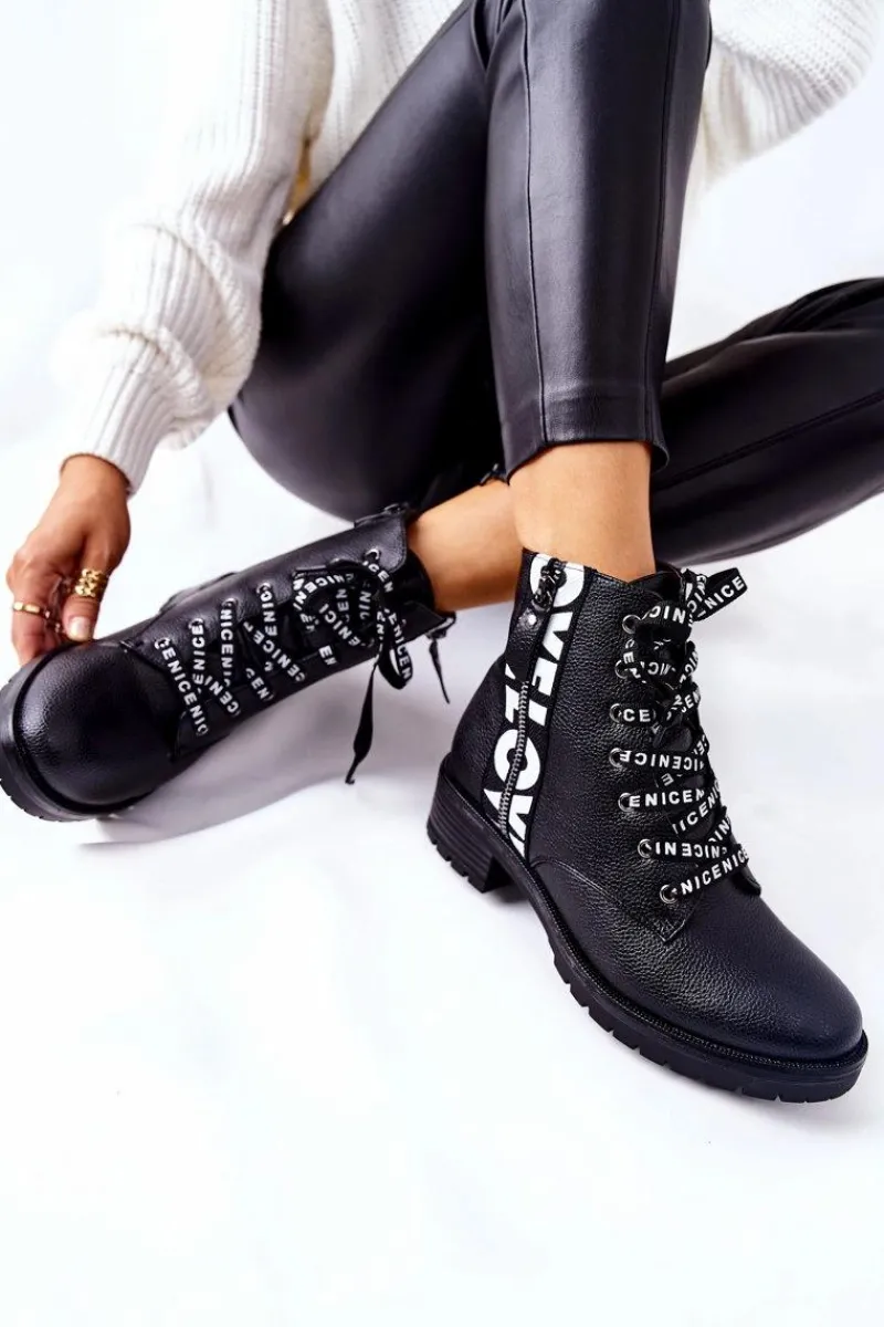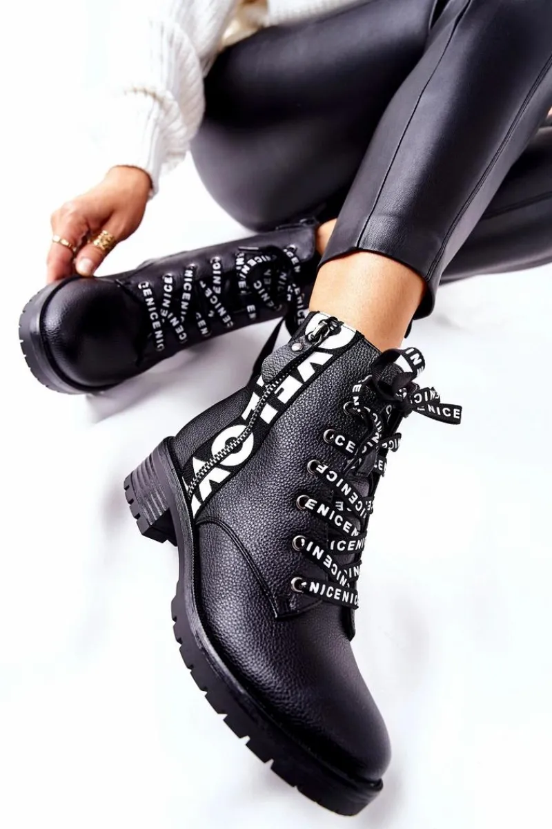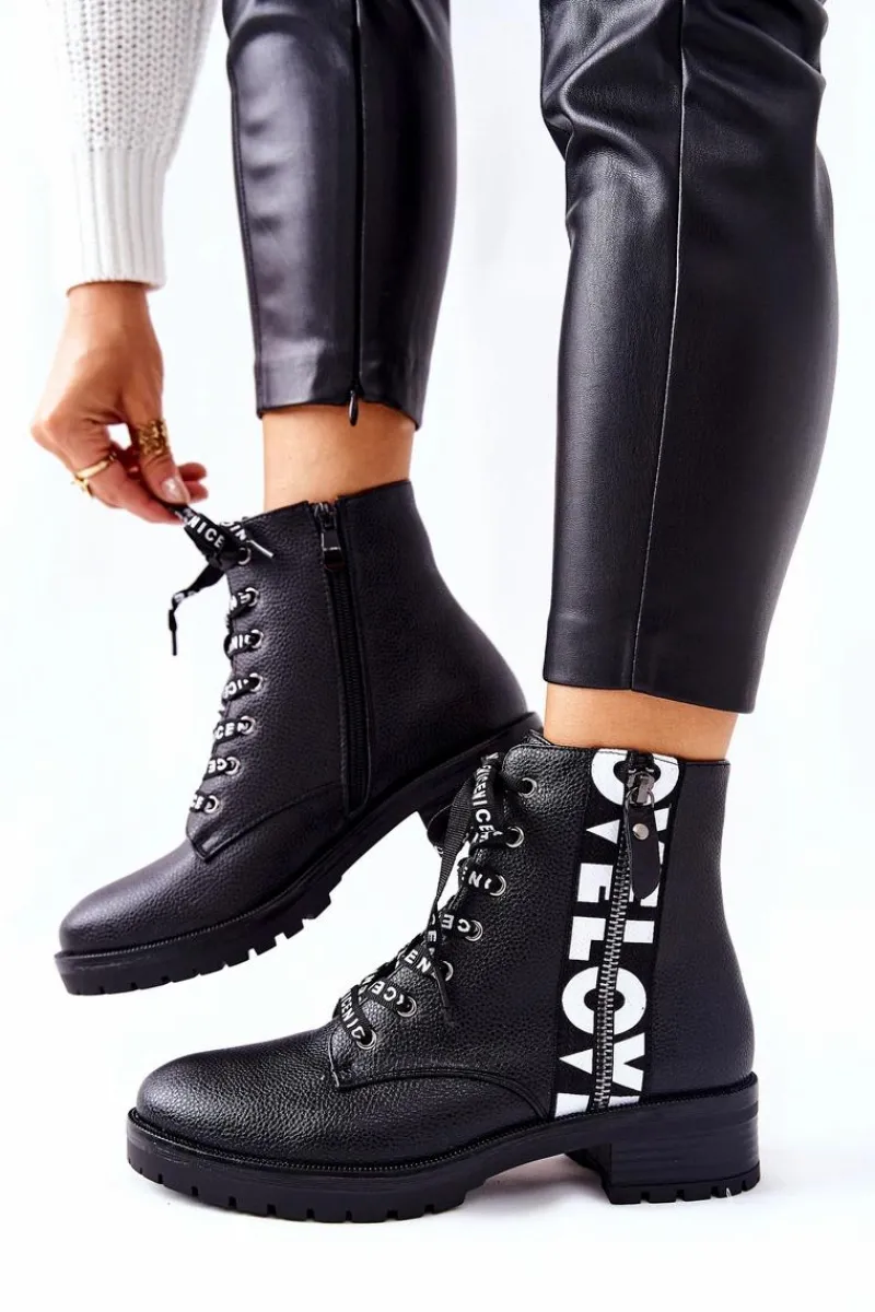 Piękne botki workery zostały wykonane z zewnątrz z eko skóry, natomiast w środku z materiału tekstylnego. Posiadają dwa suwaki, choć jeden z nich jest elementem ozdobnym. Ciekawy wzór na sznurówkach oraz z boku cholewki sprawia, że są naprawdę wyjątkowe. Workery są ocieplone kocem obuwniczym oraz posiadają miękką wkładkę. Przy wyborze rozmiaru prosimy sugerować się tabelą rozmiarów.