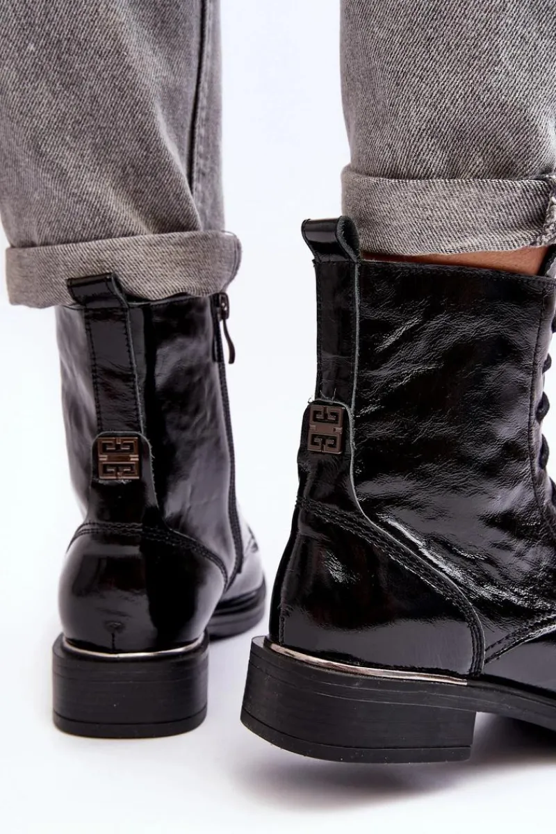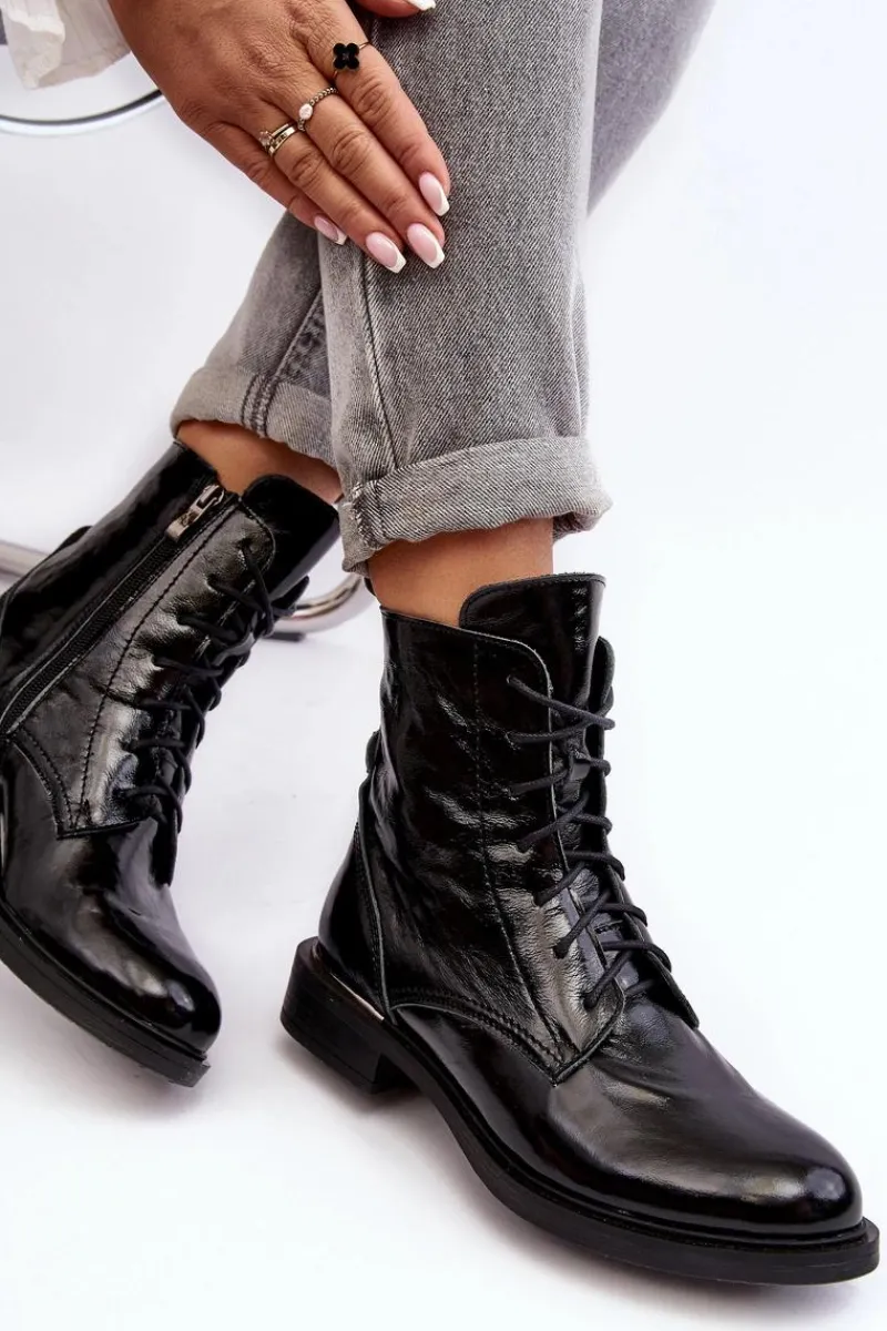 Klasyczne botki damskie zostały wykonane z wysokiej jakości naturalnych skór. Model ten posiada klasyczne sznurowanie oraz suwak z boku cholewki. Usztywniany zapiętek zapewni stabilizację stopy. Botki zostały ocieplone kocem obuwniczym. Osadzone na płaskim obcasie i delikatnej platformie. Przy wyborze rozmiaru prosimy sugerować się tabelą rozmiarów.
