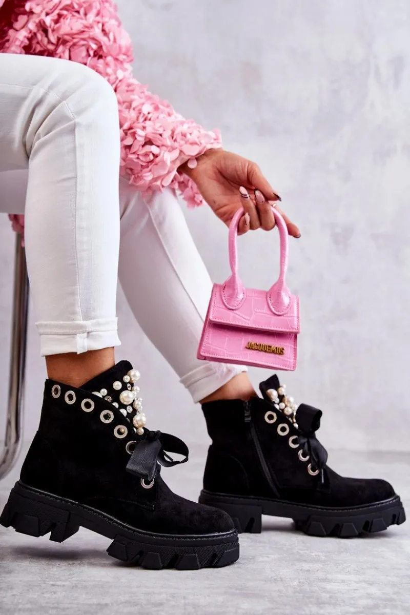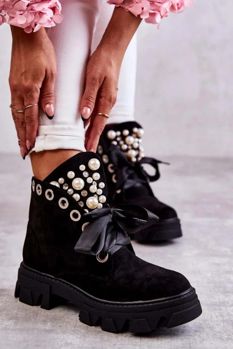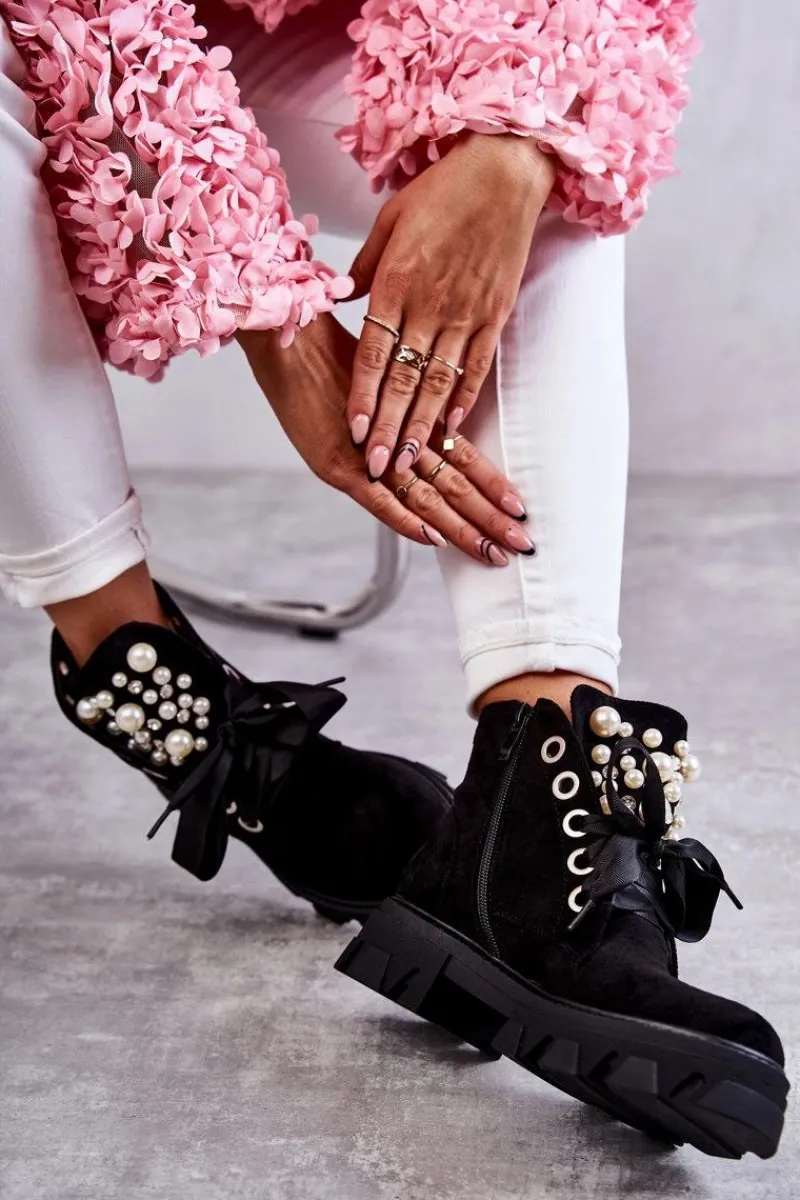 Wyjątkowe botki damskie wykonane z eko zamszu. Wnętrze ocieplone jest miłym w dotyku kocem obuwniczym. Model wyróżnia się krojem cholewki oraz elementami w postaci perełek i ćwieków. Ozdobna wstążka świetnie dopełnia całość. Zapinane także na suwak z boku cholewki. Osadzone na platformie i płaskim obcasie. Ten model musi być Twój! Nie czekaj dłużej aż zniknie! Przy wyborze rozmiaru prosimy sugerować się tabelą rozmiarów.