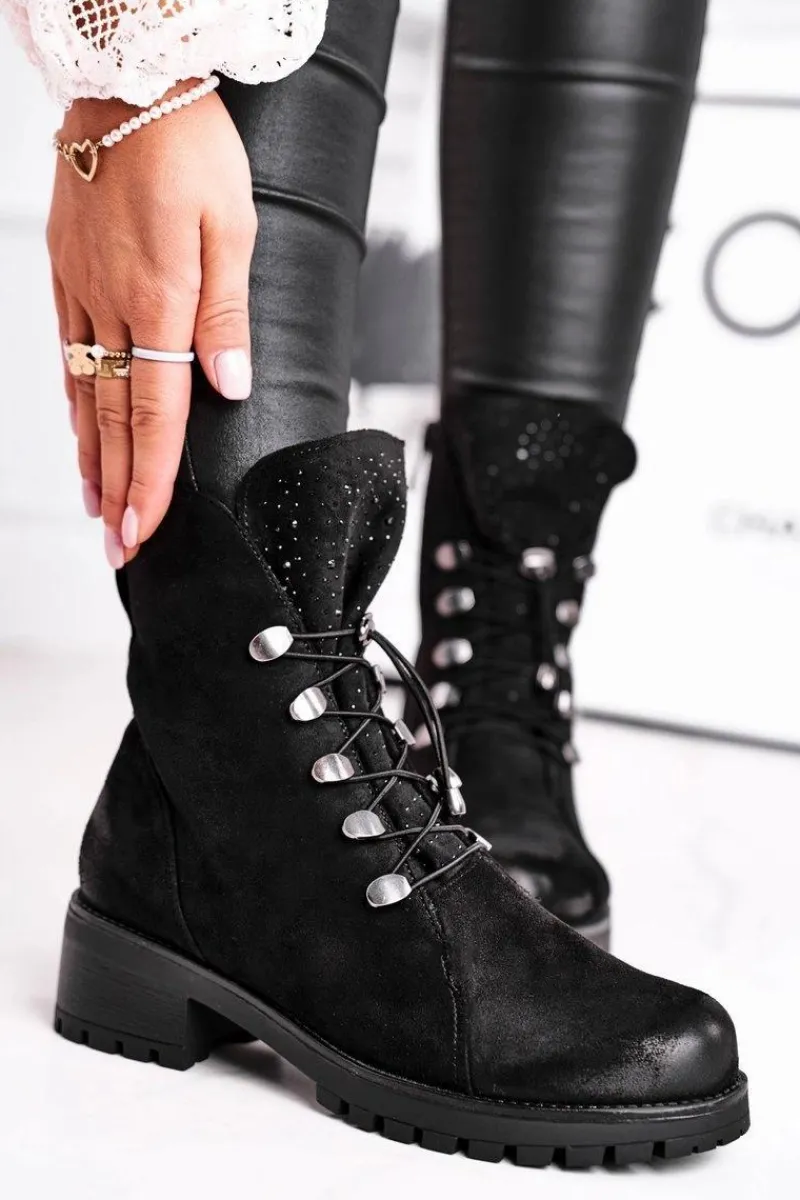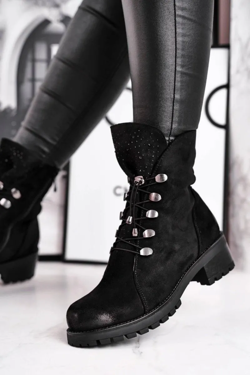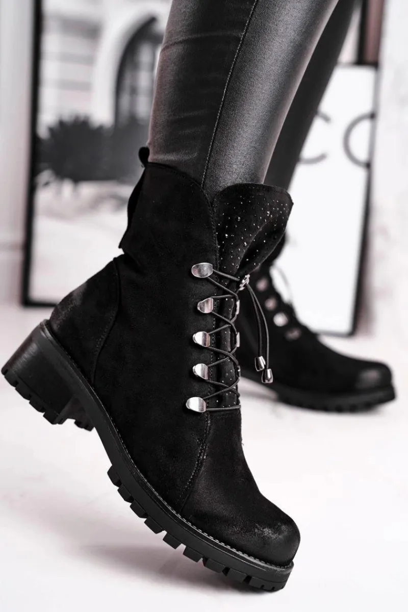 Botki Sznurowane|Czarne Botki>Damskie buty S.Barski Botki Damskie Workery Ciepłe Czarne Bipper