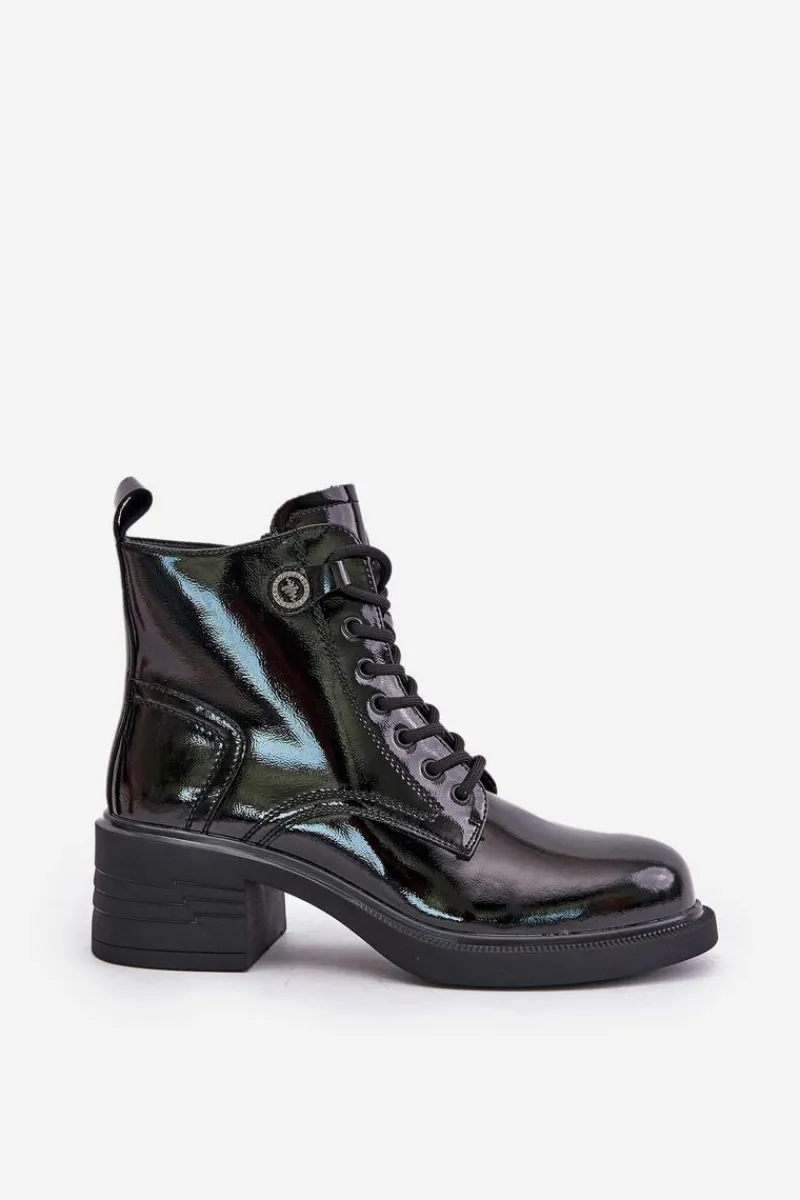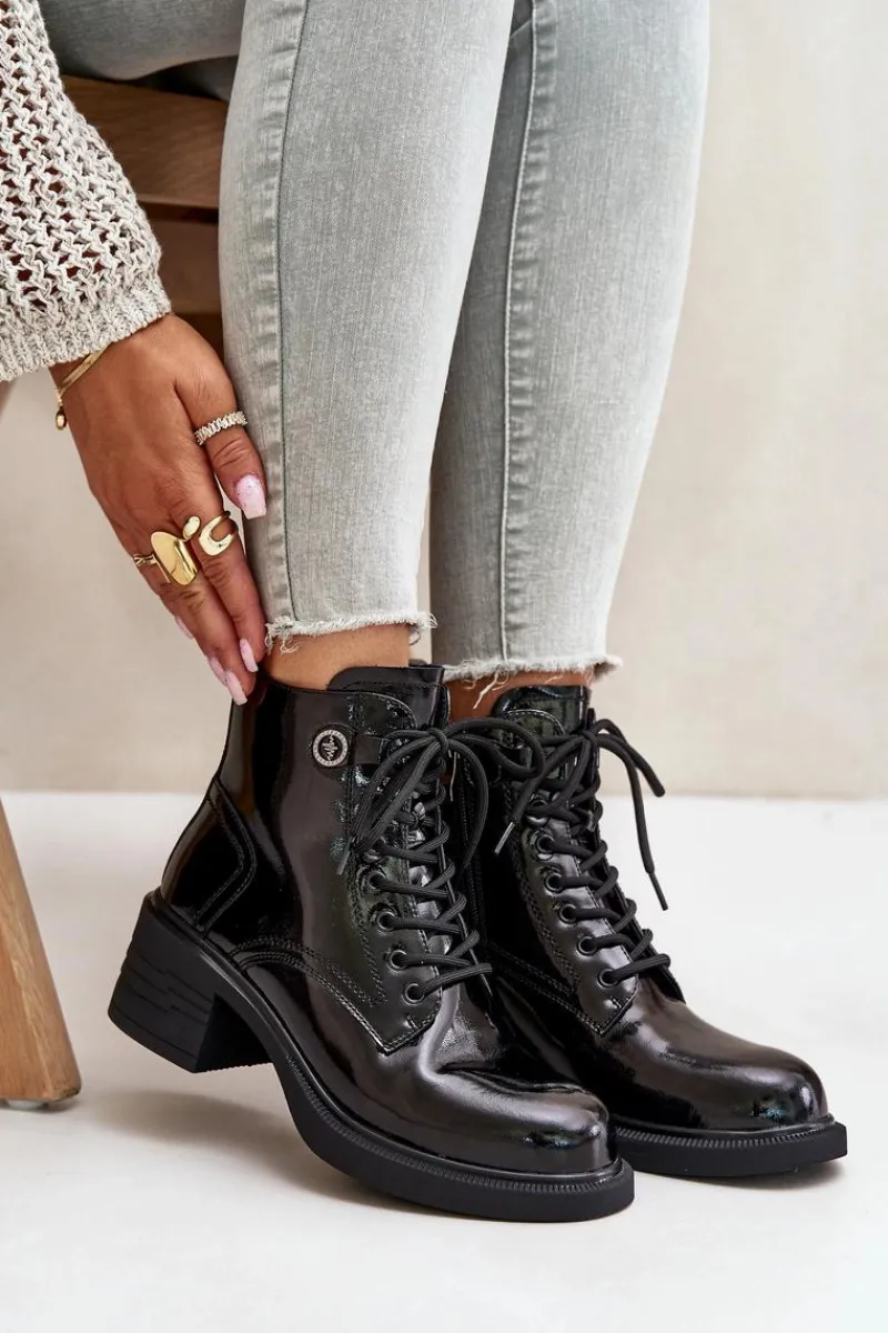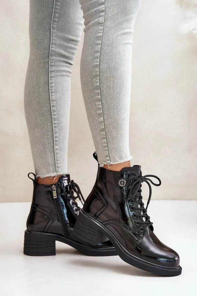 Botki damskie wykonane z naturalnej skóry. Osadzone na obcasie w formie klocka. Zapinane na zamek oraz dodatkowo posiadają sznurowanie, co zapewni idealne dopasowanie do stopy. Środek ocieplany kocem obuwniczym. Noski zaokrąglone. Na górze cholewki znajduje się mały, ozdobny detal. Model ten dopasujesz do wielu jesienno-zimowych stylizacji! Przy wyborze rozmiaru prosimy sugerować się tabelą rozmiarów