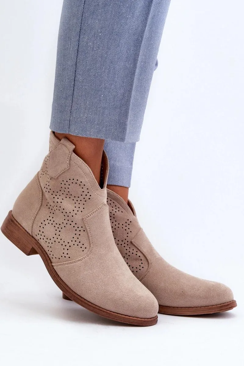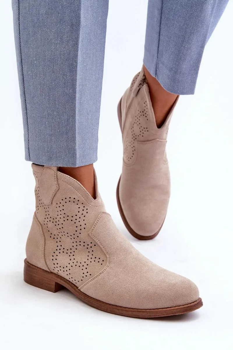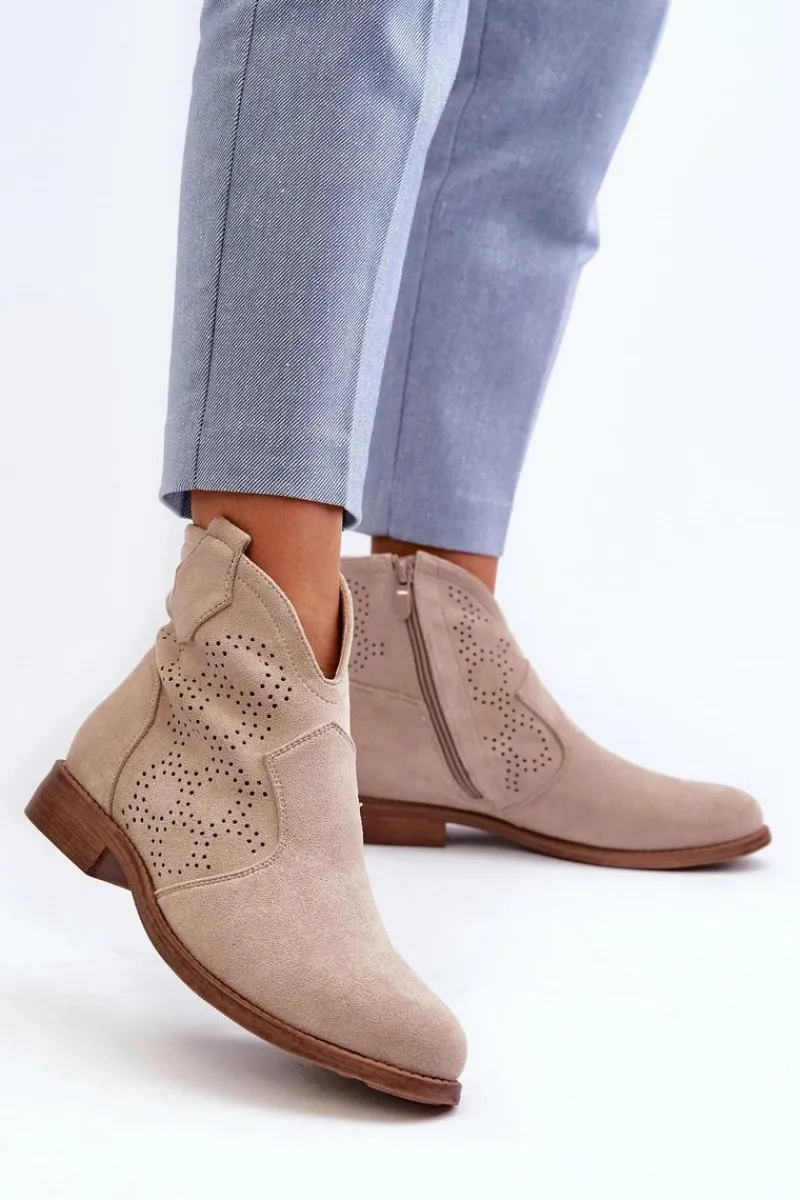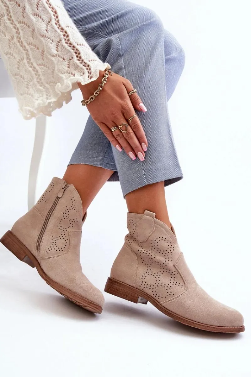 Botki damskie wykonane z eko zamszu to idealny wybór na wiosenne dni. Ażurowa cholewka nadaje im delikatności. Płaski obcas zapewnia stabilność i komfort użytkowania. Zapinanie na zamek ułatwia szybkie zakładanie i zdejmowanie obuwia. Te modne botki będą doskonałym uzupełnieniem Twojej wiosennej garderoby! Koniecznie powinnaś je mieć! Przy wyborze rozmiaru prosimy sugerować się tabelą rozmiarów.