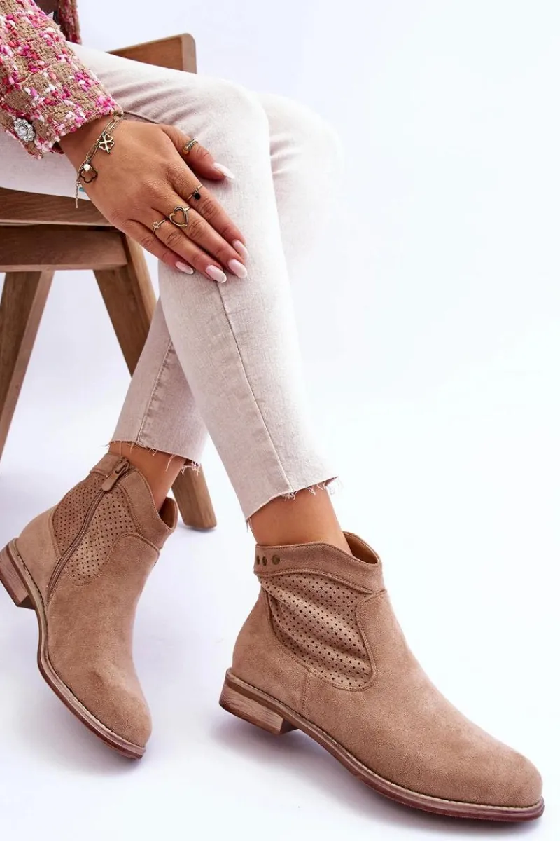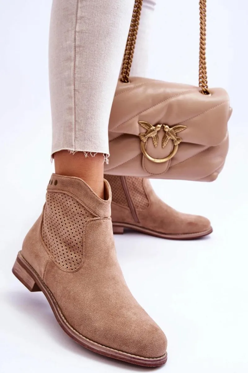 Klasyczne botki wykonane z miłego w dotyku eko zamszu z ażurową cholewką. Posiadają ozdobne elementy w postaci ćwieków. Osadzone na płaskim obcasie. Dodatkowo botki posiadają usztywniany zapiętek. Z boku cholewki znajduje się suwak ułatwiający zakładanie obuwia. Koniecznie sprawdź także pozostałe modele botków dostępnych w naszej ofercie! Przy wyborze rozmiaru prosimy sugerować się tabelą rozmiarów.