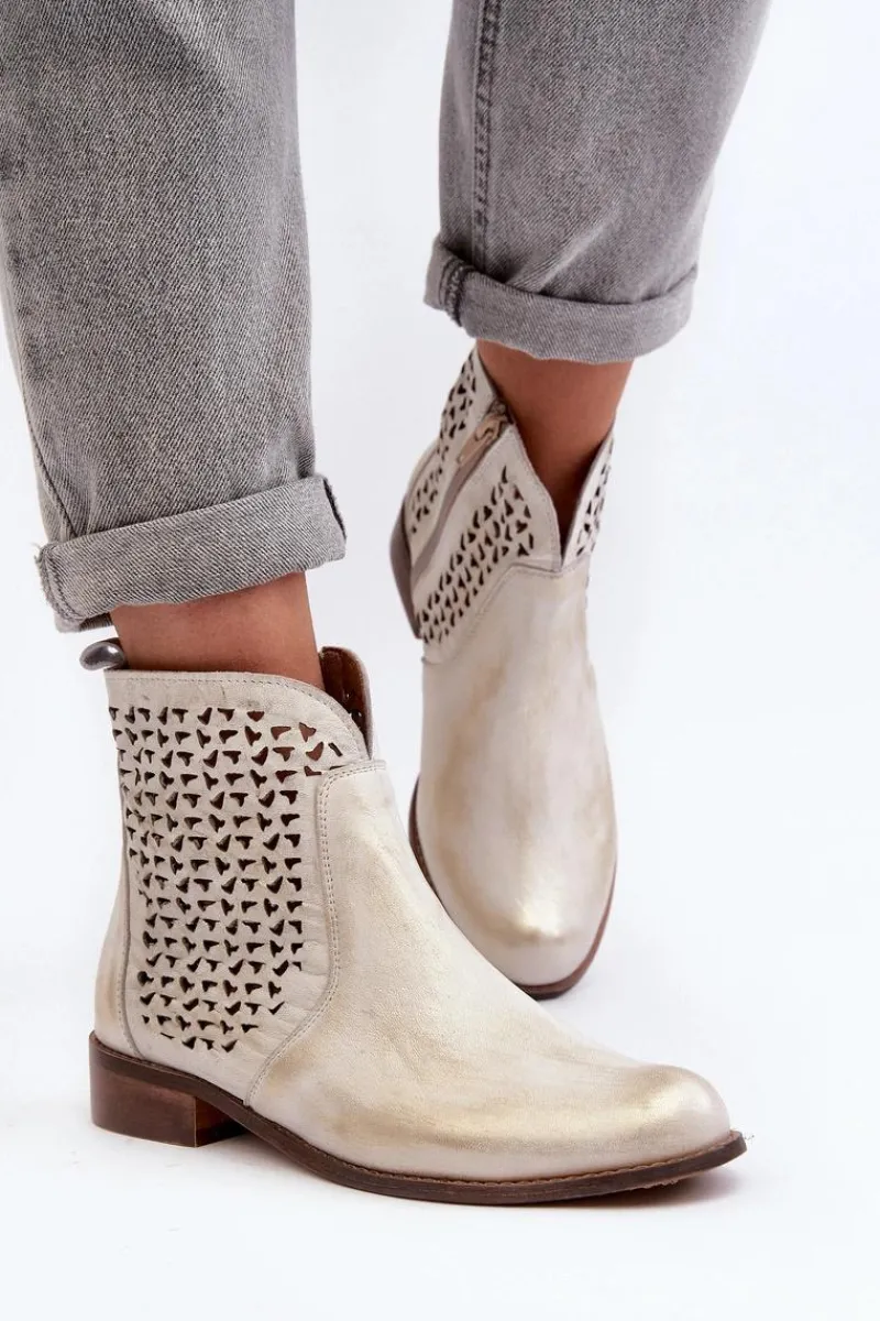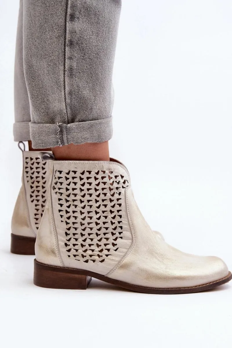 Botki zostały wykonane ze skóry naturalnej. Zakładanie ułatwi wszyty na boku suwak. Botki posiadają ażurowy wzorek. Posiadają płaski obcas oraz wygodną, wykonaną z naturalnej skóry wkładkę. Ten niezwykle komfortowy model powinien znaleźć się w Twojej szafie! Przy wyborze rozmiaru prosimy sugerować się tabelą rozmiarów.