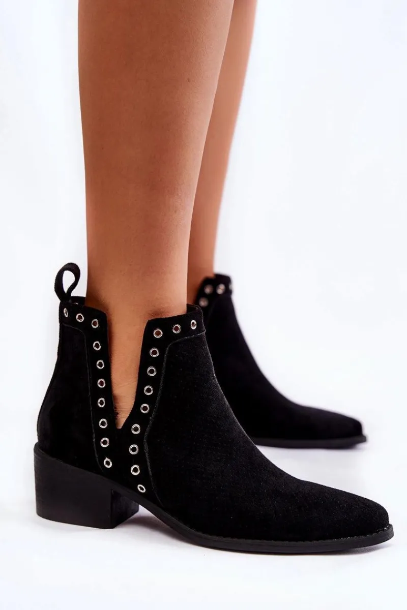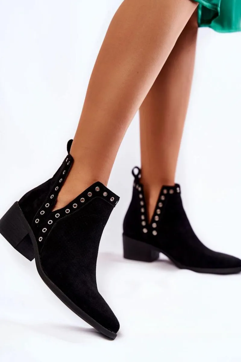Piękne botki damskie z wycięciami wykonane z eko zamszu. Miękka wkładka oraz wygodny obcas zadbają o Twój komfort. Przy wyborze rozmiaru prosimy sugerować się tabelą rozmiarów.