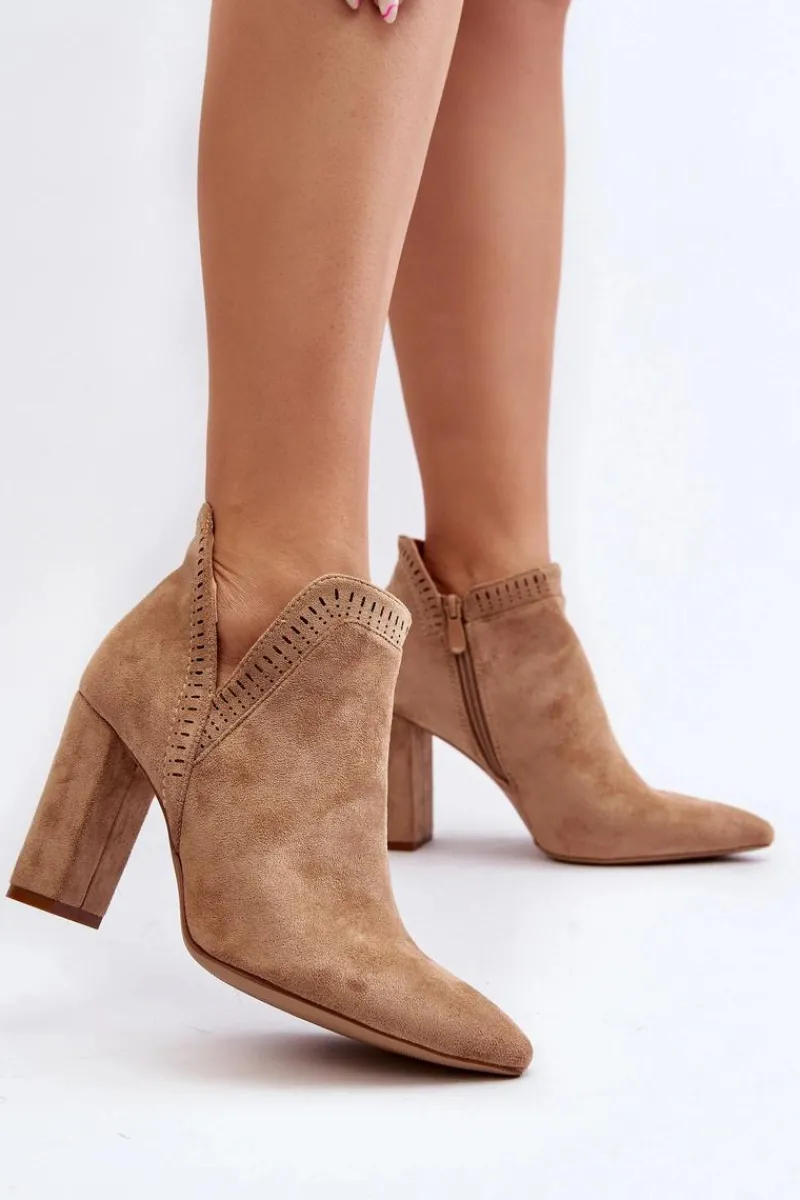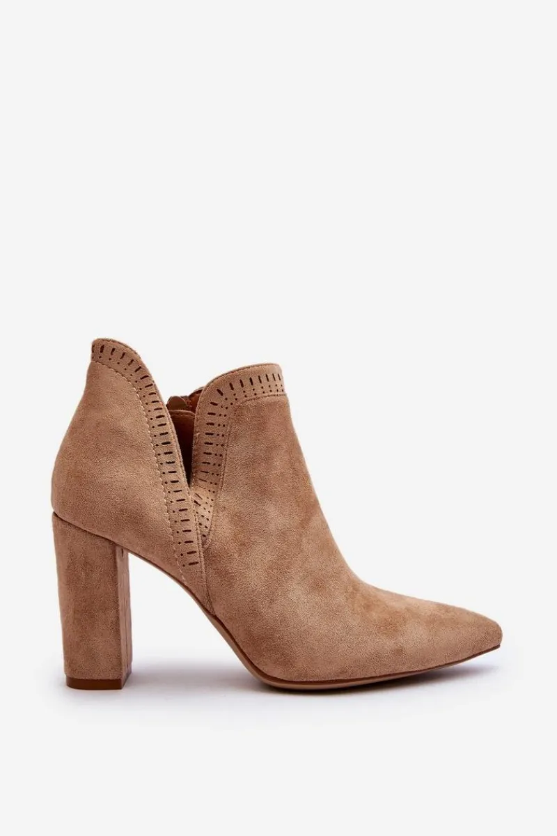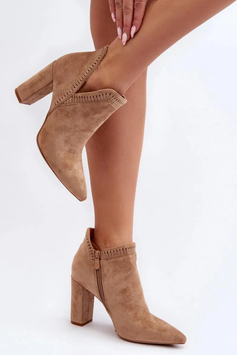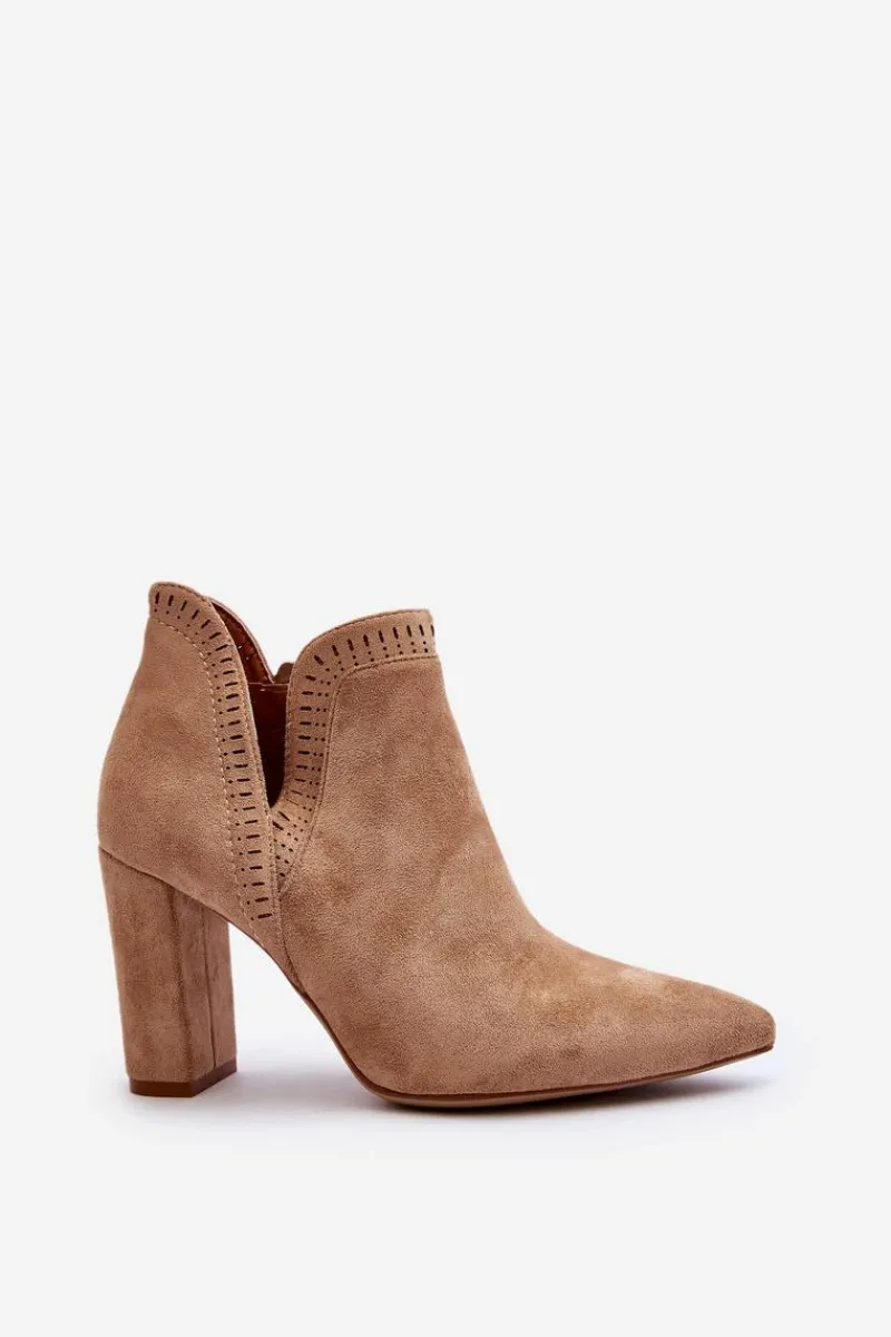 Botki damskie wykonane z miłego w dotyku eko zamszu. Osadzone na obcasie w postaci słupka. Noski w szpic optycznie wysmuklą nogi. Cholewka za kostkę z wycięciem oraz ażurowym wzorkiem. Zapinane na suwak z boku. Dodatkowo model ten posiada usztywniony zapiętek. Miękka wkładka zapewni wygodę podczas noszenia. Idealne do wiosennych stylizacji. Koniecznie musisz je mieć! Przy wyborze rozmiaru prosimy sugerować się tabelą rozmiarów.