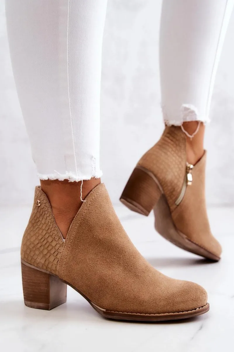 Wyjątkowe botki wykonane z naturalnej zamszowej skóry. Wnętrze zostało pokryte skórą naturalną i materiałem tekstylnym, co sprawia, że są bardzo komfortowe podczas użytkowania. Miękka, skórzana wkładka wykonana została ze skóry naturalnej. Z boku cholewki znajduje się zamek błyskawiczny, który ułatwia zakładanie obuwia. Obcas w postaci słupka zapewnia stabilizację. Tłoczona faktura oraz modny fason w stylu kowbojek zachwyci każdego.Przy wyborze rozmiaru prosimy sugerować się tabelą rozmiarów.
