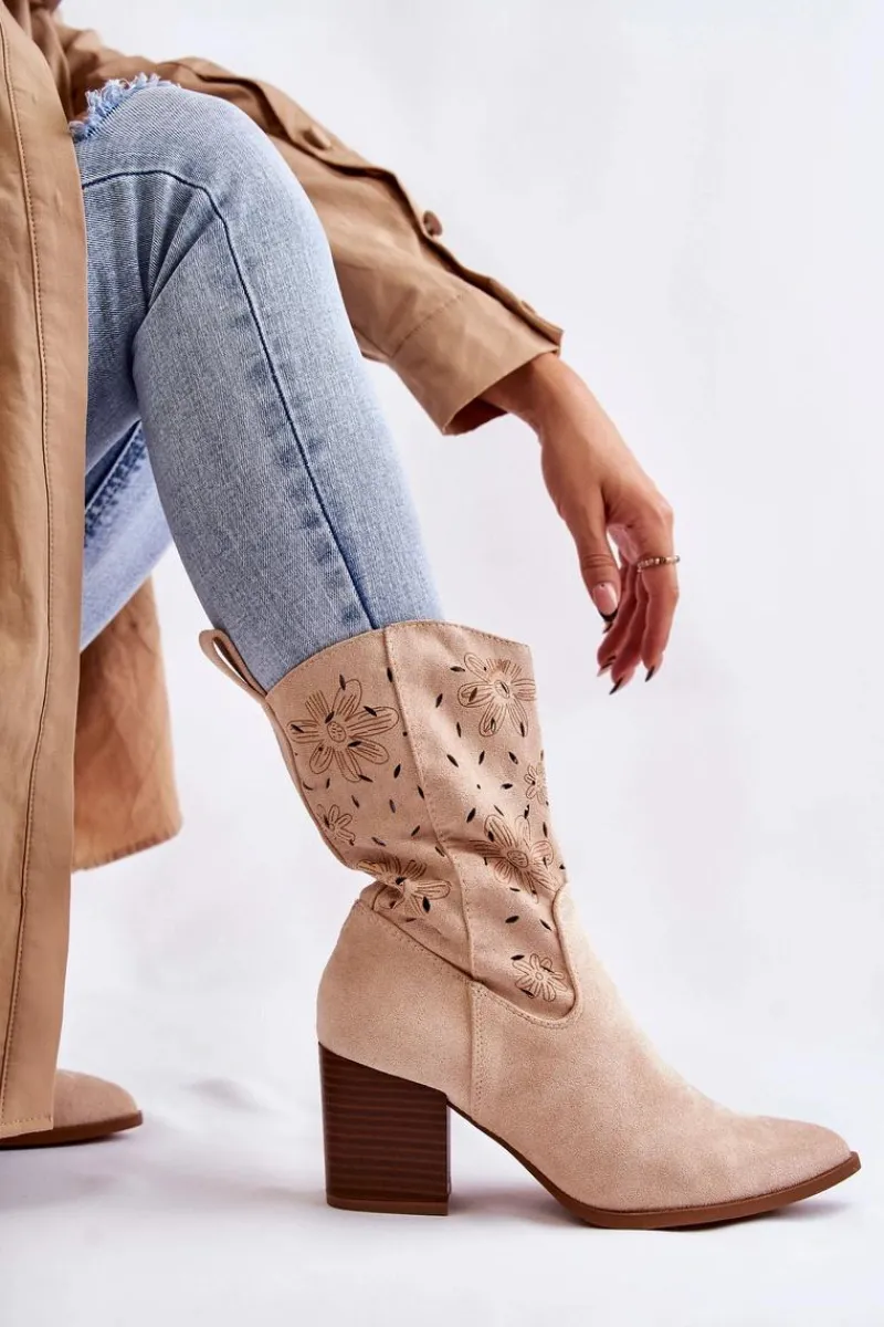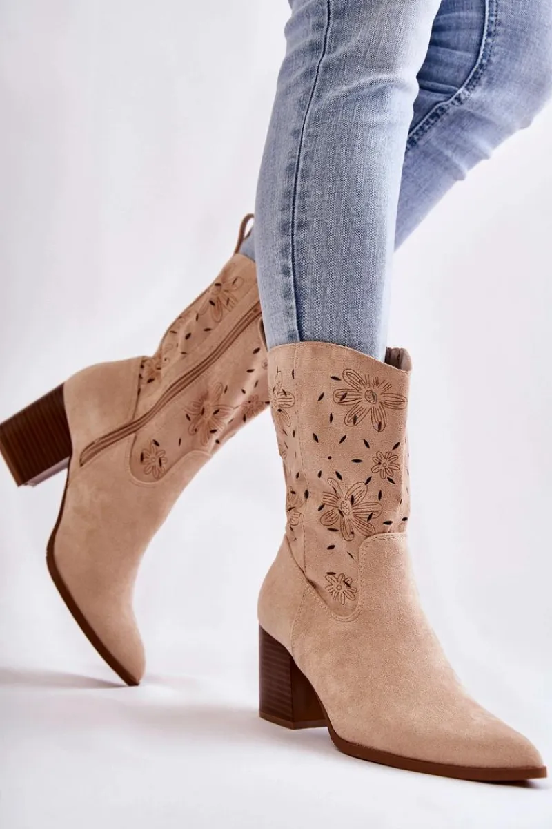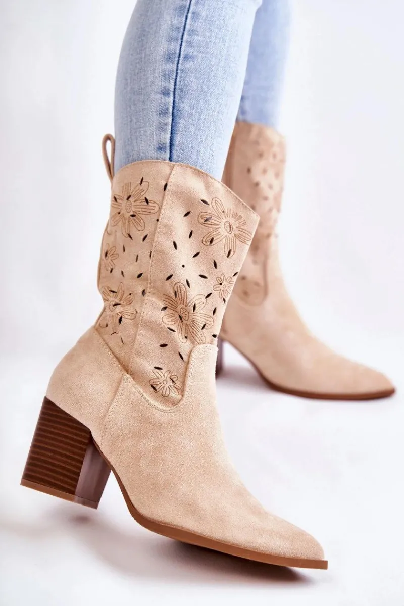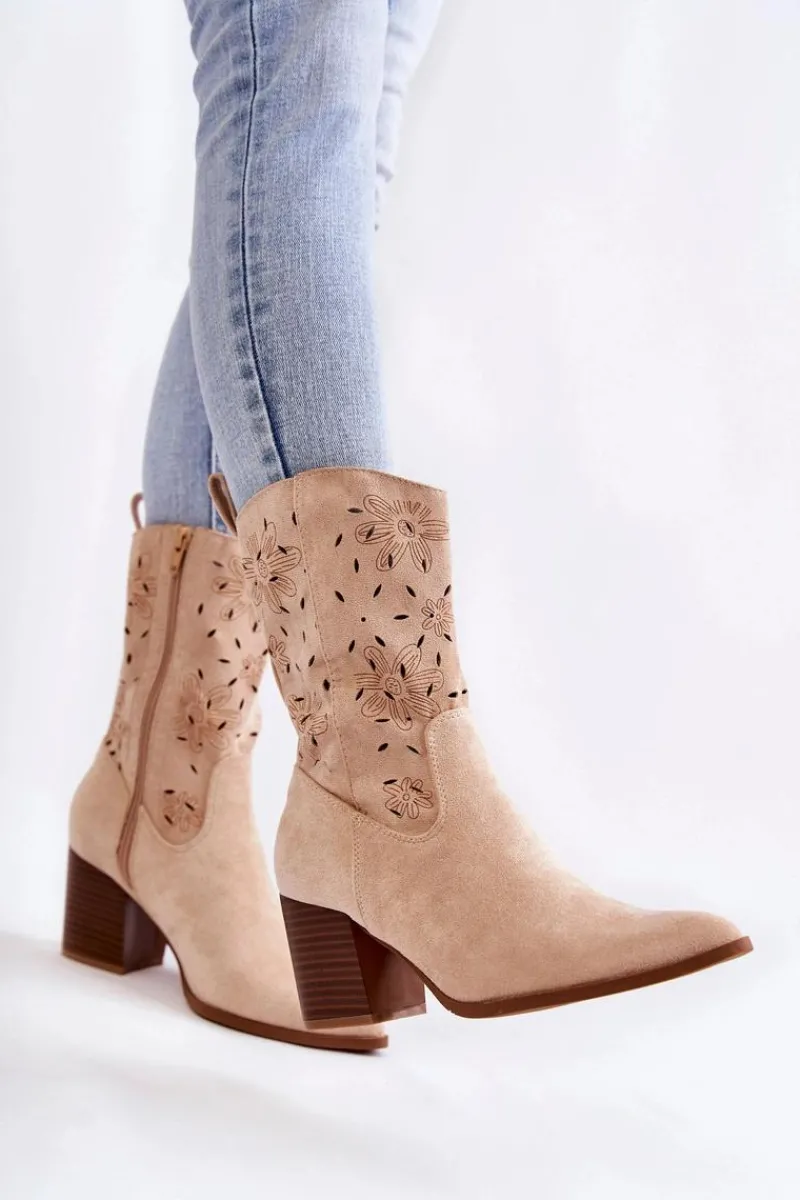 Botki Wiosenne|Botki Na Słupku>Boto Damskie Zamszowe Botki Kowbojki W Kwiaty Beżowe Ariane
