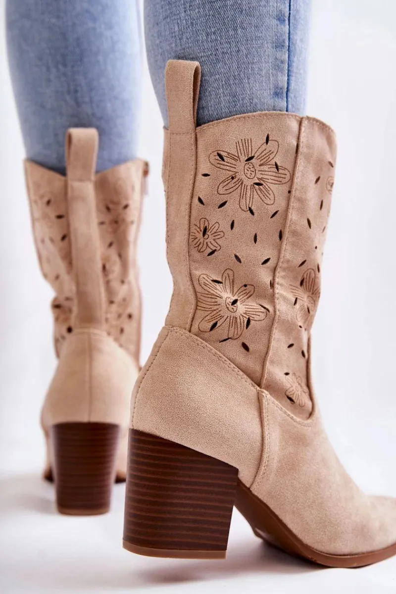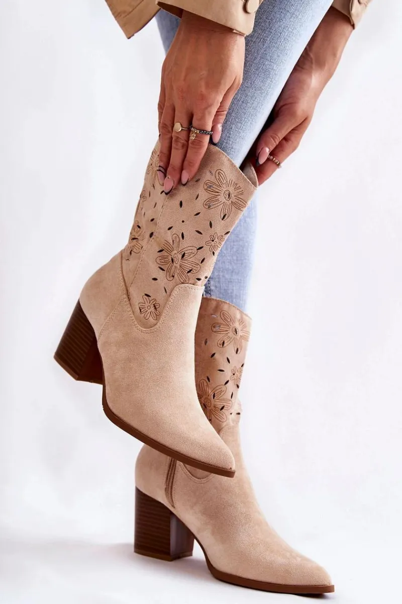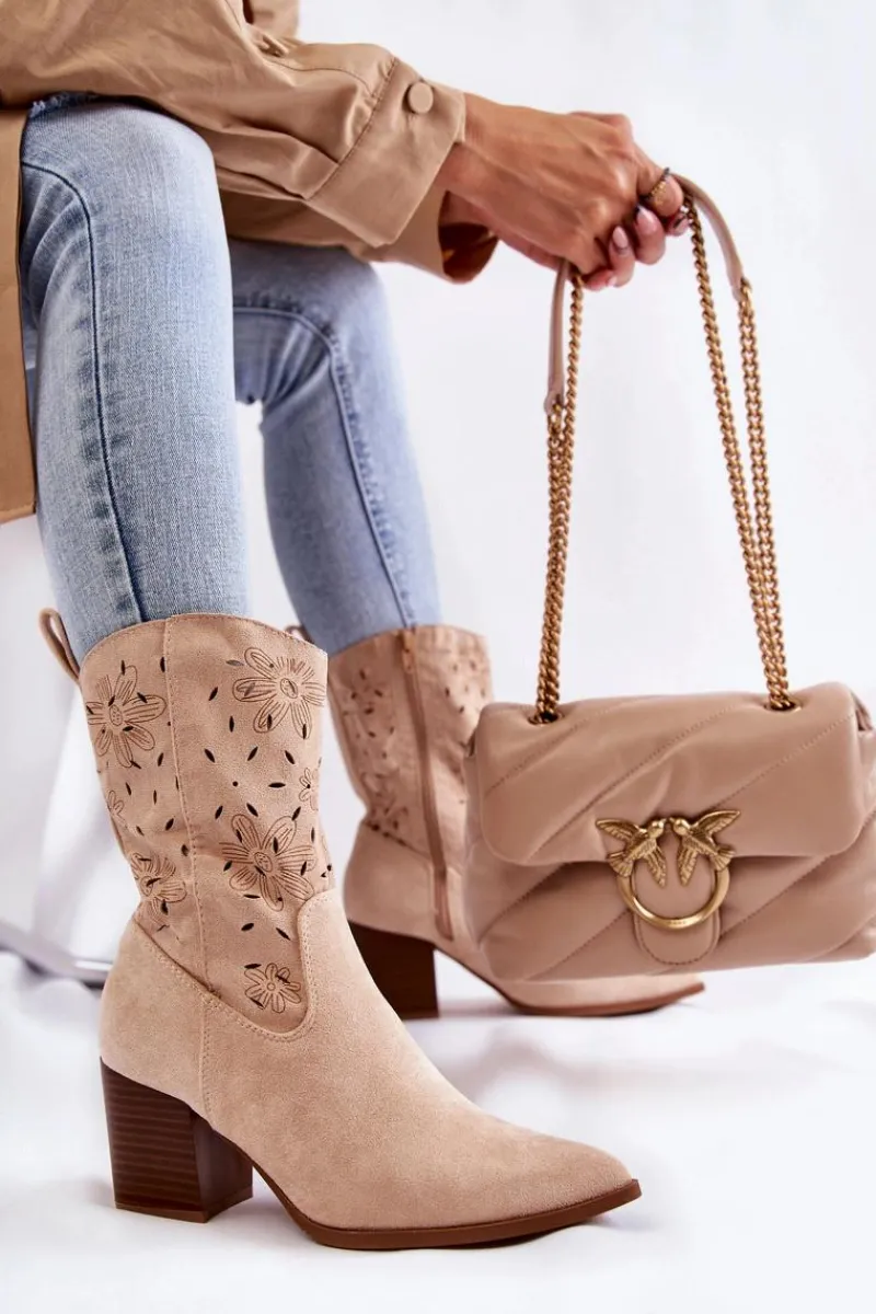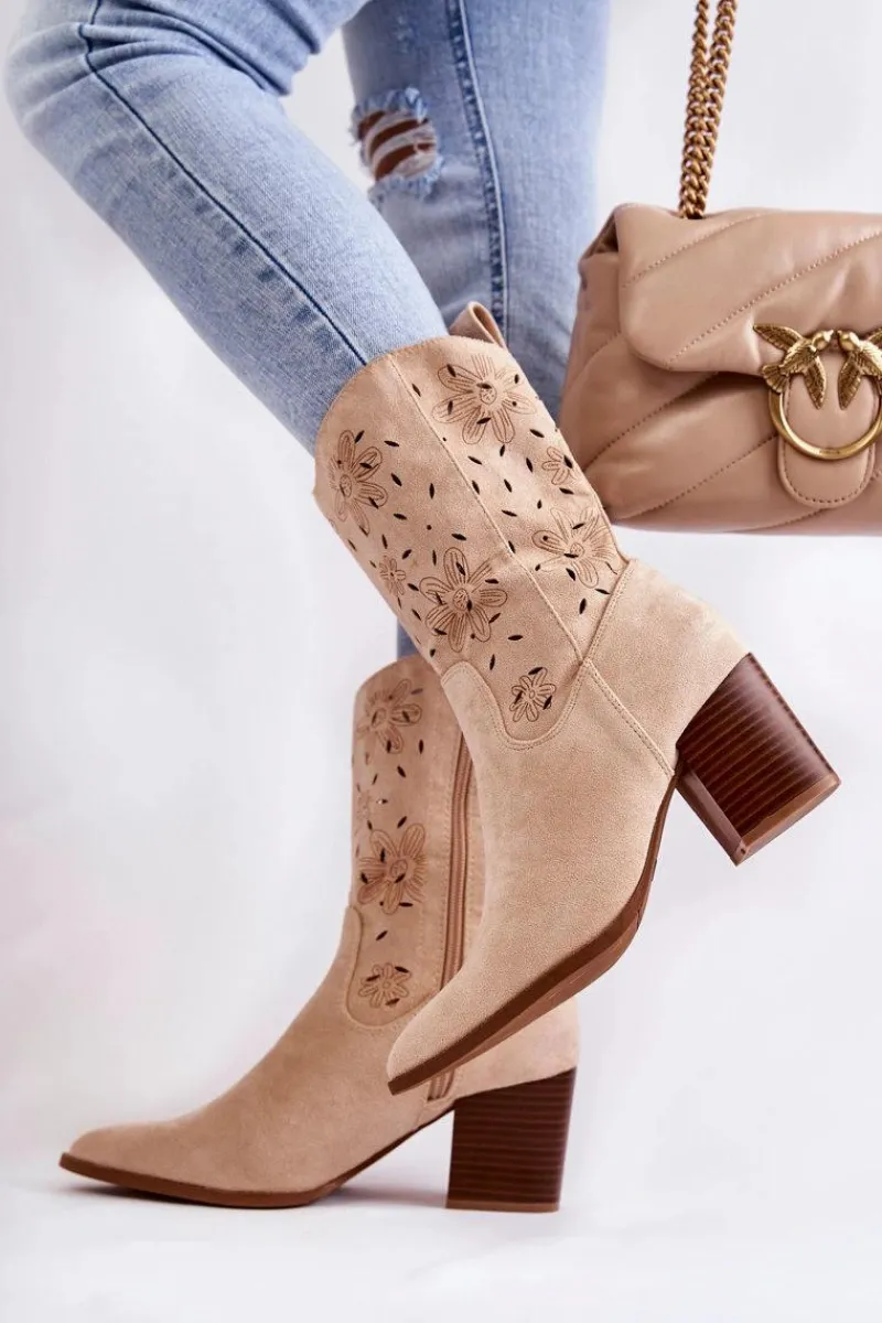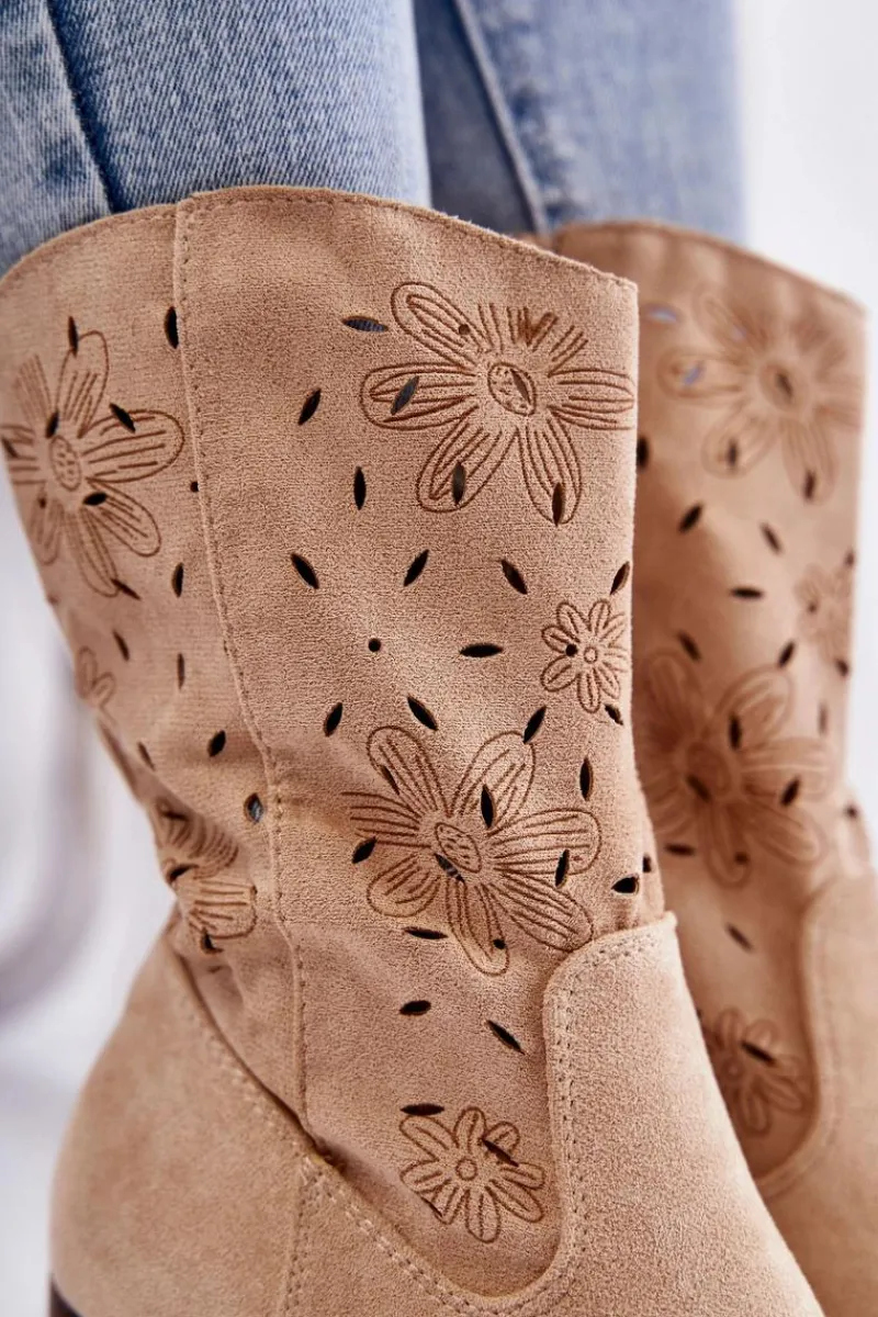 Botki Wiosenne|Botki Na Słupku>Boto Damskie Zamszowe Botki Kowbojki W Kwiaty Beżowe Ariane