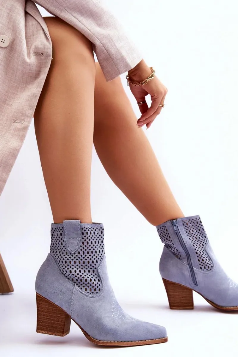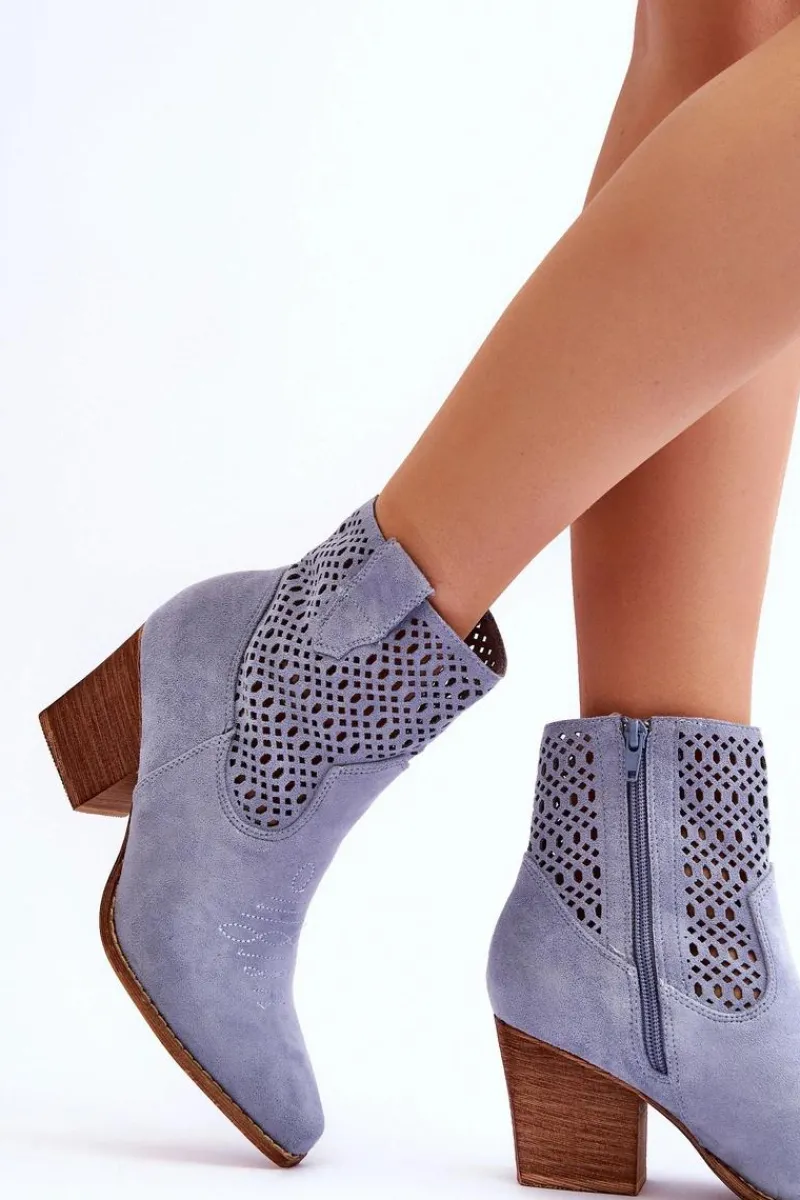Wyjątkowe botki w stylu kowbojskim z cholewką za kostkę. Botki wykonane zostały z ekologicznego zamszu z ażurowym wzorem i przeszyciem na przodzie. Materiałowa wkładka oraz stabilny obcas w postaci słupka zadbają o Twój komfort. Botki z pewnością dopełnią wiele Twoich stylizacji. Koniecznie sprawdź całą naszą kolekcję kowbojek! Przy wyborze rozmiaru prosimy sugerować się tabelą rozmiarów.