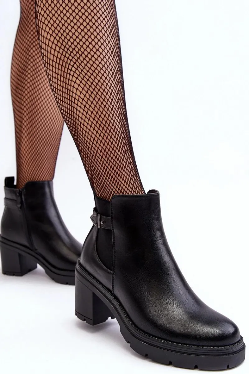 Damskie botki zostały wykonane z eko skóry. Osadzone na obcasie w postaci stabilnego, masywnego słupka. Cholewka została ozdobiona paskiem oraz elastyczną gumą pozwalającą na odpowiednie dopasowanie obuwia do tęgości nogi. Wewnątrz botki nie posiadają ocieplenia. Dodatkowo zapiętek jest usztywniony. Model ten posiada suwak z boku cholewki. Przy wyborze rozmiaru prosimy sugerować się tabelą rozmiarów.