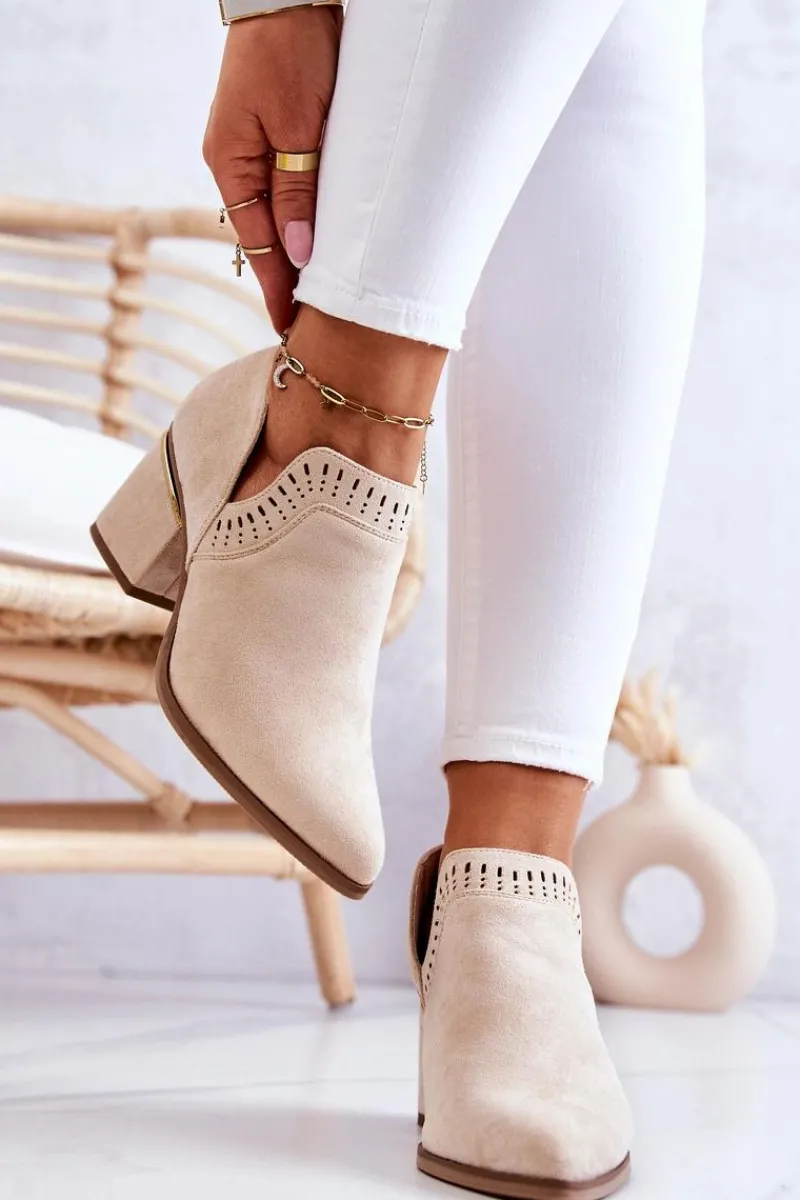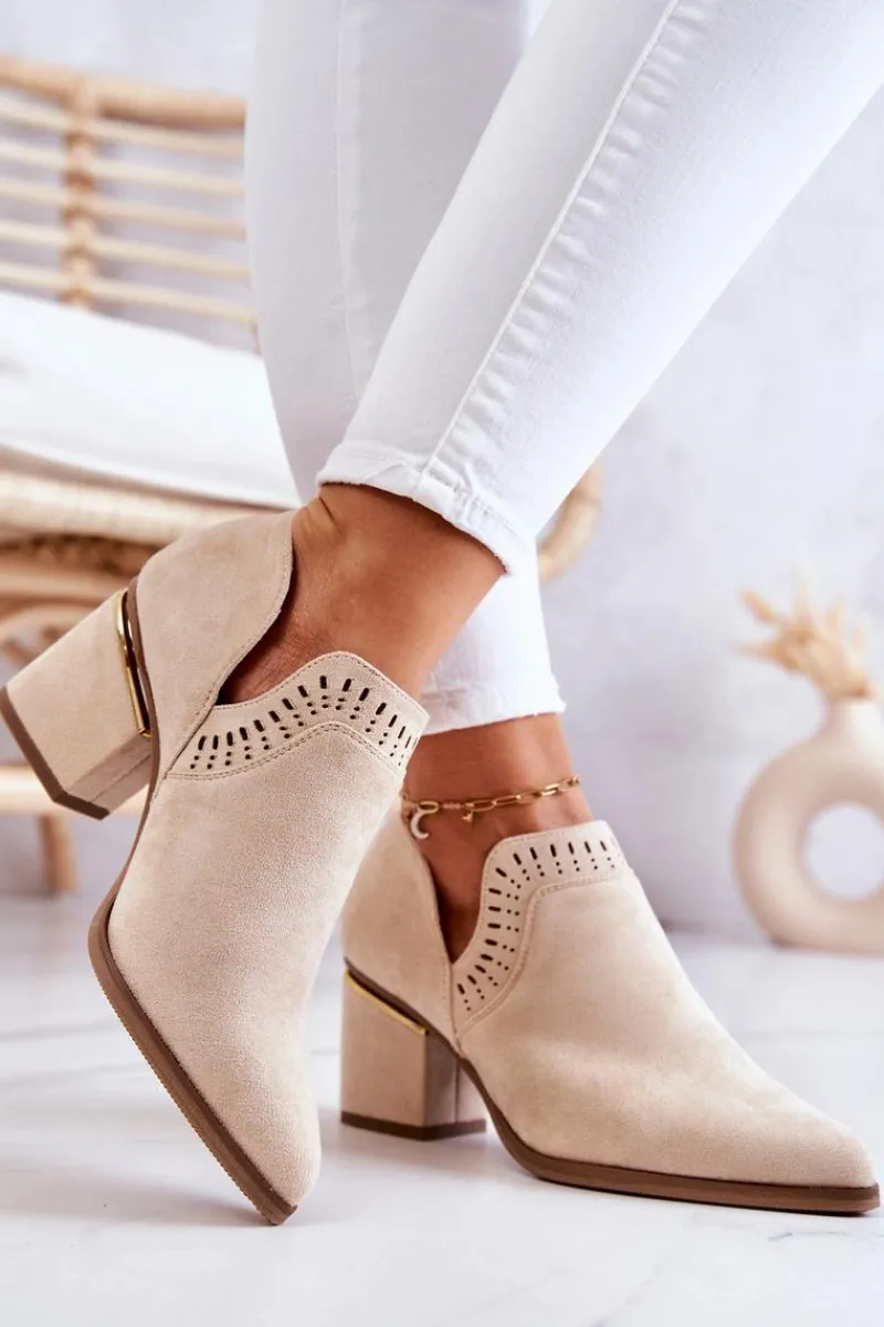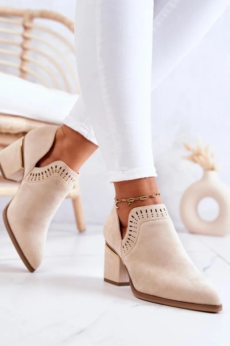 Modny fason w stylu kowbojek wykonane z eko zamszu w ażurowy wzorek. Buty posiadają nosek w szpic oraz stabilny obcas w postaci słupka. Botki idealnie wpasują się w wiosenno-letnie stylizacje. W środku posiadają eko skórzaną wkładkę. Koniecznie musisz je mieć! Przy wyborze rozmiaru prosimy sugerować się tabelą rozmiarów.