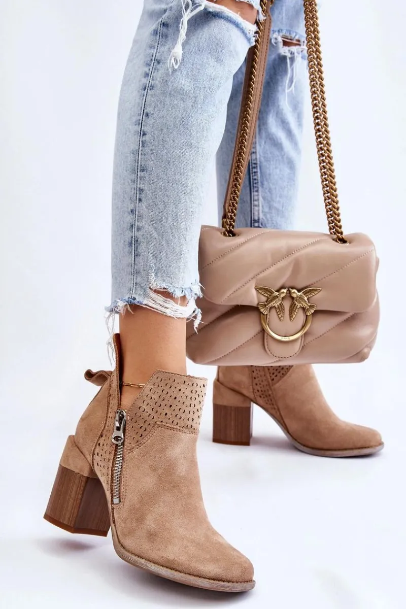 Modne botki na masywnym obcasie w postaci klocka zostały wykonane z eko zamszu z wycięciami po bokach cholewki. Dodatkowo zostały ozdobione ażurowym wzorkiem. Model ten posiada dodatkowy suwak z boku cholewki. Zapiętek w tych botkach jest usztywniany. Miękka i wygodna wkładka została wykonana z eko skóry. Powinnaś mieć ten model w swojej szafie! Przy wyborze rozmiaru prosimy sugerować się tabelą rozmiarów.