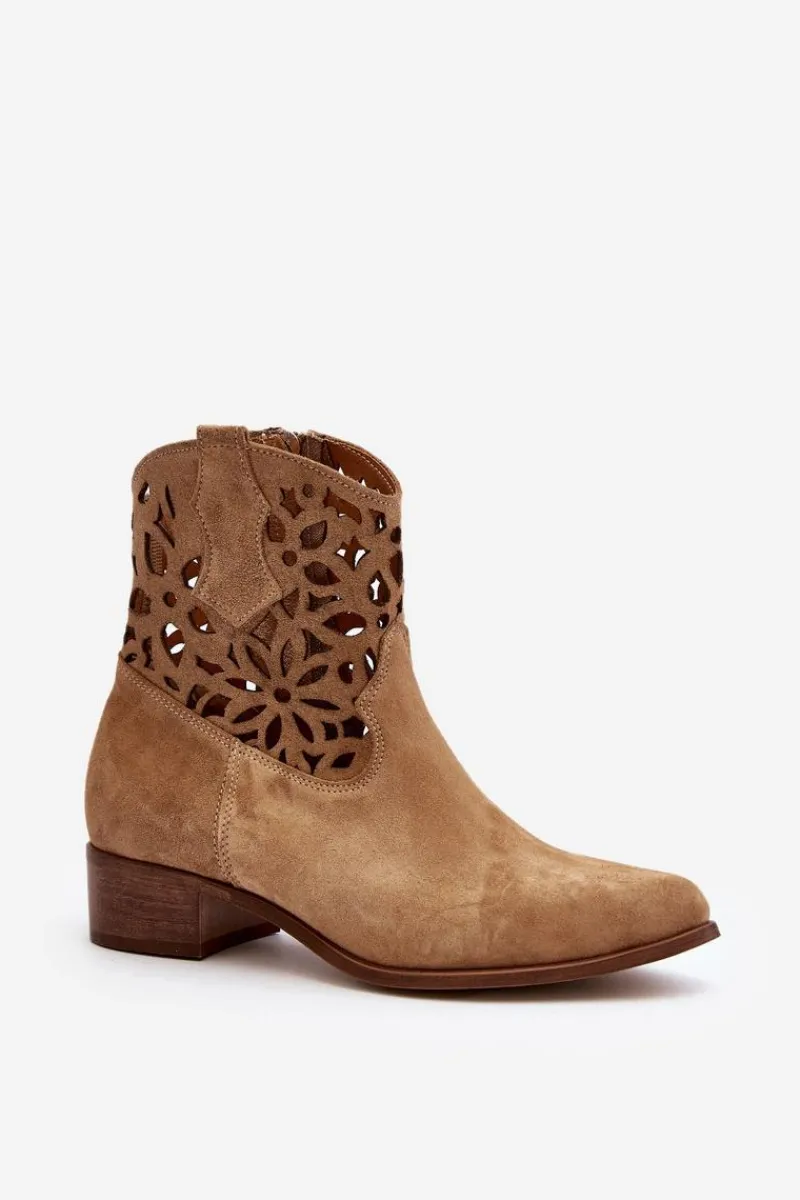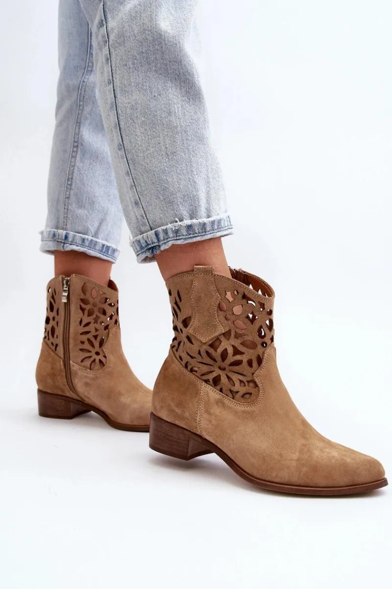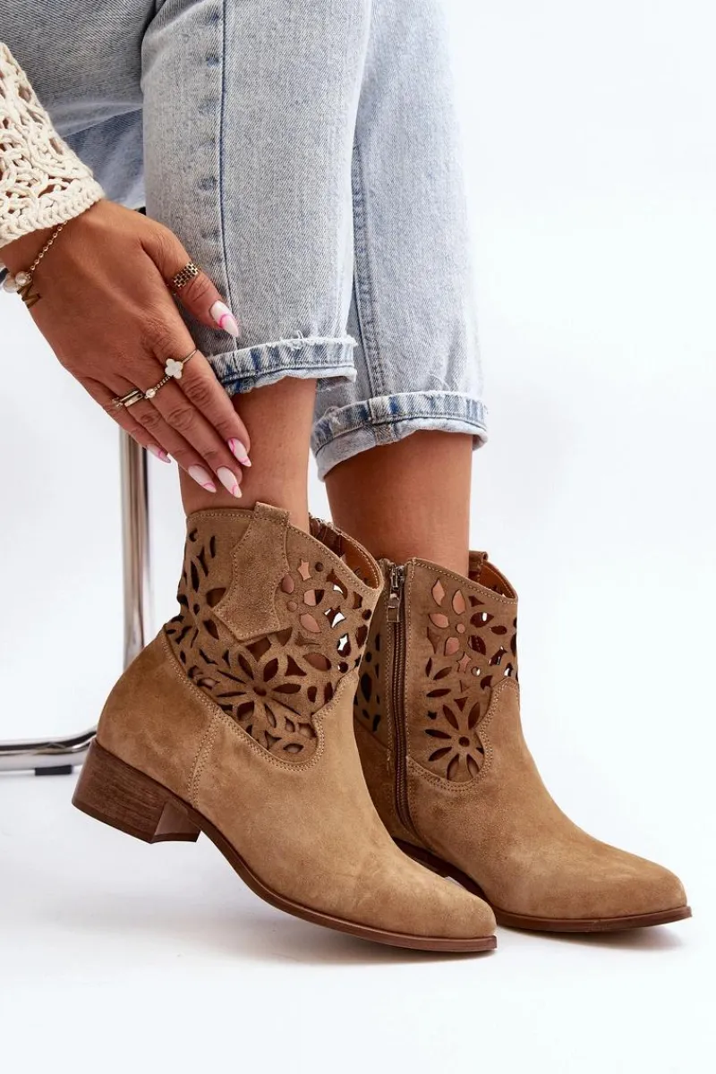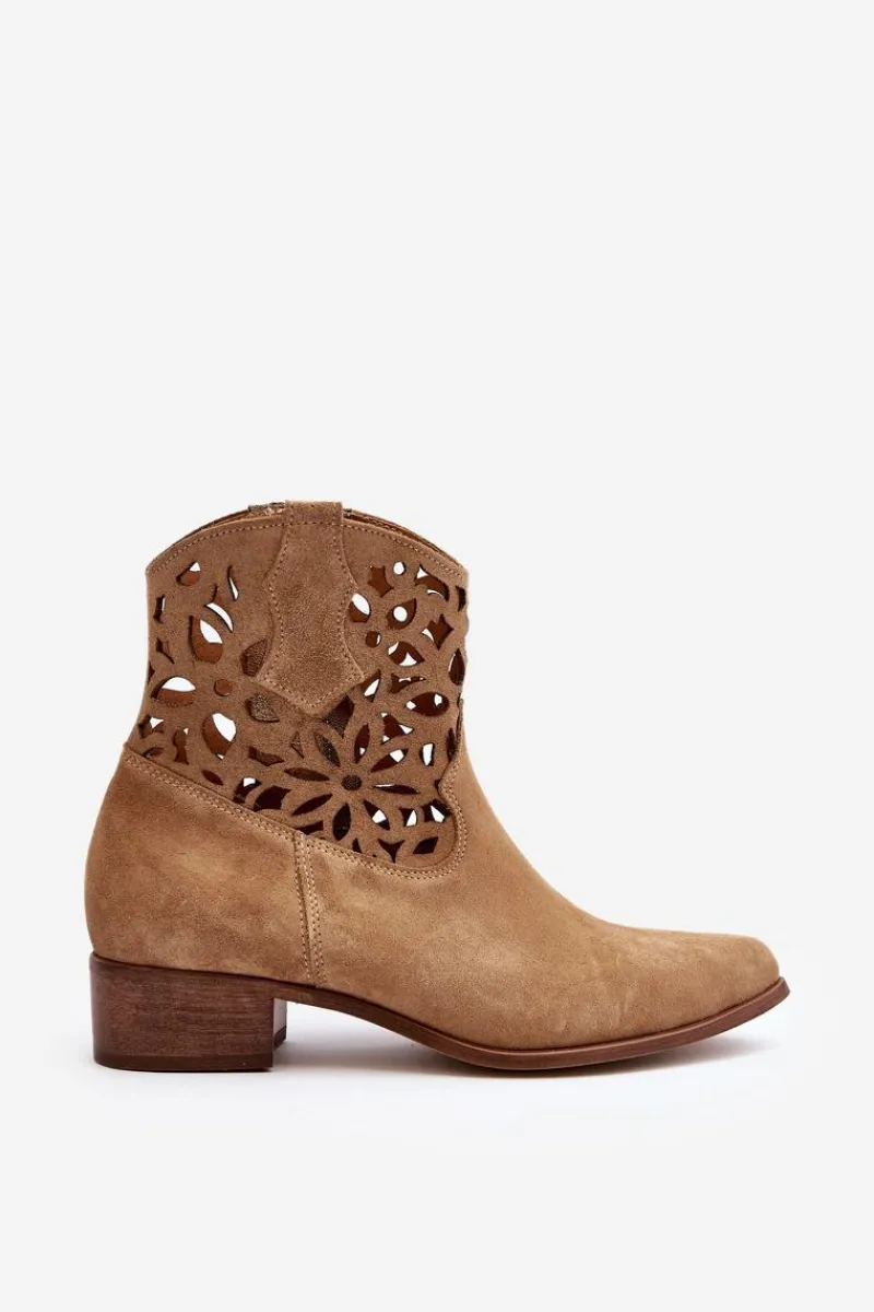 Botki damskie wykonane z naturalnego zamszu. Osadzone na niskim obcasie, co sprawia, że są zarówno stylowe, jak i wygodne. Ażurowy wzorek na cholewce dodaje im elegancji. Model ten zapiany jest na zamek, co ułatwia zakładanie obuwia. Miękka wkładka gwarantuje komfort noszenia. Przy wyborze rozmiaru prosimy sugerować się tabelą rozmiarów.