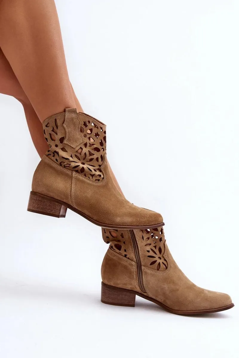 Botki damskie wykonane z naturalnego zamszu. Osadzone na niskim obcasie, co sprawia, że są zarówno stylowe, jak i wygodne. Ażurowy wzorek na cholewce dodaje im elegancji. Model ten zapiany jest na zamek, co ułatwia zakładanie obuwia. Miękka wkładka gwarantuje komfort noszenia. Przy wyborze rozmiaru prosimy sugerować się tabelą rozmiarów.