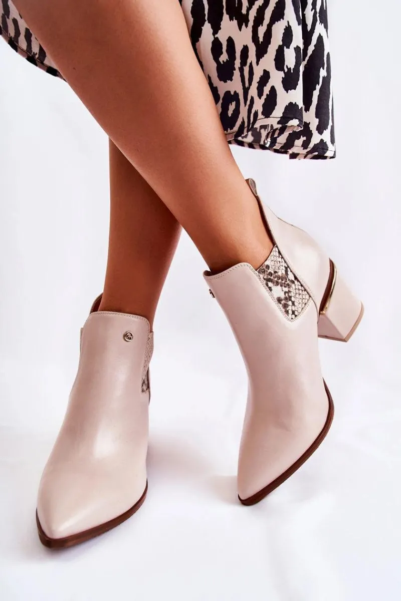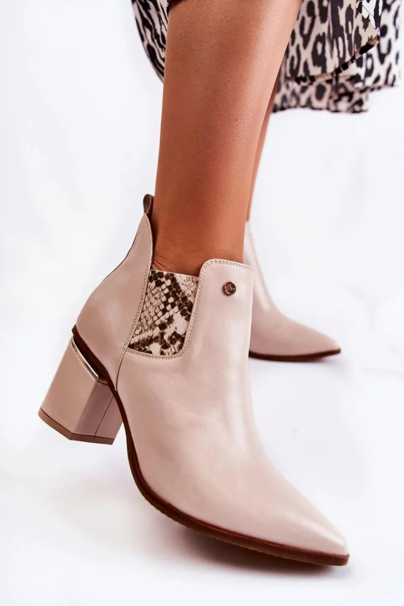Eleganckie botki świetnie sprawdzą się podczas tworzenia stylizacji w chłodniejsze dni. Botki są wsuwane, z elastycznymi gumkami po bokach cholewki. W całości wykonane ze skóry naturalnej. Atutami tych botków jest przede wszystkim komfort noszenia oraz wysoka jakość wykonania. Dodatkowo posiadają usztywniany zapiętek oraz ozdobny obcas w postaci słupka. Przy wyborze rozmiaru prosimy sugerować się tabelą rozmiarów.