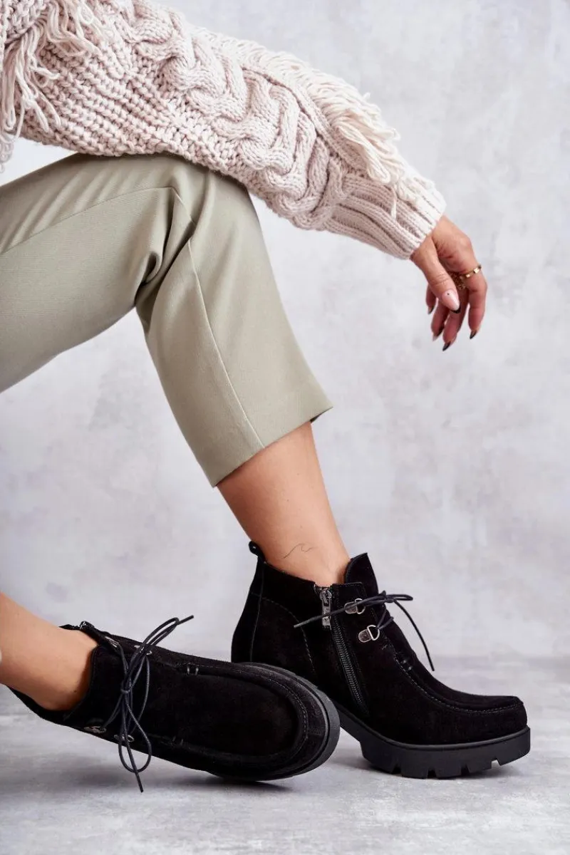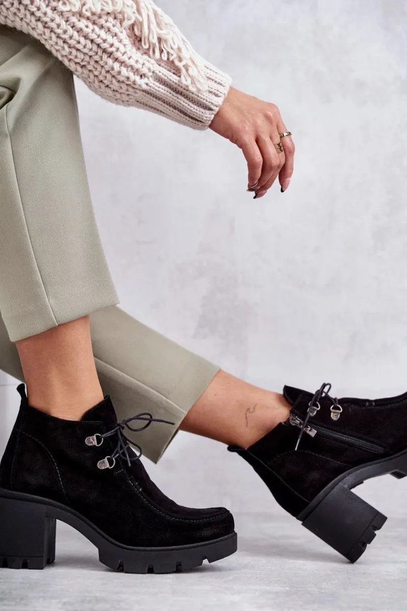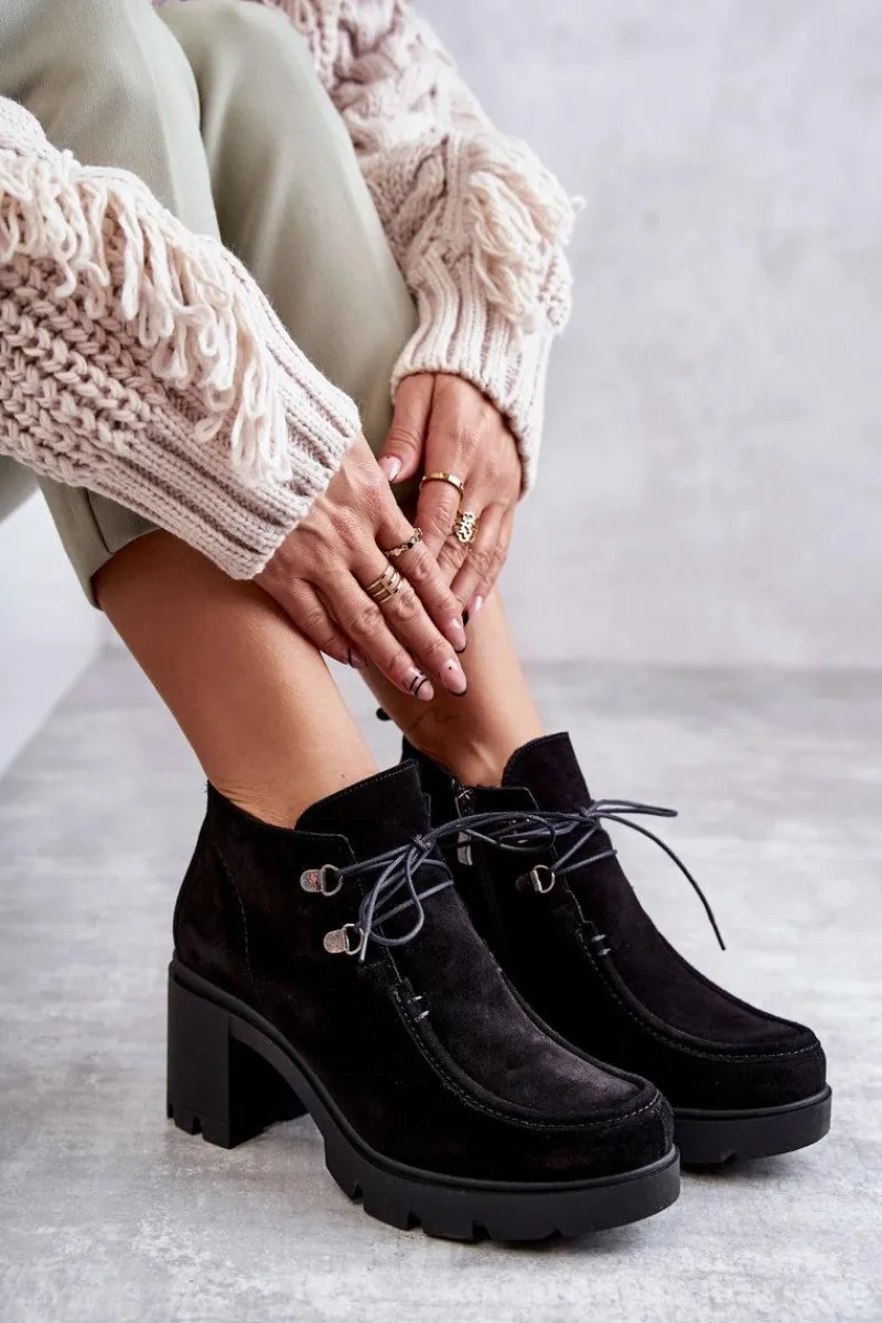 Botki o fasonie trzewików posiadające cholewkę sięgającą powyżej kostki. Gruby, stabilny obcas oraz okrągły nosek. Wiązane na cienkie, okrągłe sznurówki w dopasowanym do obuwia kolorze. Wykonane ze skóry naturalnej. Całość tworzy niebanalny charakter. Botki są ocieplane, z usztywnianym zapiętkiem. Posiadają suwak z boku cholewki ułatwiający zakładanie obuwia. Idealne do wielu stylizacji! Przy wyborze rozmiaru prosimy sugerować się tabelą rozmiarów.