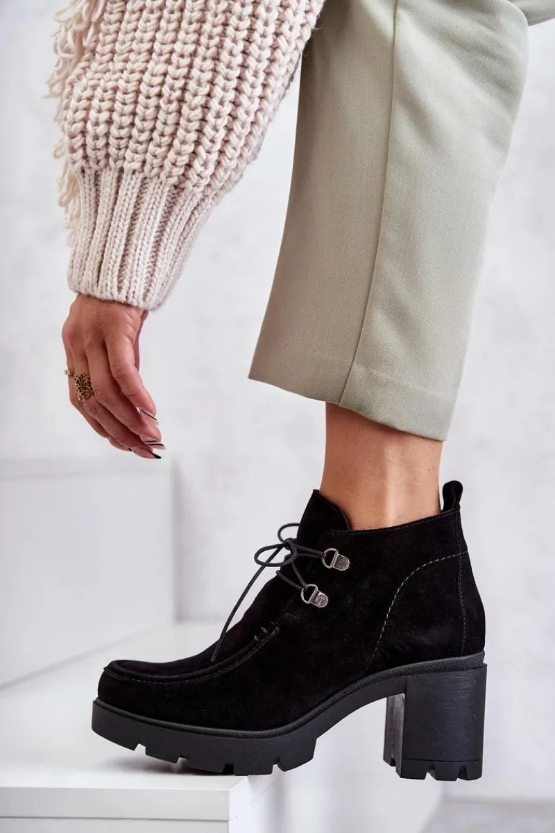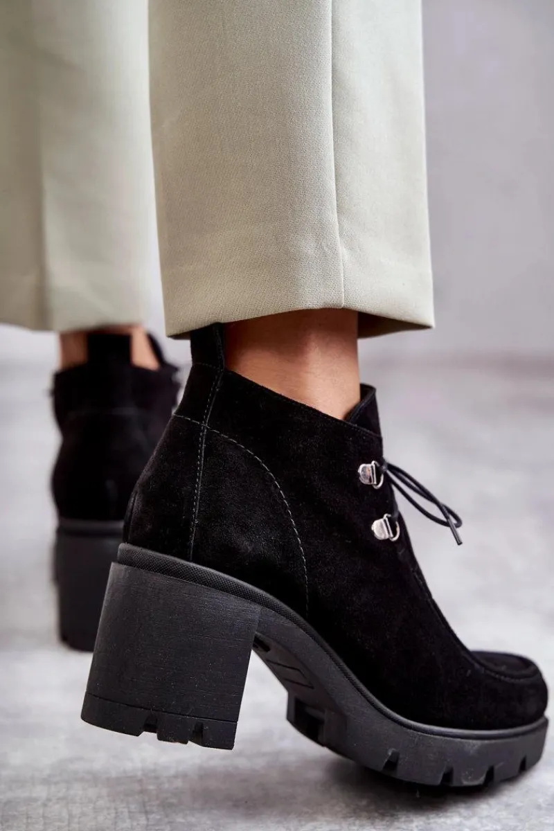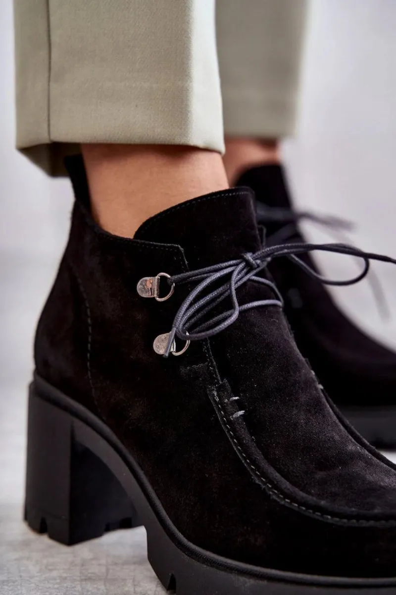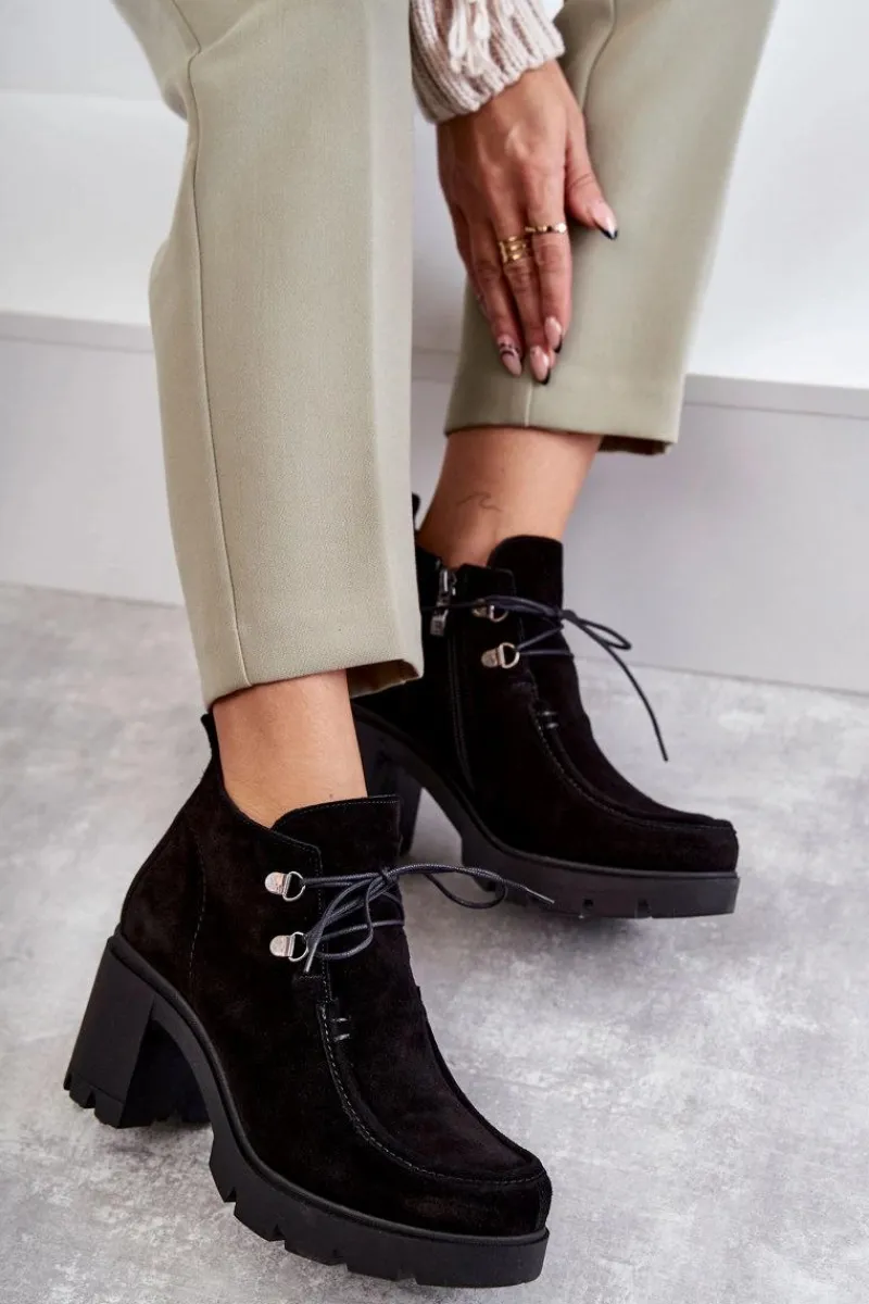 Botki o fasonie trzewików posiadające cholewkę sięgającą powyżej kostki. Gruby, stabilny obcas oraz okrągły nosek. Wiązane na cienkie, okrągłe sznurówki w dopasowanym do obuwia kolorze. Wykonane ze skóry naturalnej. Całość tworzy niebanalny charakter. Botki są ocieplane, z usztywnianym zapiętkiem. Posiadają suwak z boku cholewki ułatwiający zakładanie obuwia. Idealne do wielu stylizacji! Przy wyborze rozmiaru prosimy sugerować się tabelą rozmiarów.