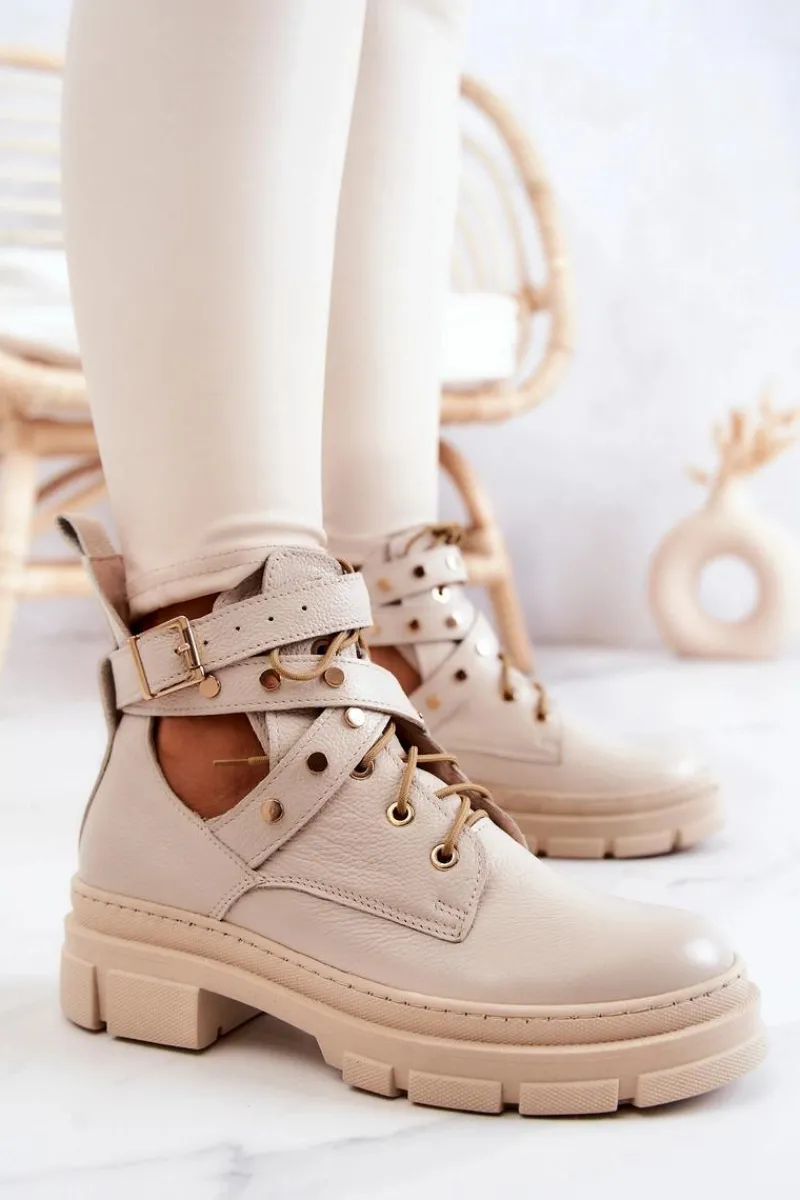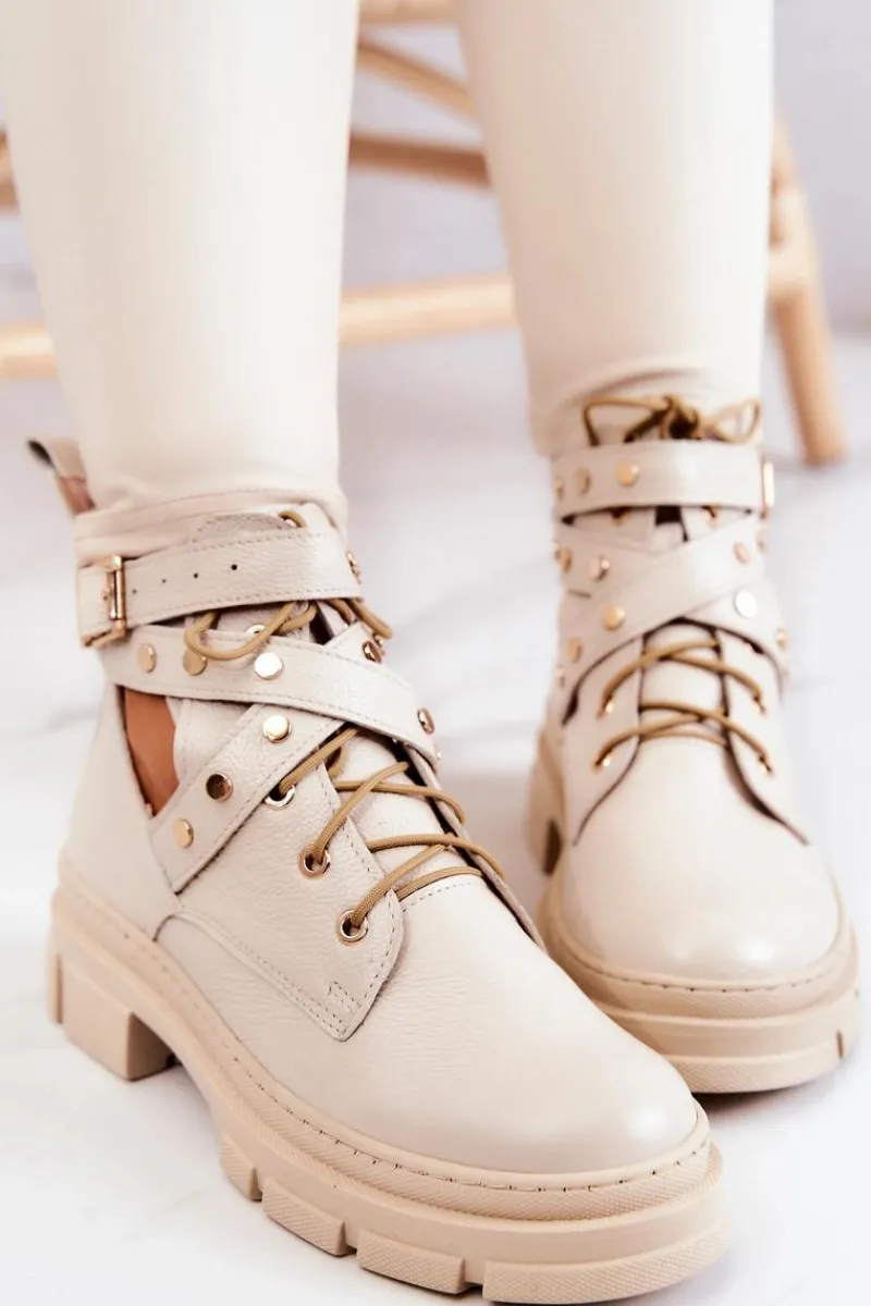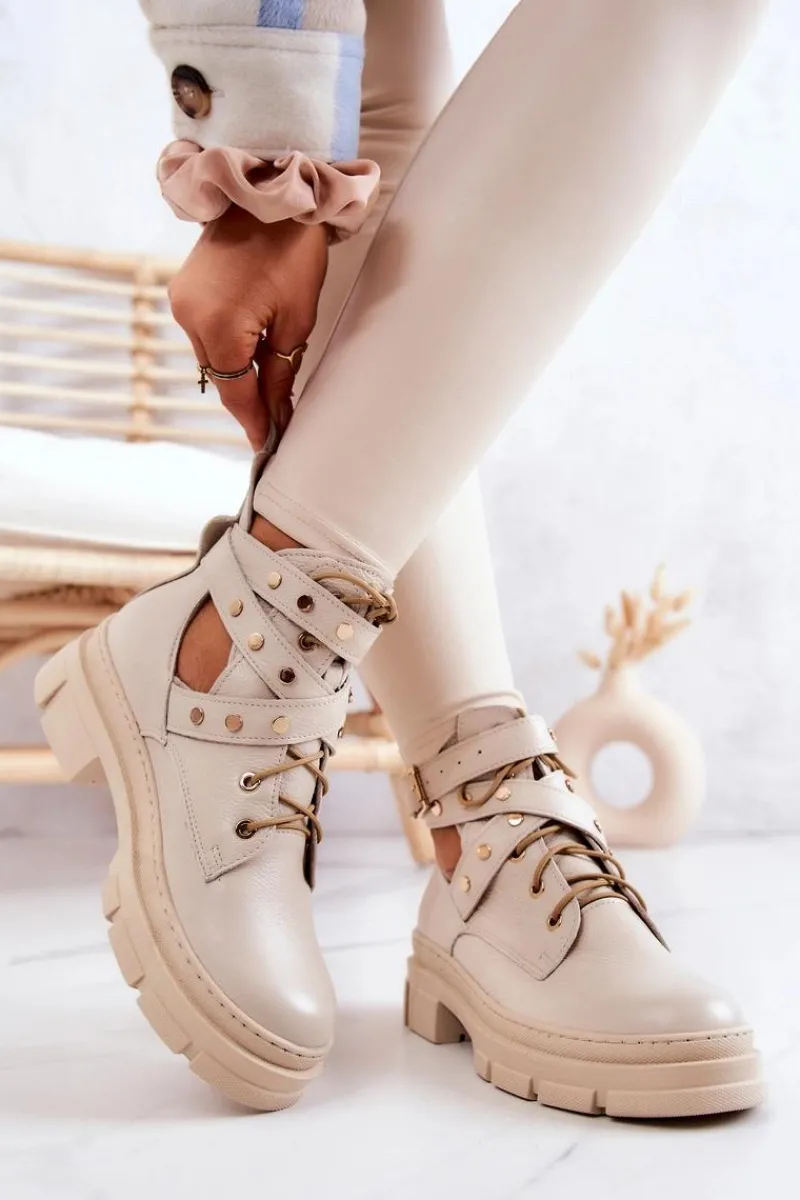Cudowne, wiosenne botki zostały wykonane z naturalnej skóry. Posiadają paseczek ozdobiony ćwiekami, który jest zapinany u góry cholewki na sprzączkę. Dodatkowo botki te posiadają wiązanie, dzięki któremu możesz odpowiednio dopasować buty do tęgości nogi. Z tyłu cholewki znajduje się bootstrap, czyli pętelka za pomocą której możesz łatwiej zakładać bądź zdejmować obuwie. Buty posiadają masywną podeszwę chroniąca przed zimnym podłożem. Przy wyborze rozmiaru prosimy sugerować się tabelą rozmiarów.