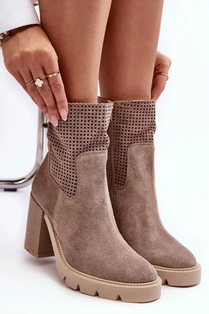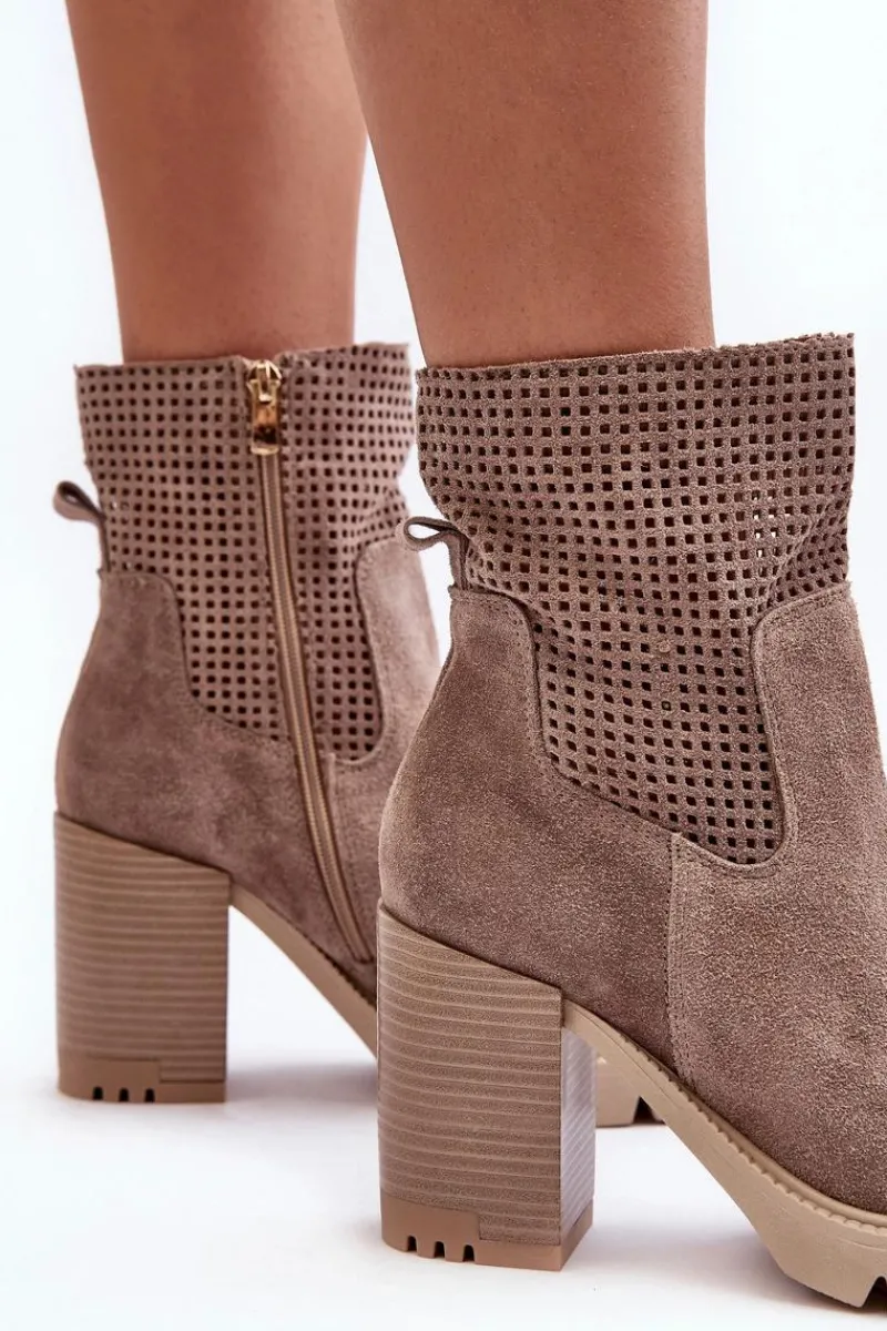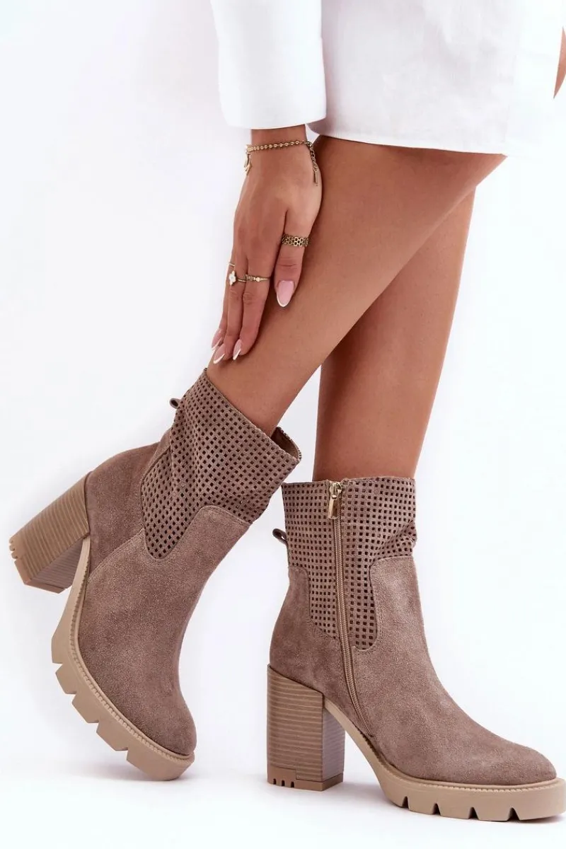 Modne, ażurowe botki na obcasie w postaci słupka zostały wykonane z wysokiej jakości skóry naturalnej. Zapinane na suwak z boku cholewki. Miękka, niezwykle wygodna wkładka została wykonana również z naturalnej skóry. Świetny model do wielu stylizacji! Przy wyborze rozmiaru prosimy sugerować się tabelą rozmiarów.