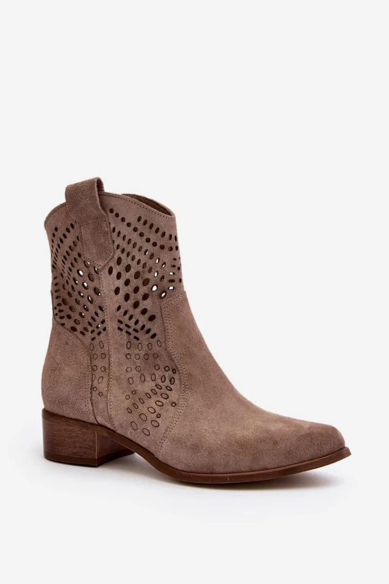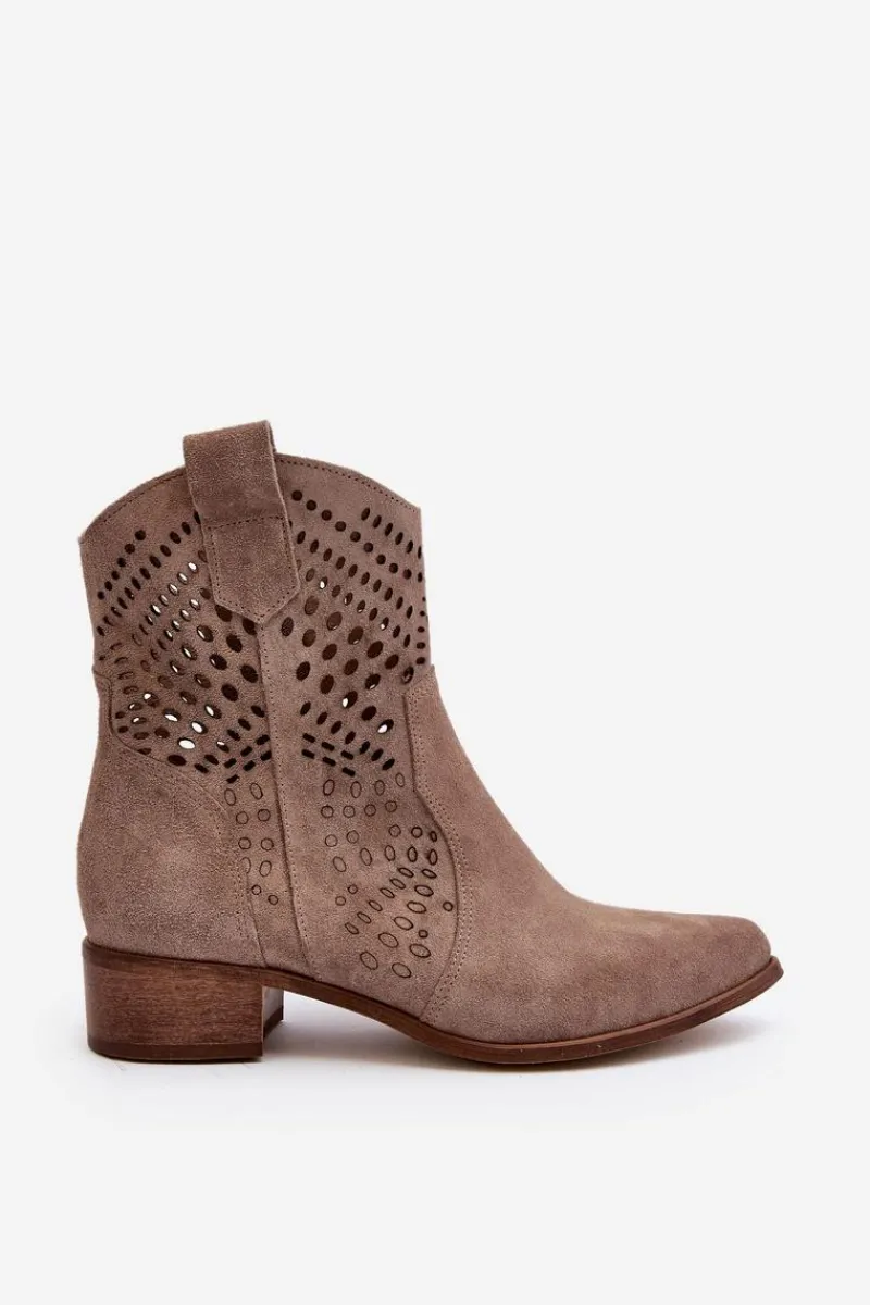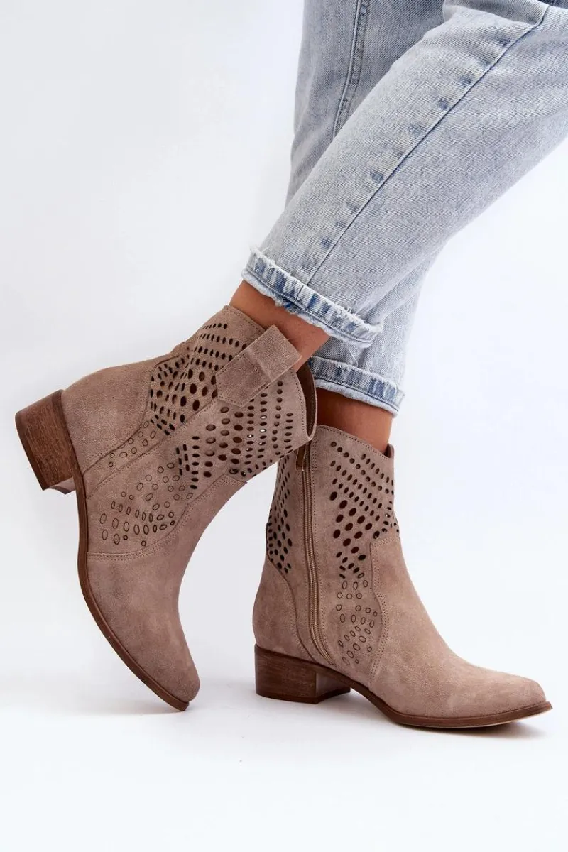 Botki damskie to doskonały wybór na sezon jesienno-zimowy! Wykonane z naturalnego zamszu. Osadzone na niskim obcasie. Ażurowy wzorek na cholewce dodaje im elegancji. Model ten zapinany jest na zamek. Miękka wkładka gwarantuje komfort noszenia. Przy wyborze rozmiaru prosimy sugerować się tabelą rozmiarów.